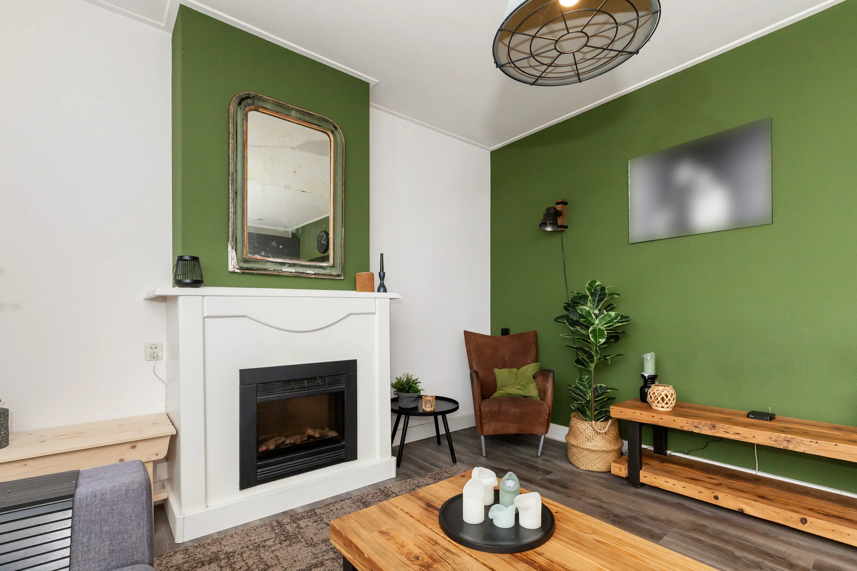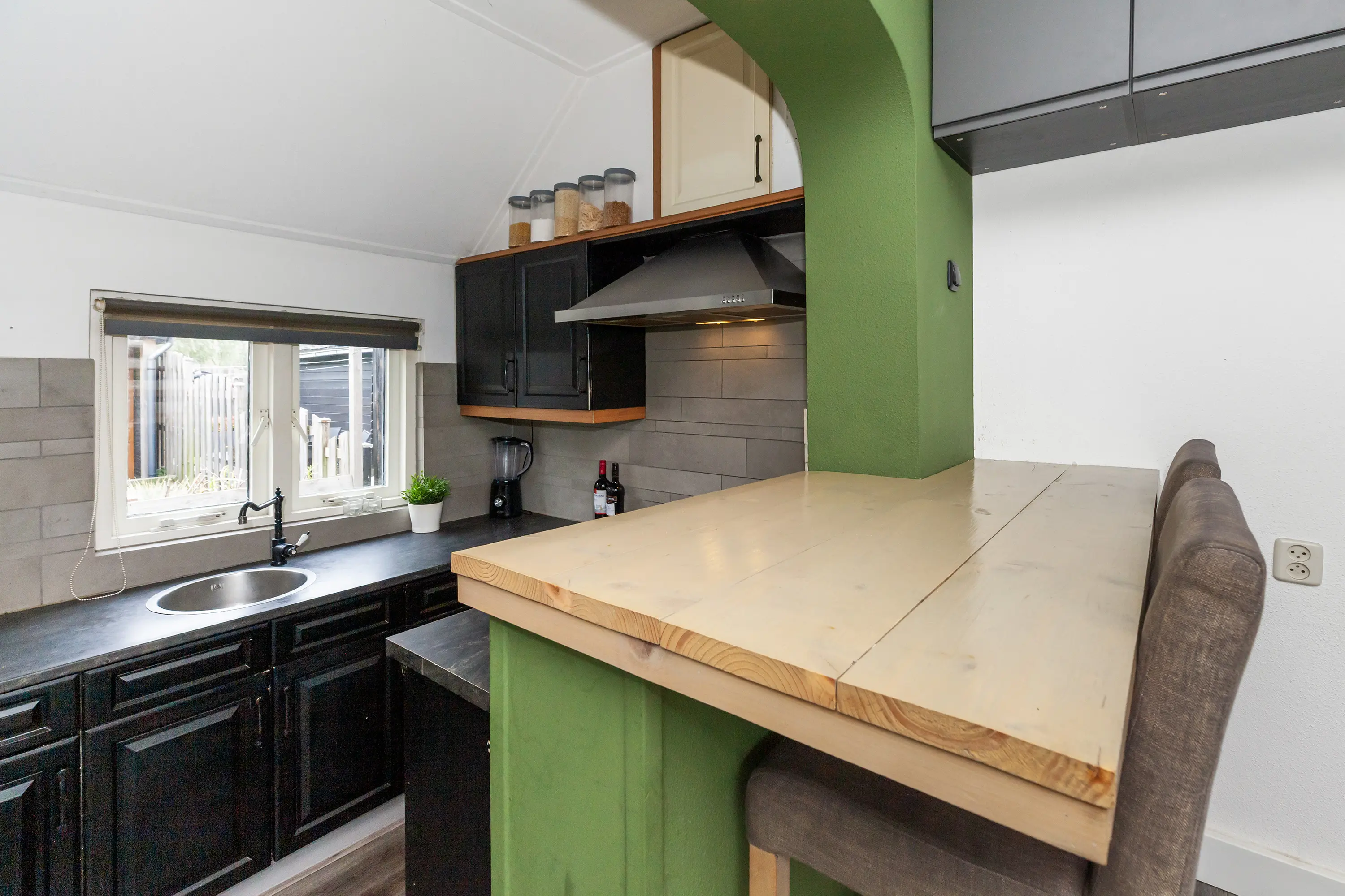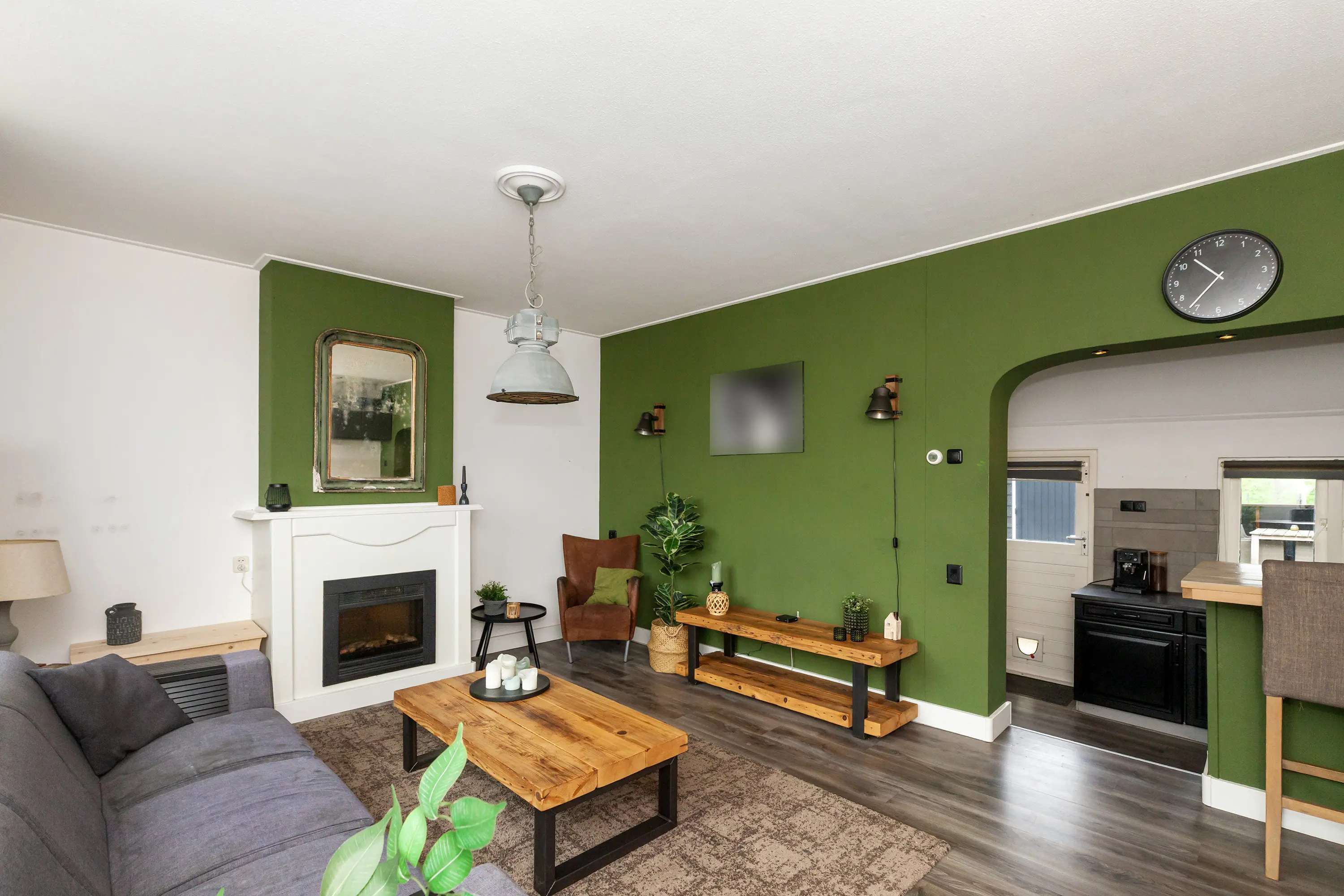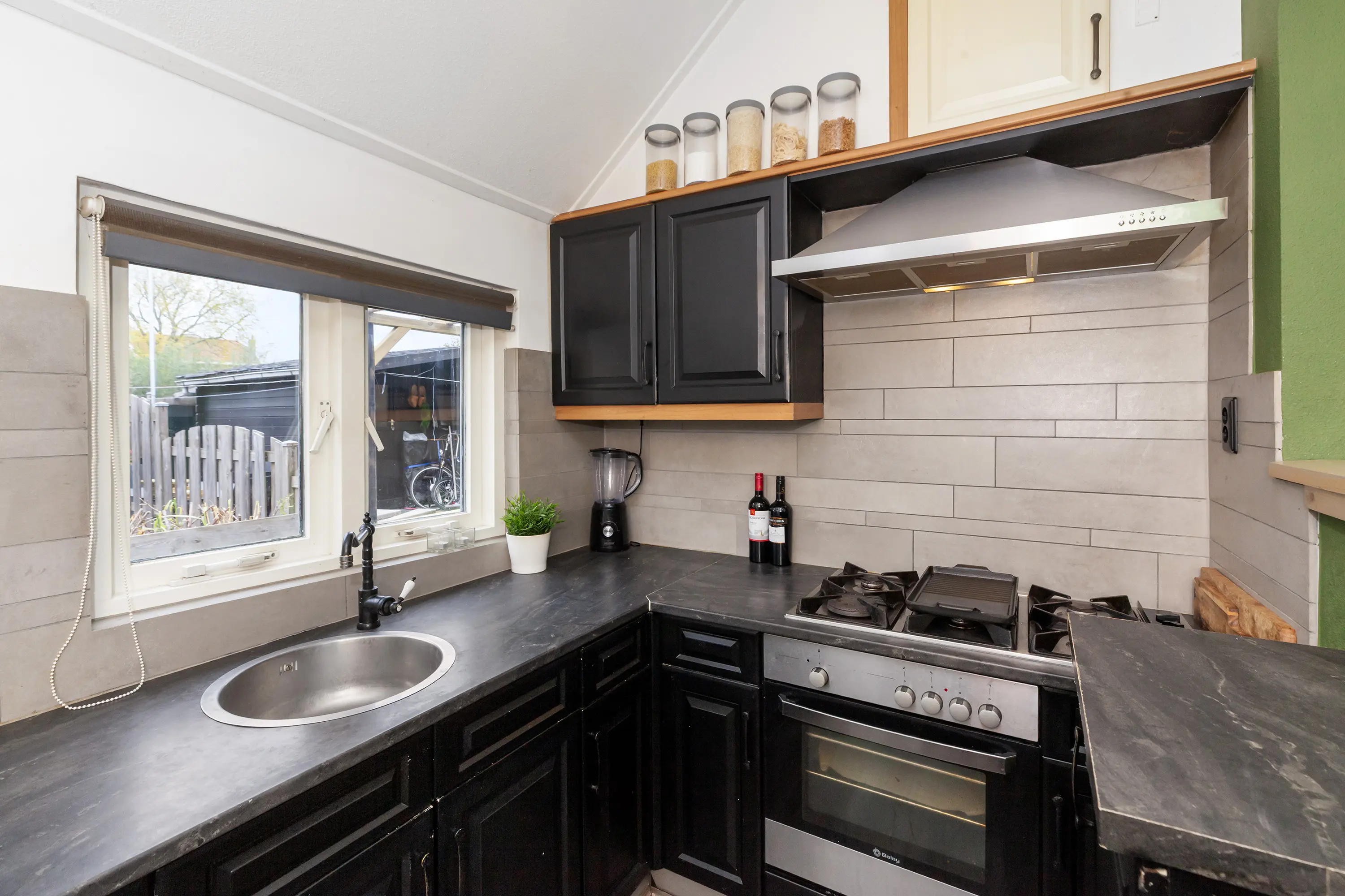 Begane grond: Entree, meterkast, woonkamer met laminaat, schouw en eetbar. Keuken met oven en 6-pits gaskookplaat en afzuigkap. Badkamer met douche, wastafel, toilet en wasmachine/droger aansluiting.