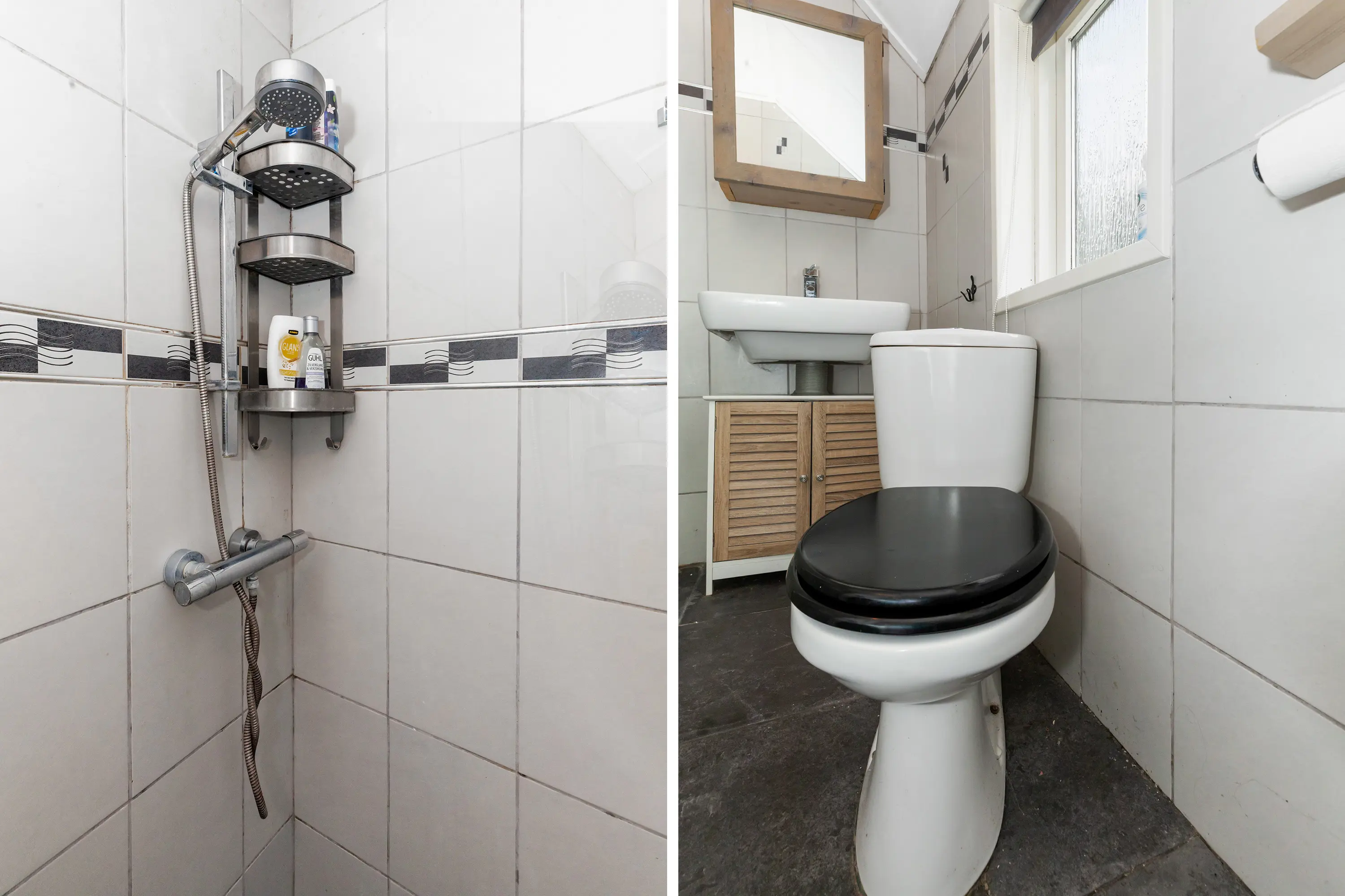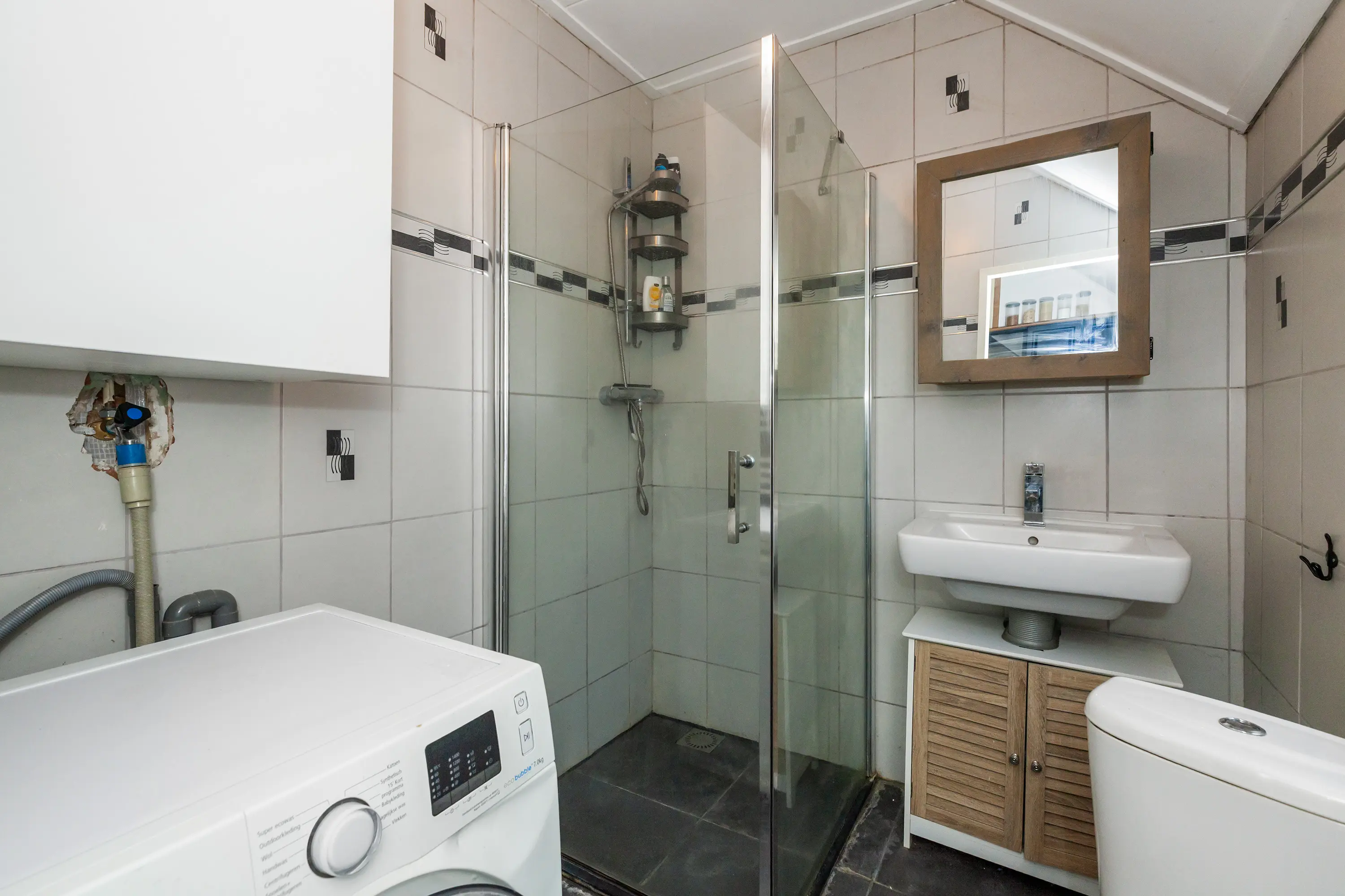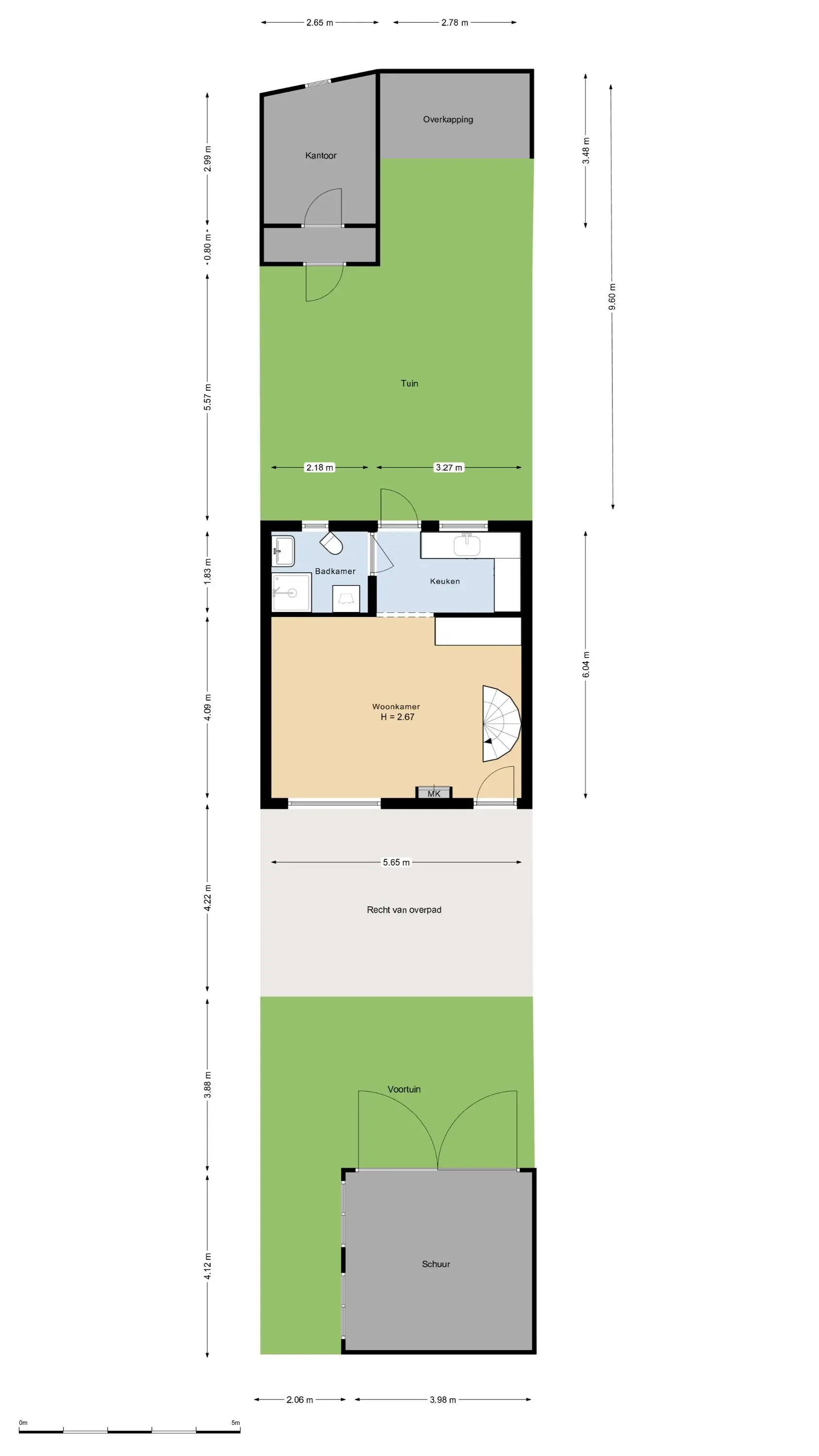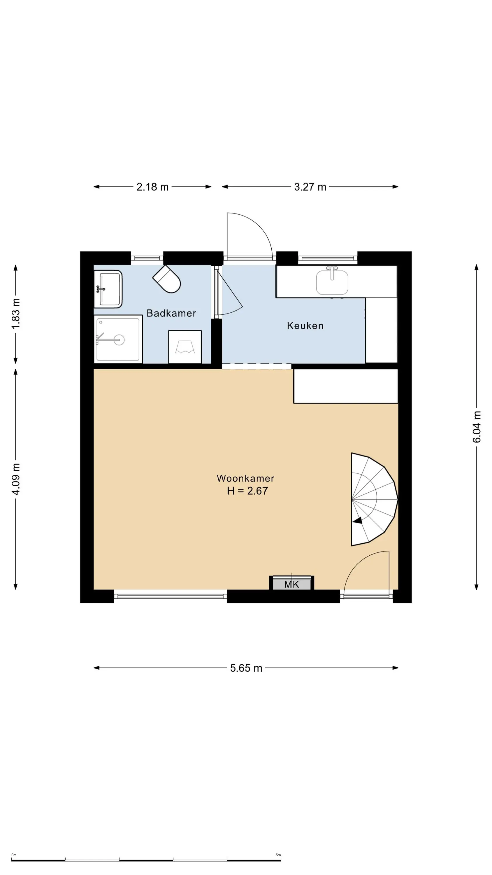 Begane grond: Entree, meterkast, woonkamer met laminaat, schouw en eetbar. Keuken met oven en 6-pits gaskookplaat en afzuigkap. Badkamer met douche, wastafel, toilet en wasmachine/droger aansluiting.
