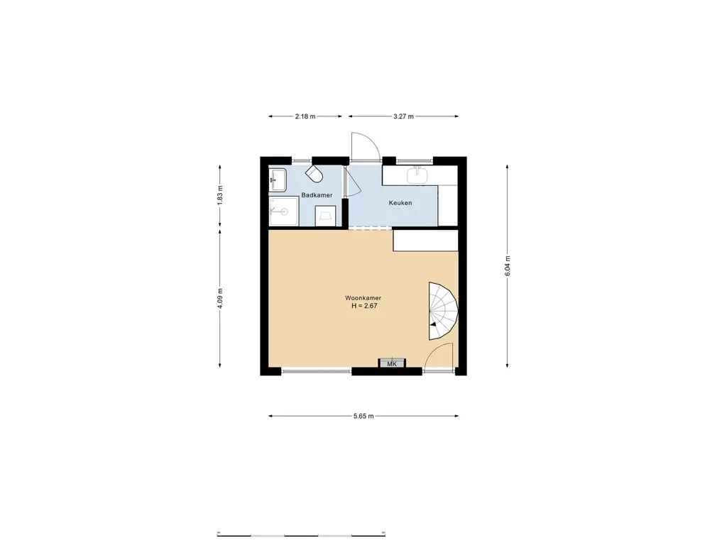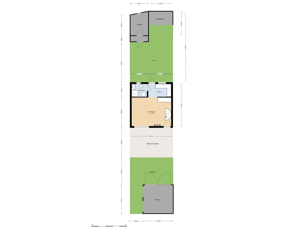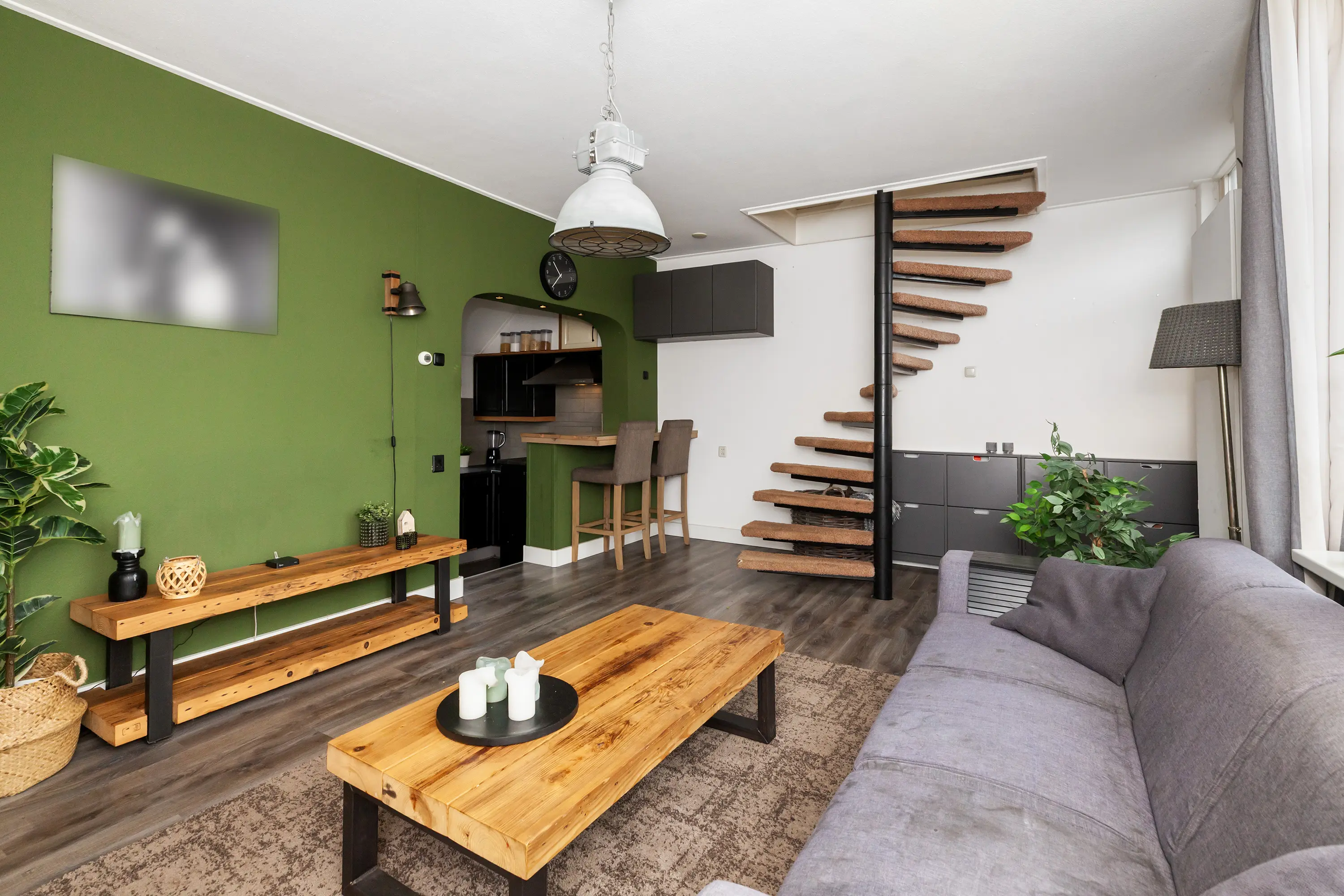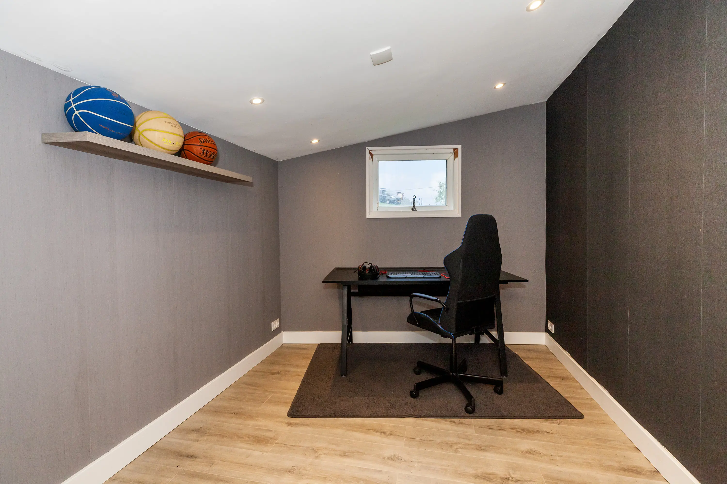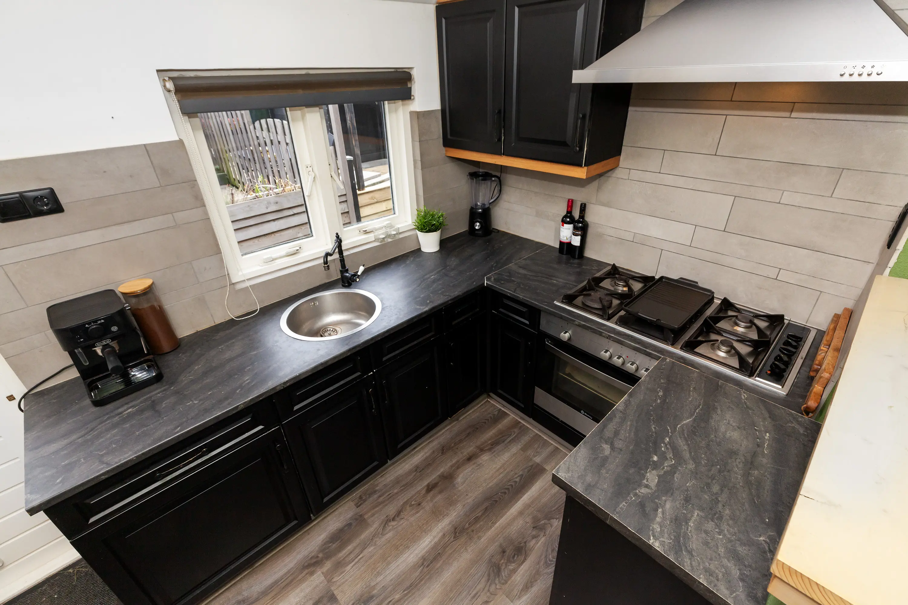 Begane grond: Entree, meterkast, woonkamer met laminaat, schouw en eetbar. Keuken met oven en 6-pits gaskookplaat en afzuigkap. Badkamer met douche, wastafel, toilet en wasmachine/droger aansluiting.