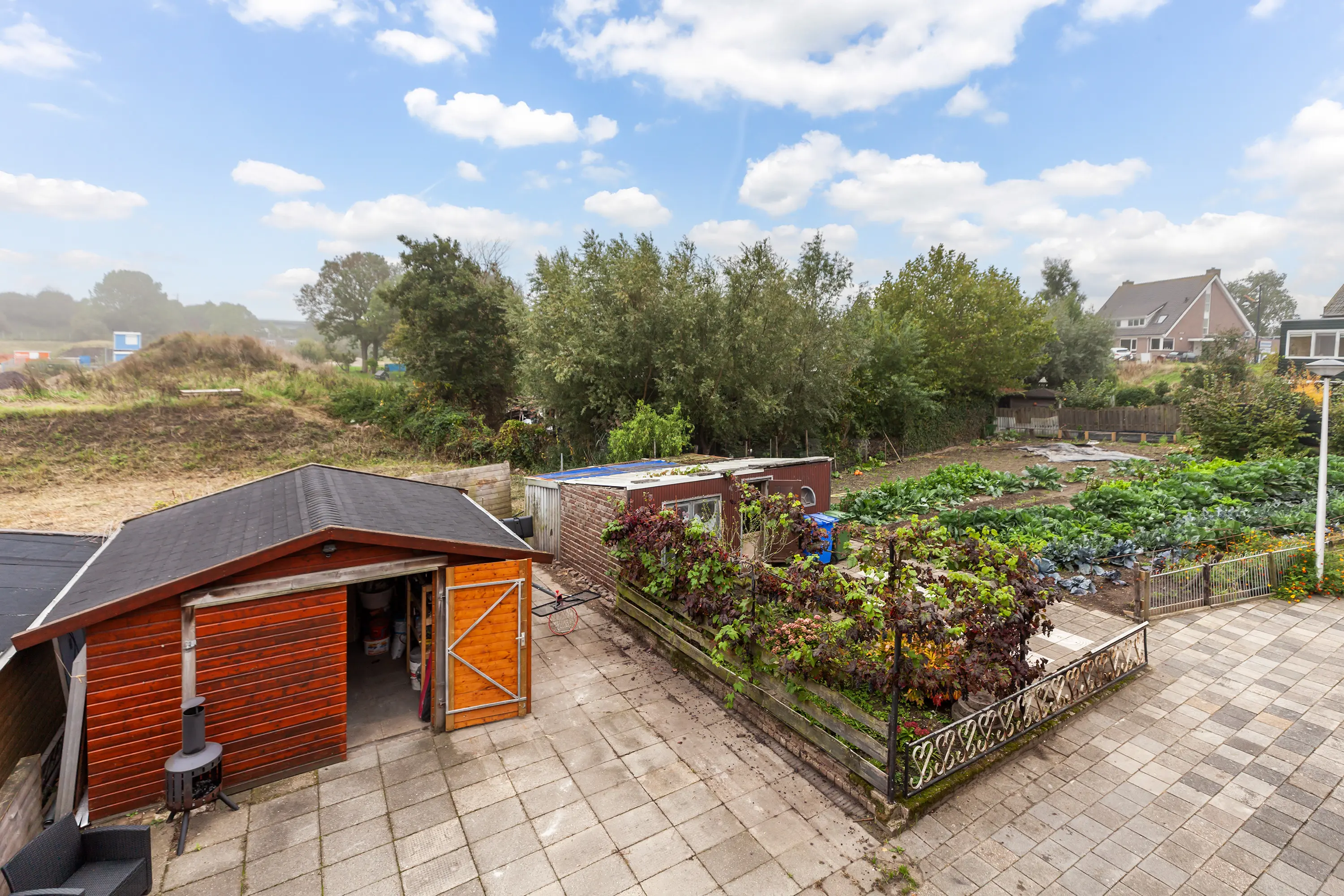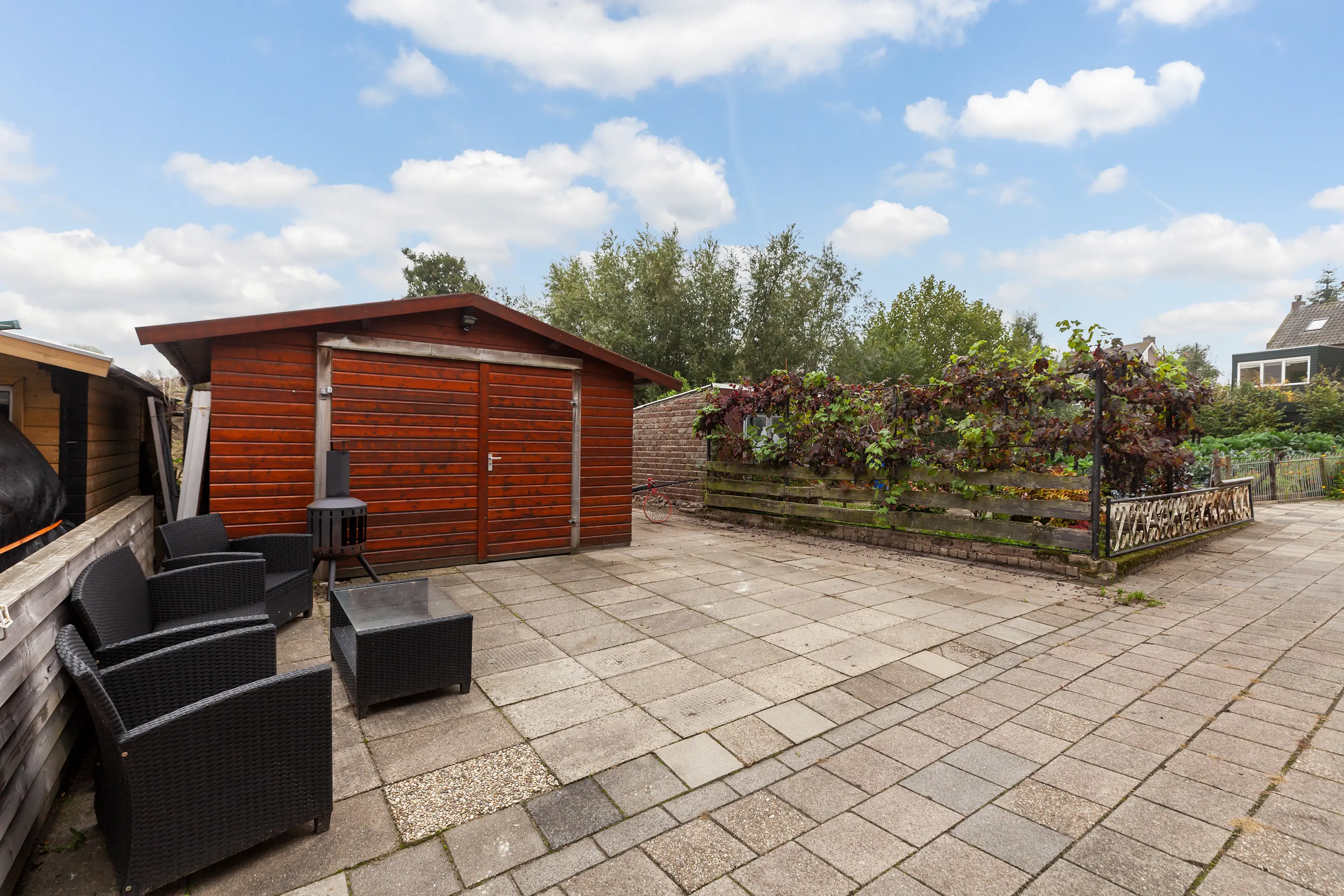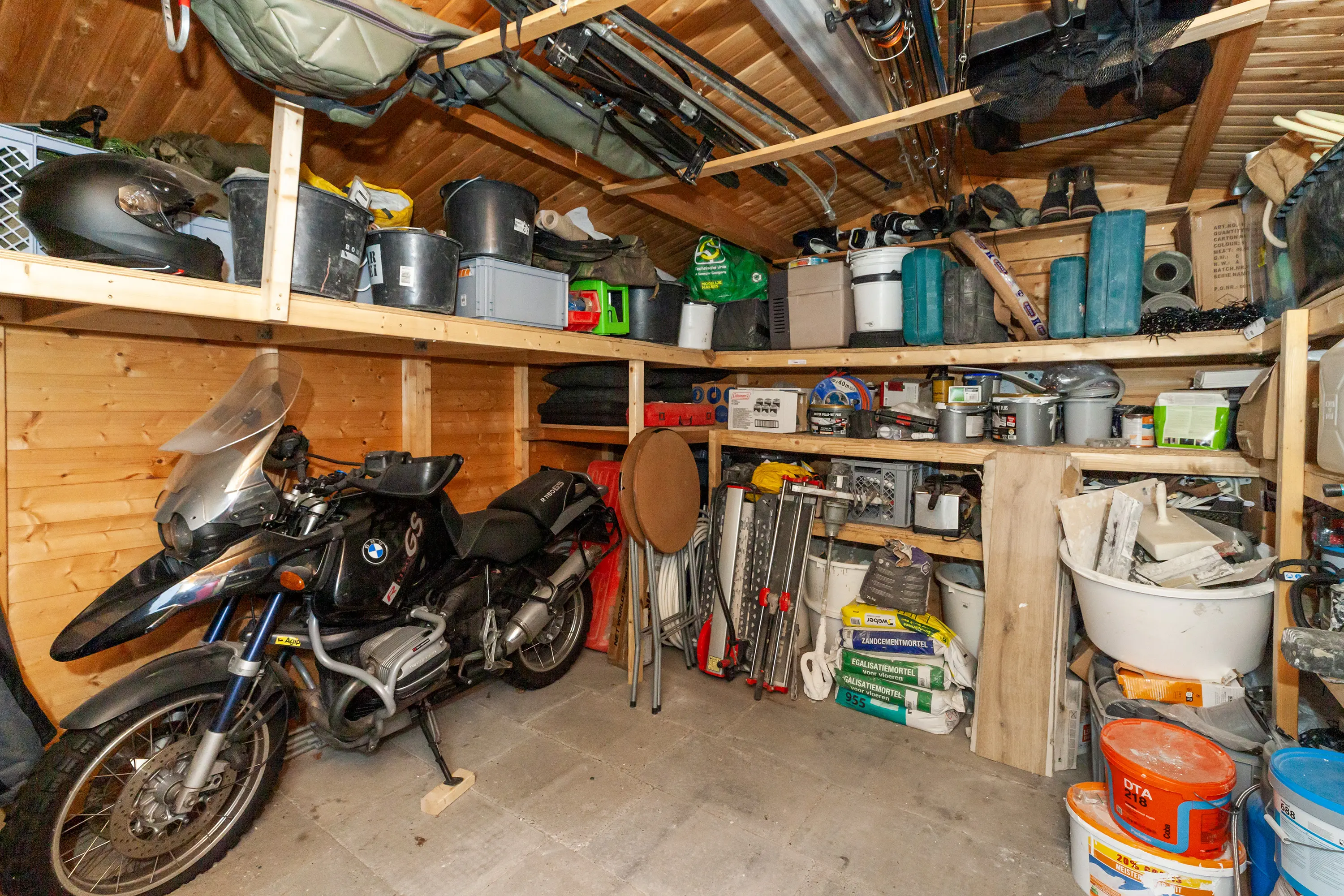 Tuinen: Voortuin aan pad met grote houten schuur en tuin/parkeerplek op het Z-O , Achtertuin aan pad met overkapping en multifunctionele ruimte/berging