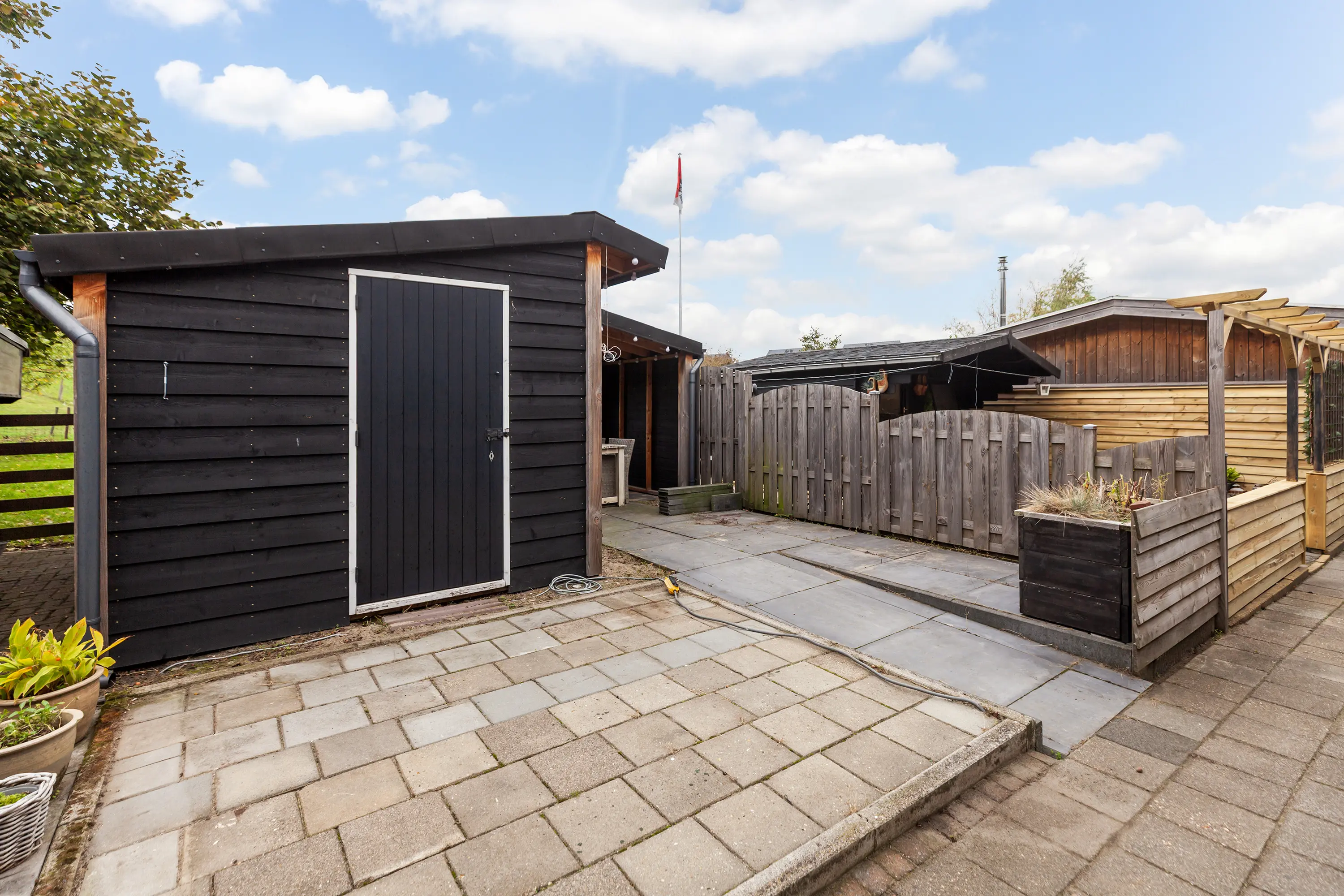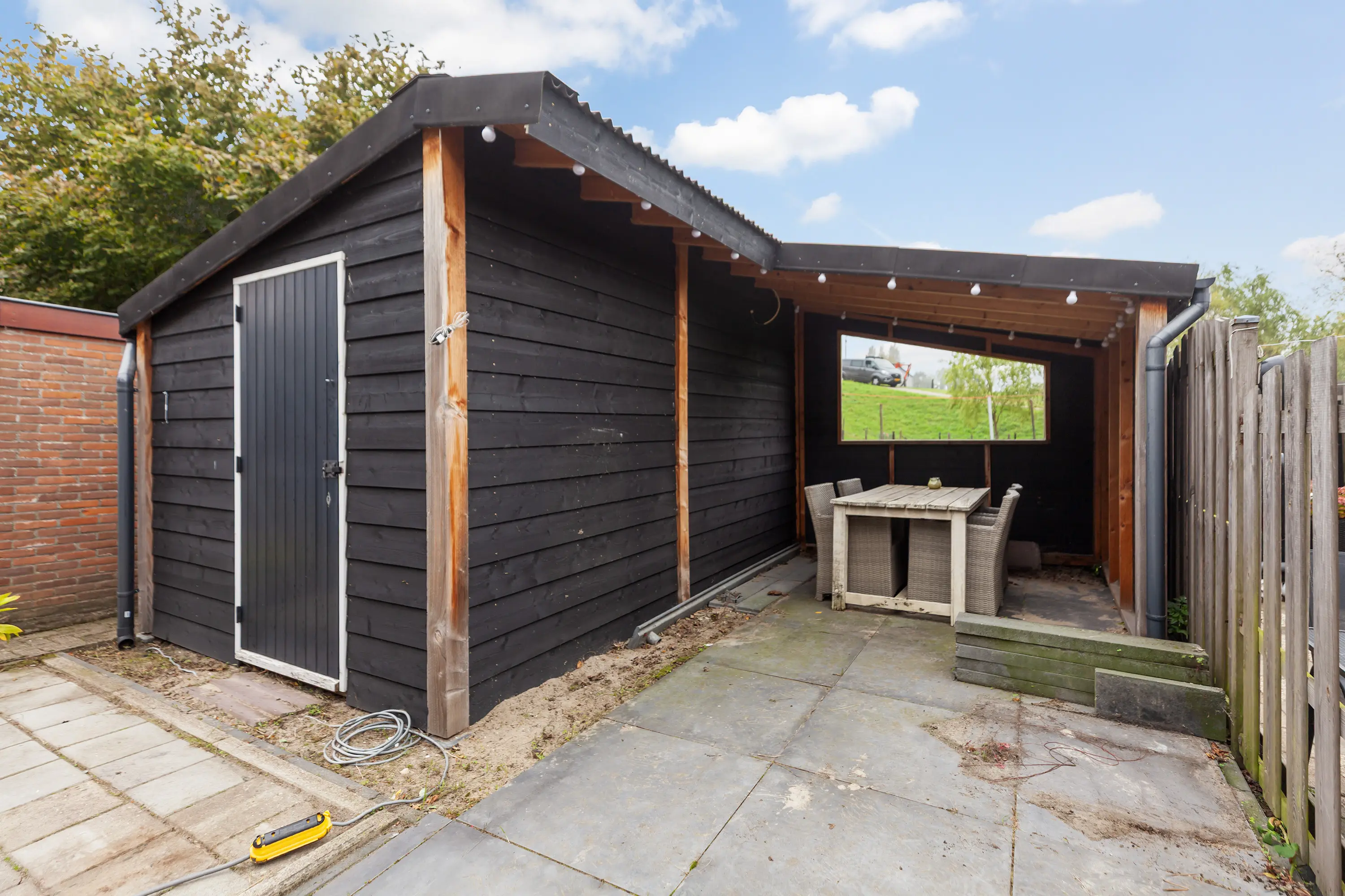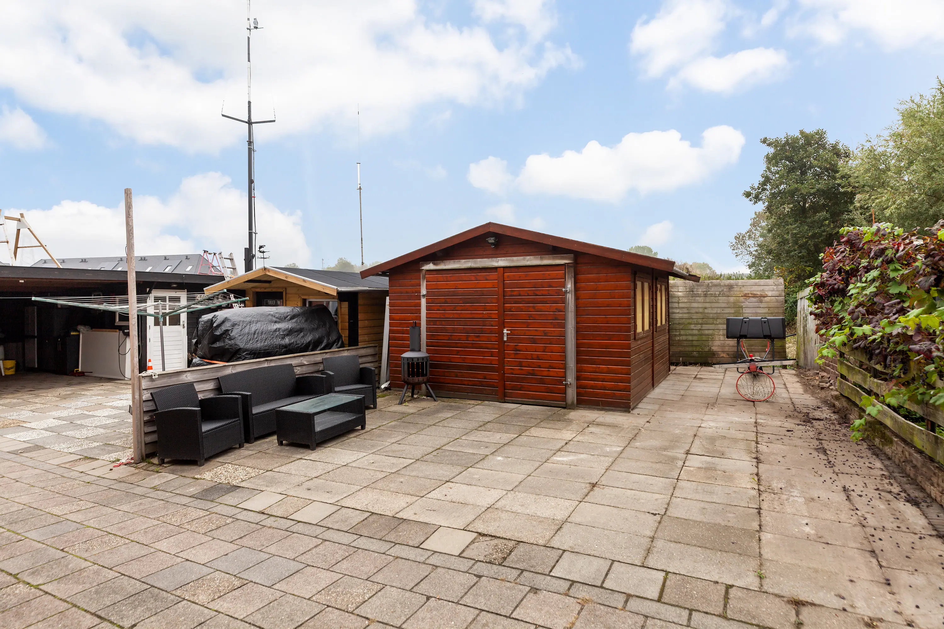 Tuinen: Voortuin aan pad met grote houten schuur en tuin/parkeerplek op het Z-O , Achtertuin aan pad met overkapping en multifunctionele ruimte/berging