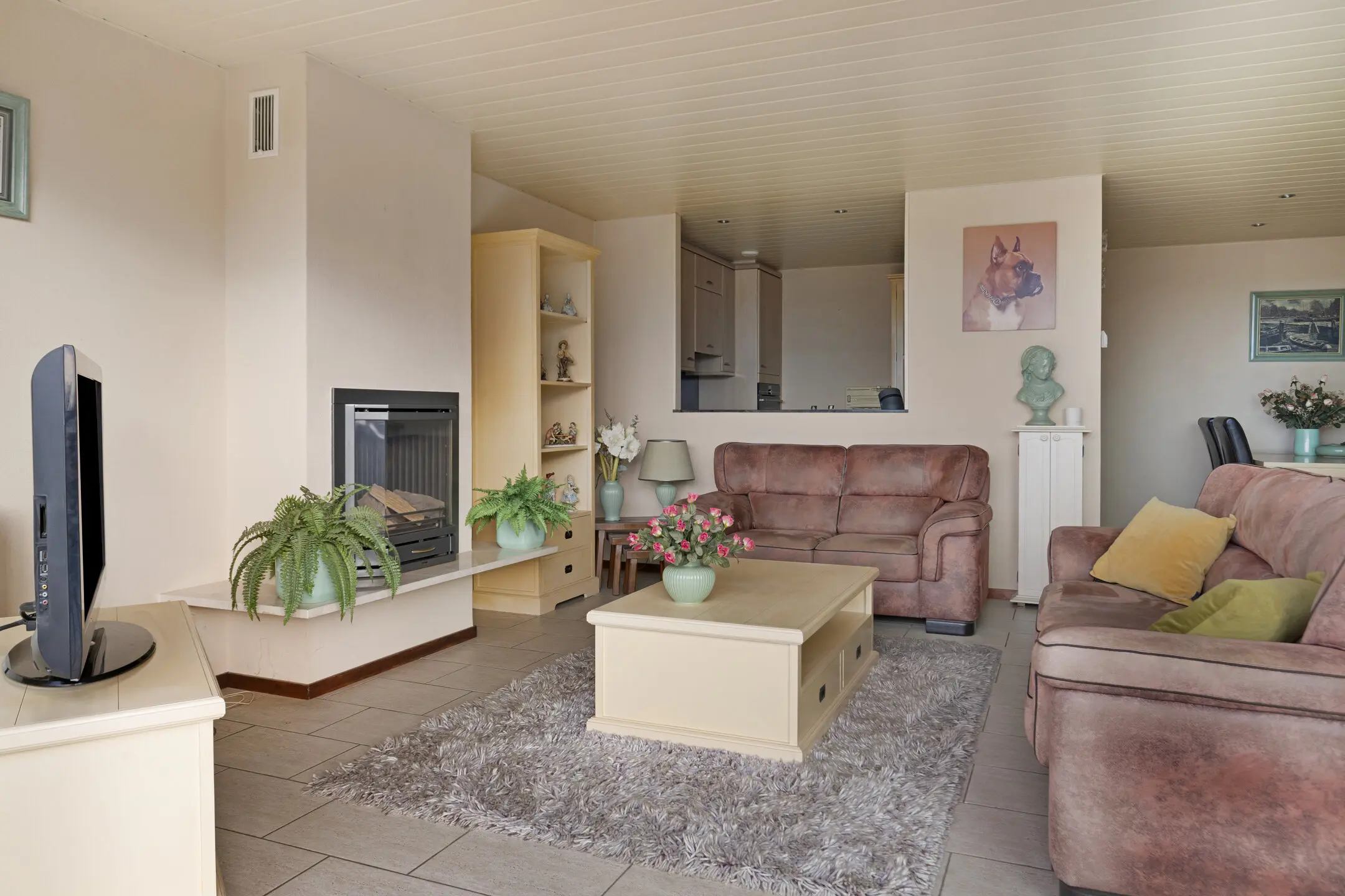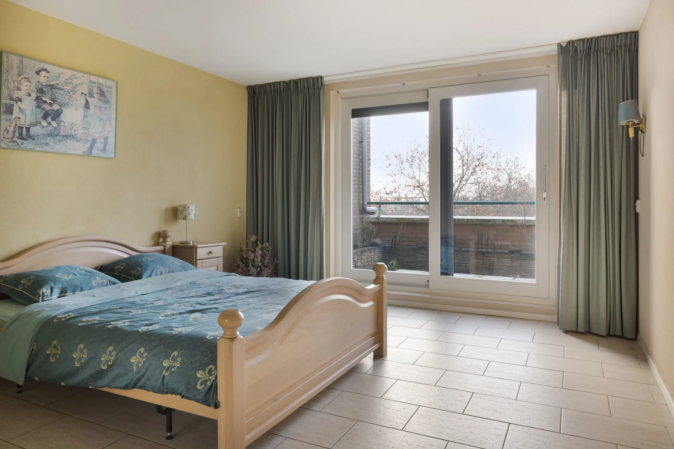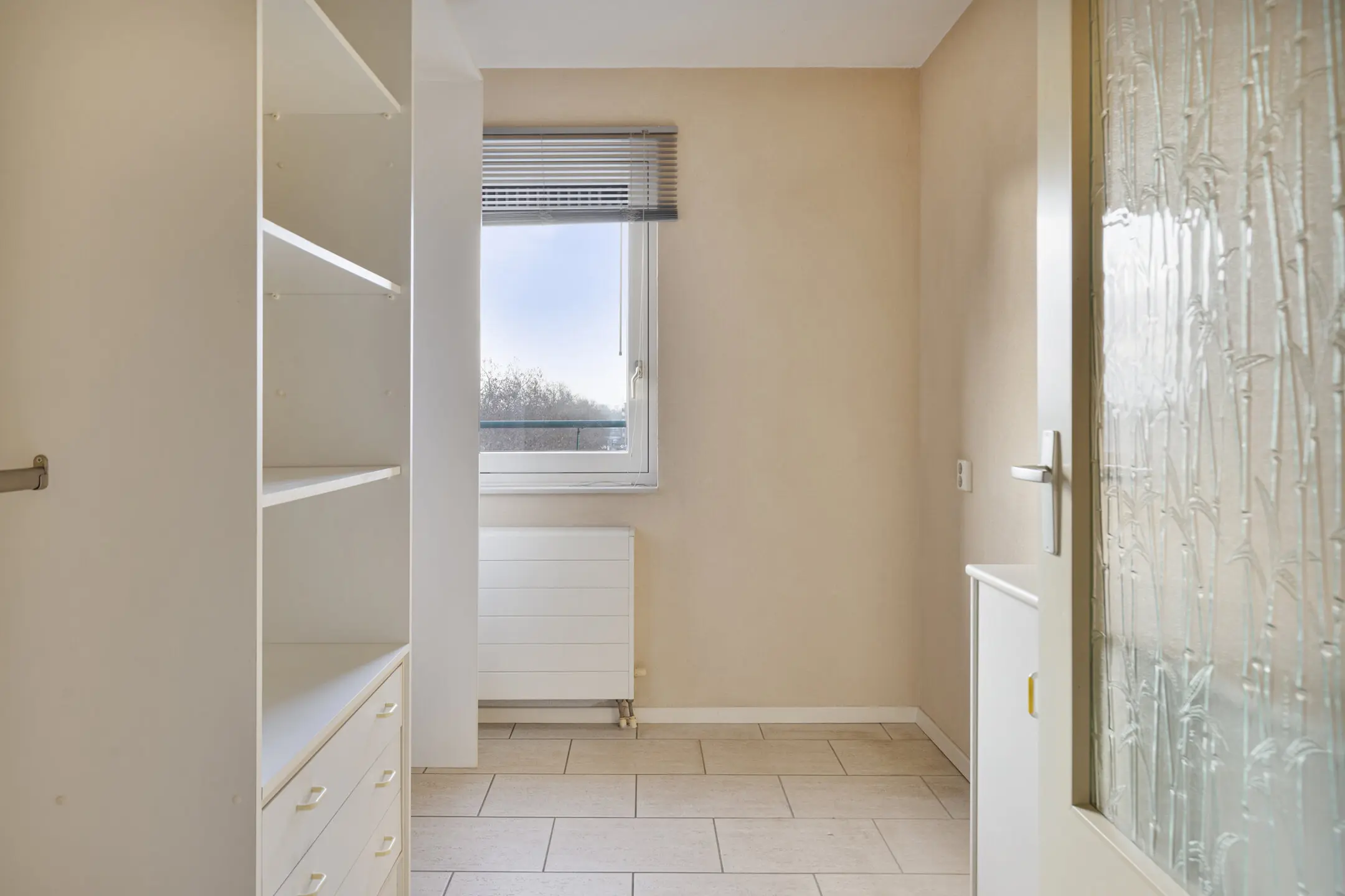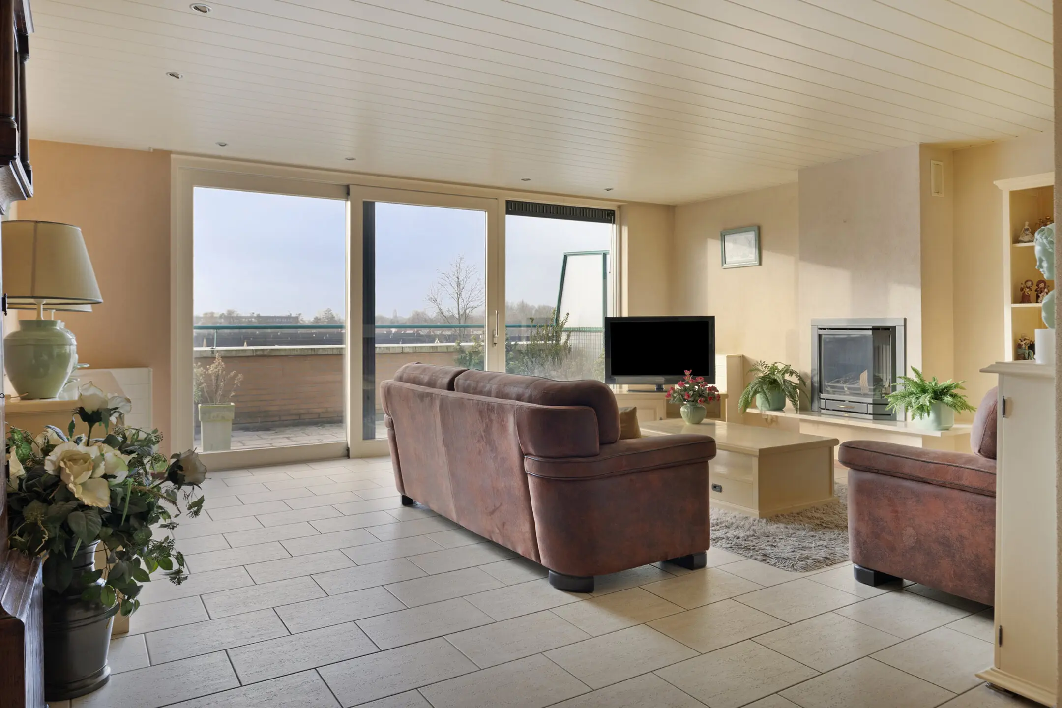 Binnen valt direct de lichte, royale woonkamer op, met grote raampartijen die het daglicht rijkelijk binnenlaten en een prachtig uitzicht bieden over het omringende groen. Vanuit de woonkamer stapt u zo het brede, zonnige terras op het zuiden op – een heerlijke plek om te ontspannen, te dineren of te genieten van de rust en privacy die deze woonlaag biedt.