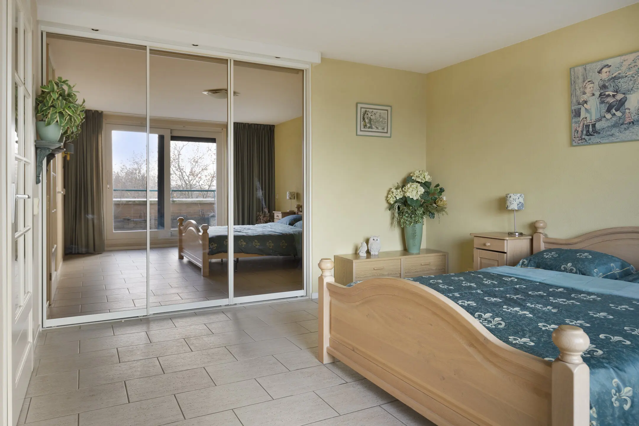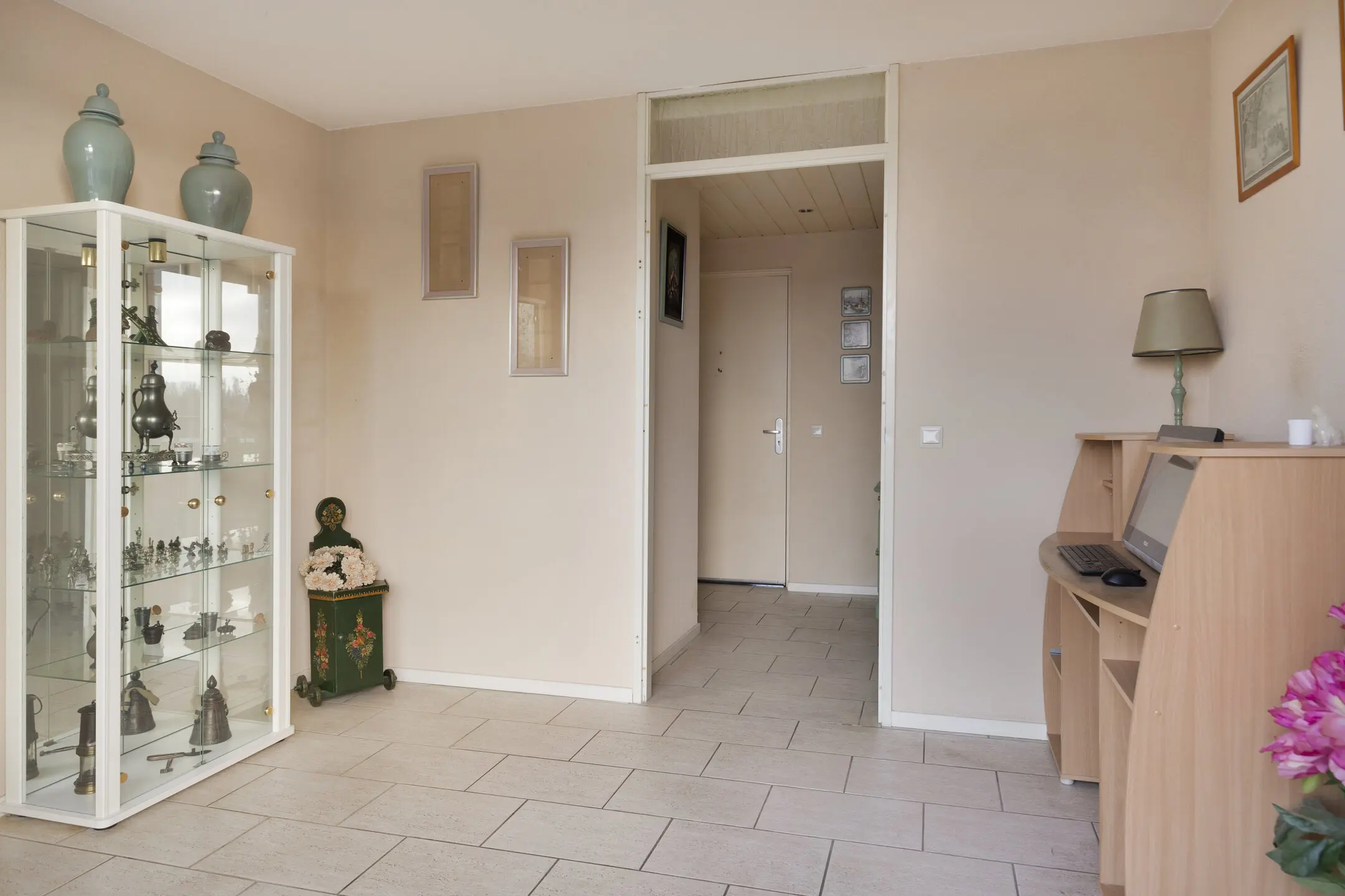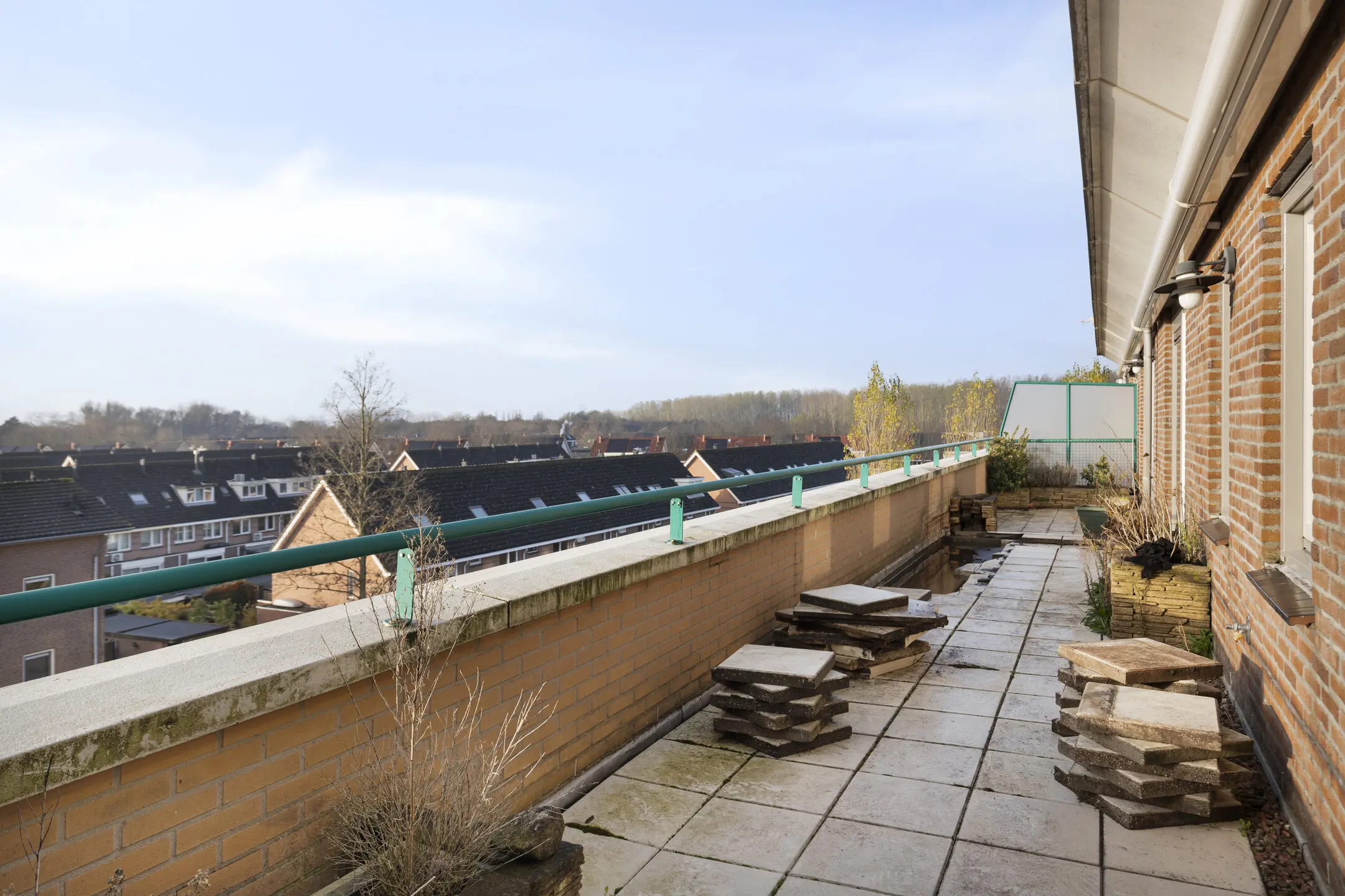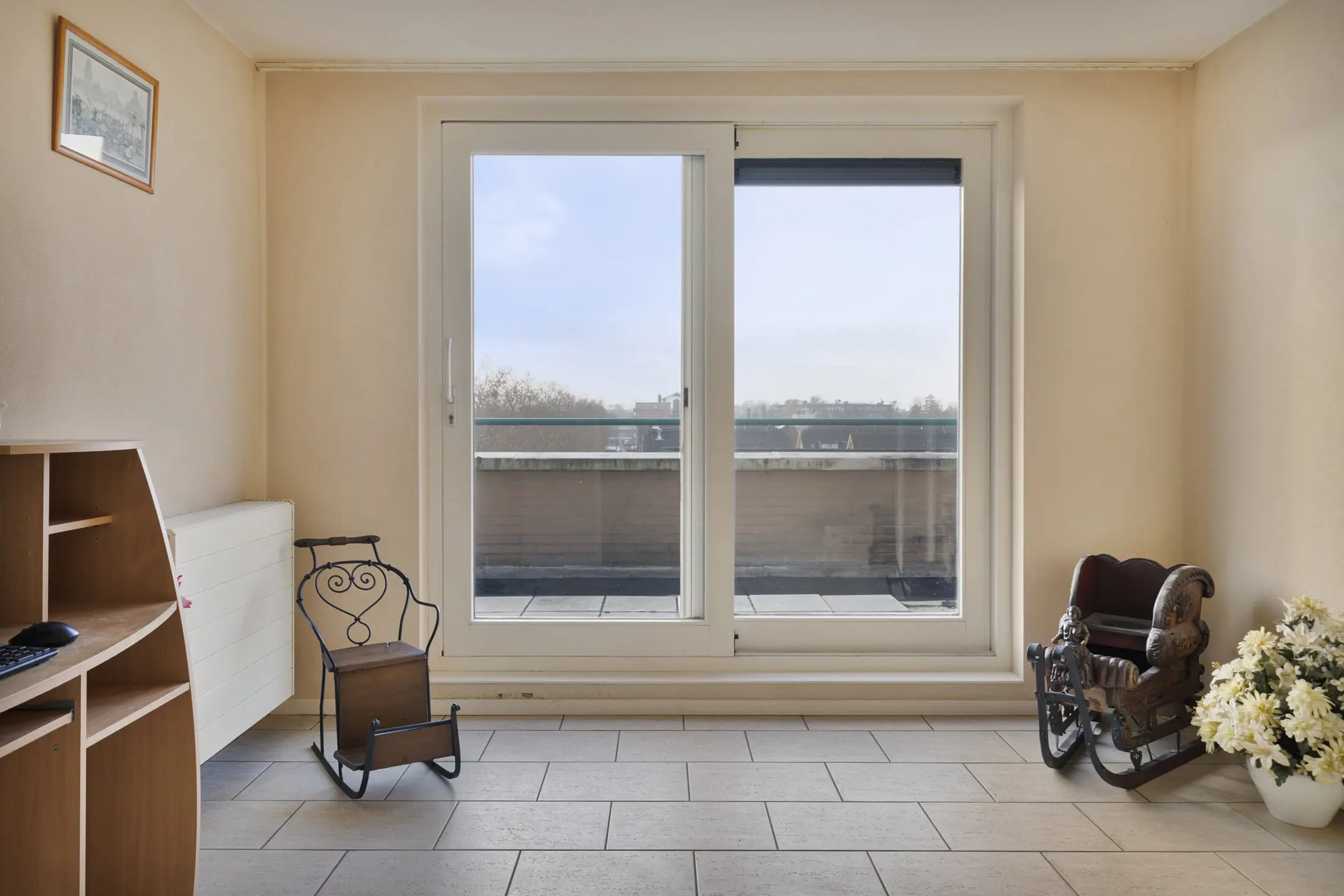 Binnen valt direct de lichte, royale woonkamer op, met grote raampartijen die het daglicht rijkelijk binnenlaten en een prachtig uitzicht bieden over het omringende groen. Vanuit de woonkamer stapt u zo het brede, zonnige terras op het zuiden op – een heerlijke plek om te ontspannen, te dineren of te genieten van de rust en privacy die deze woonlaag biedt.