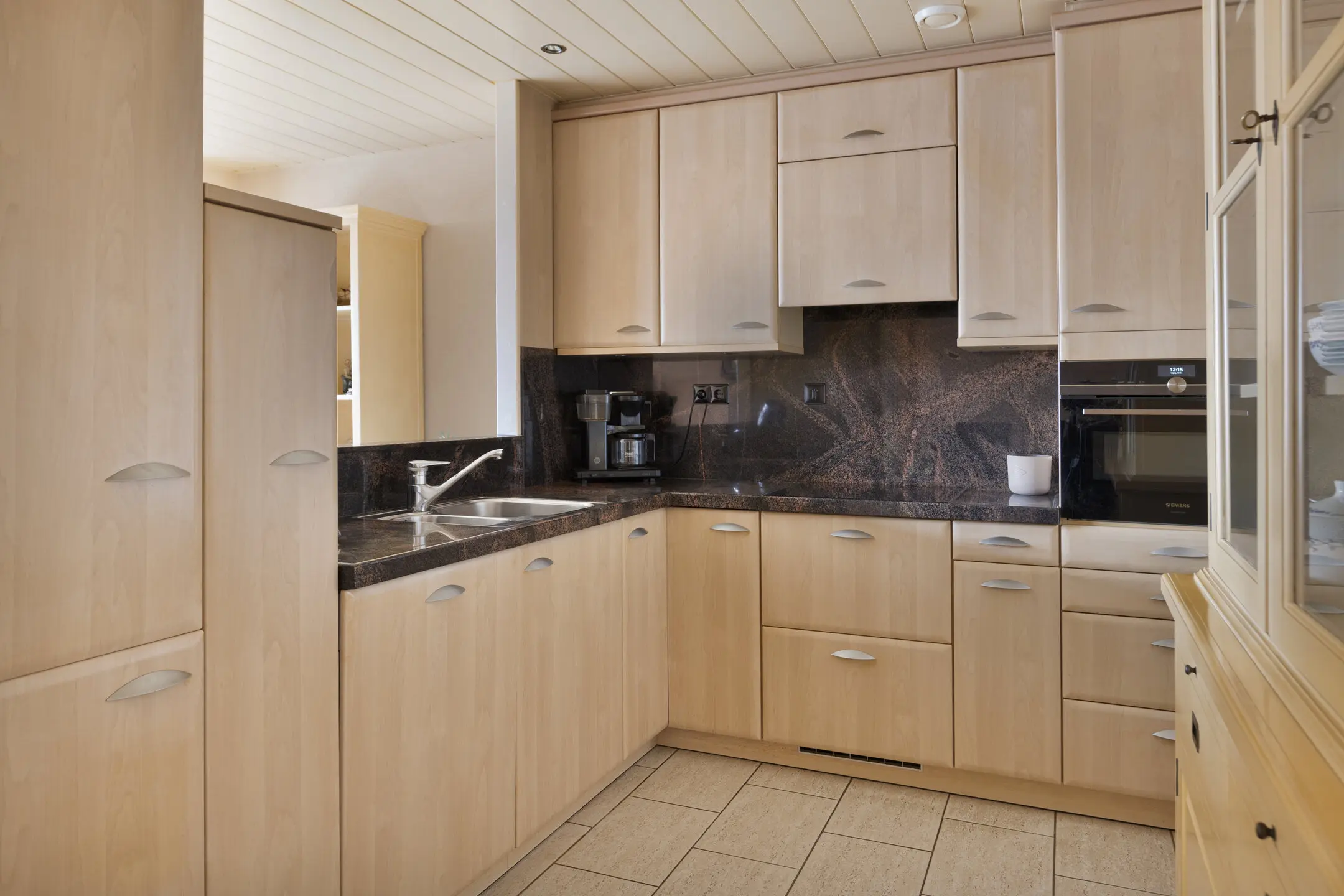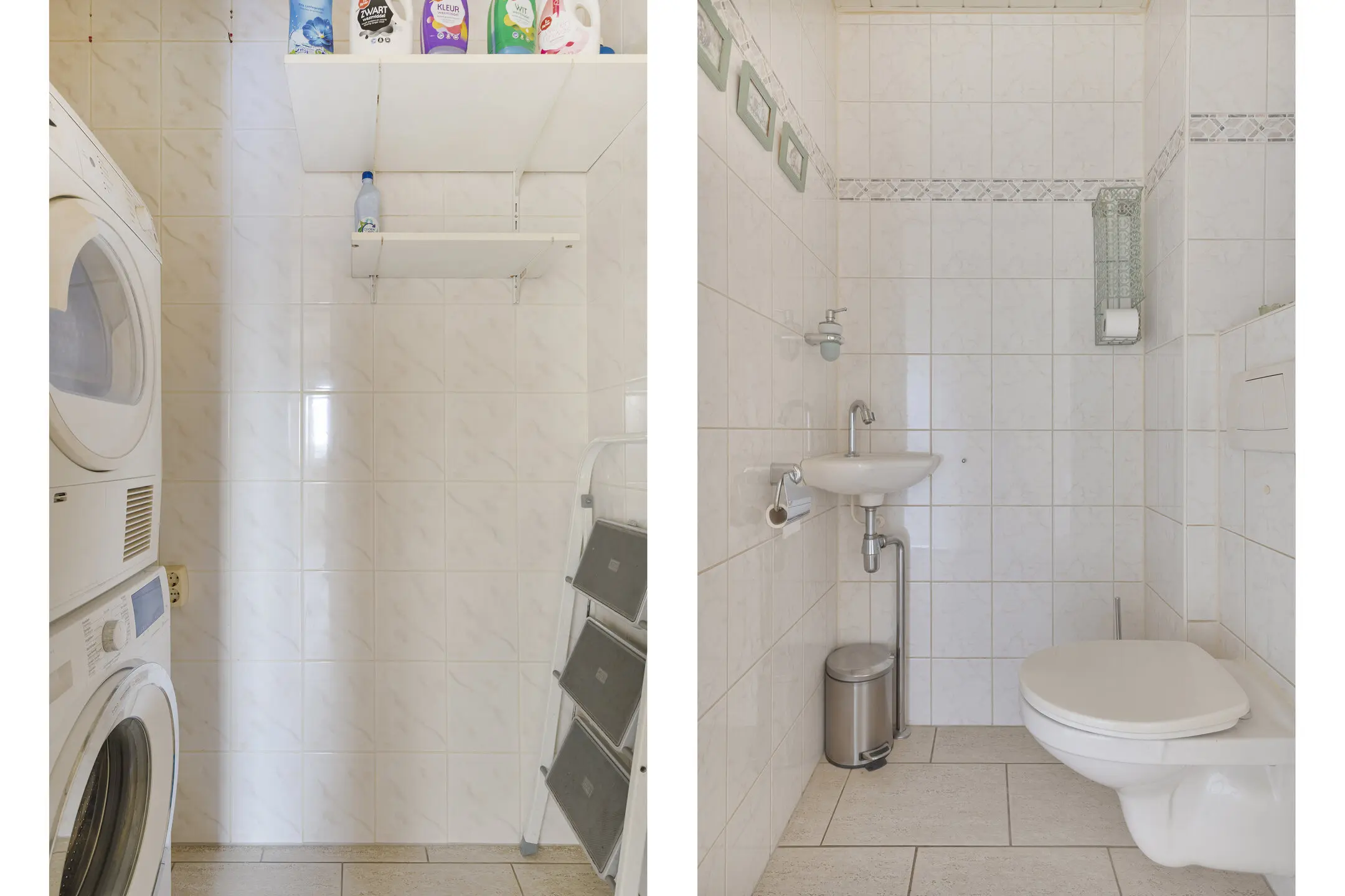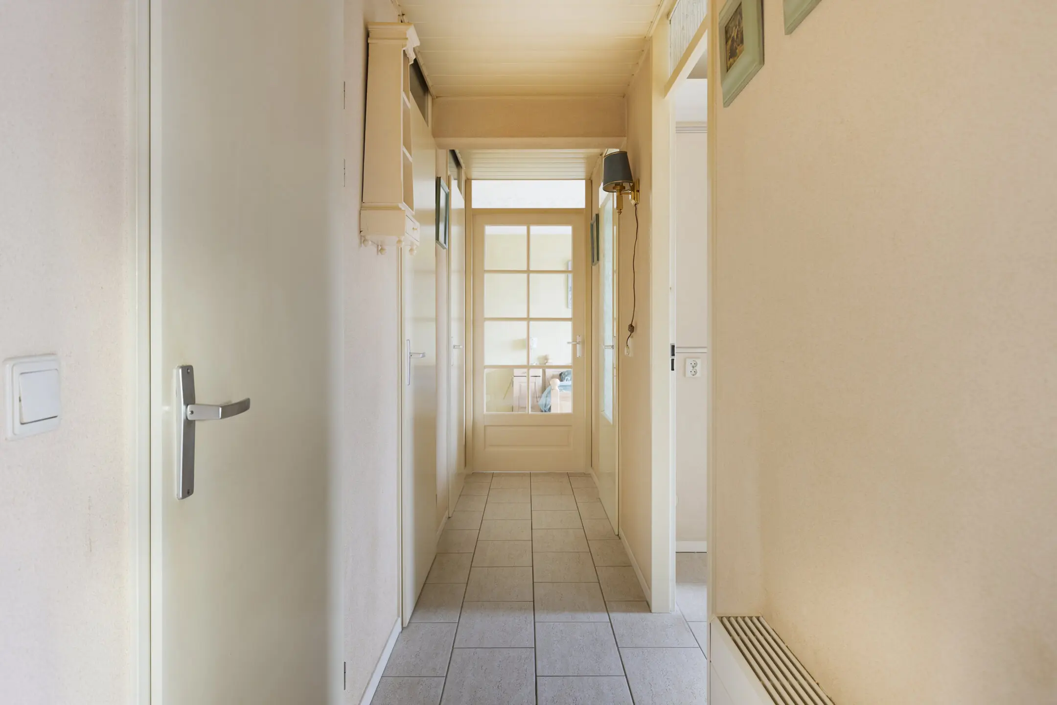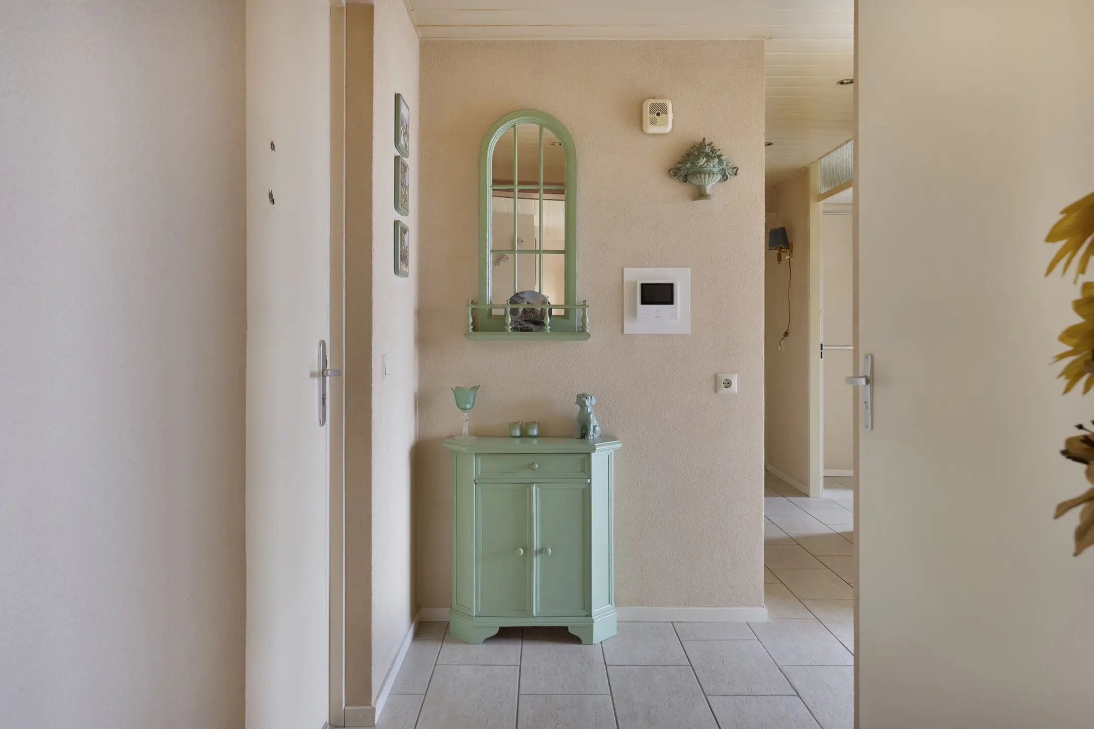 Binnen valt direct de lichte, royale woonkamer op, met grote raampartijen die het daglicht rijkelijk binnenlaten en een prachtig uitzicht bieden over het omringende groen. Vanuit de woonkamer stapt u zo het brede, zonnige terras op het zuiden op – een heerlijke plek om te ontspannen, te dineren of te genieten van de rust en privacy die deze woonlaag biedt.