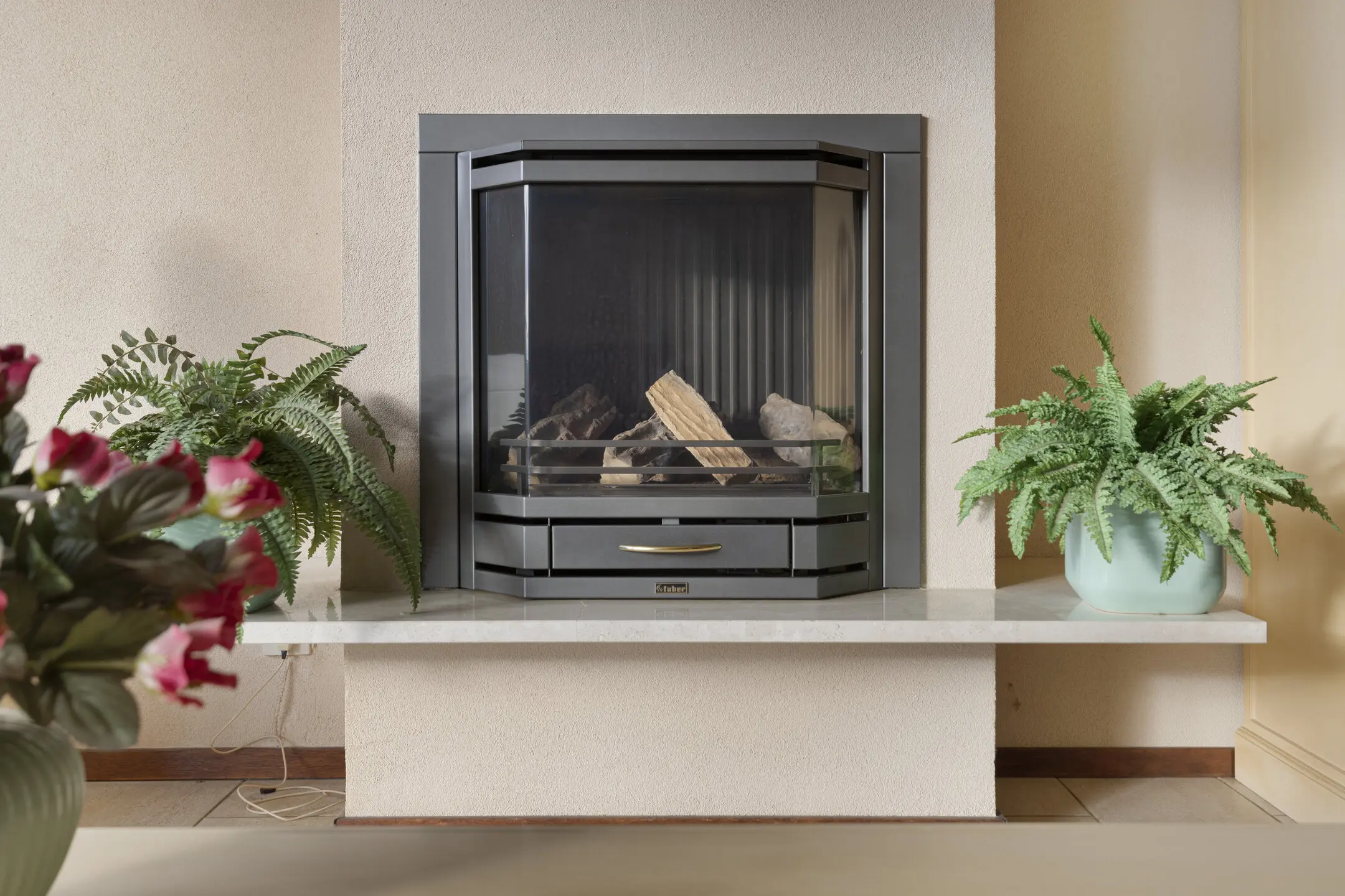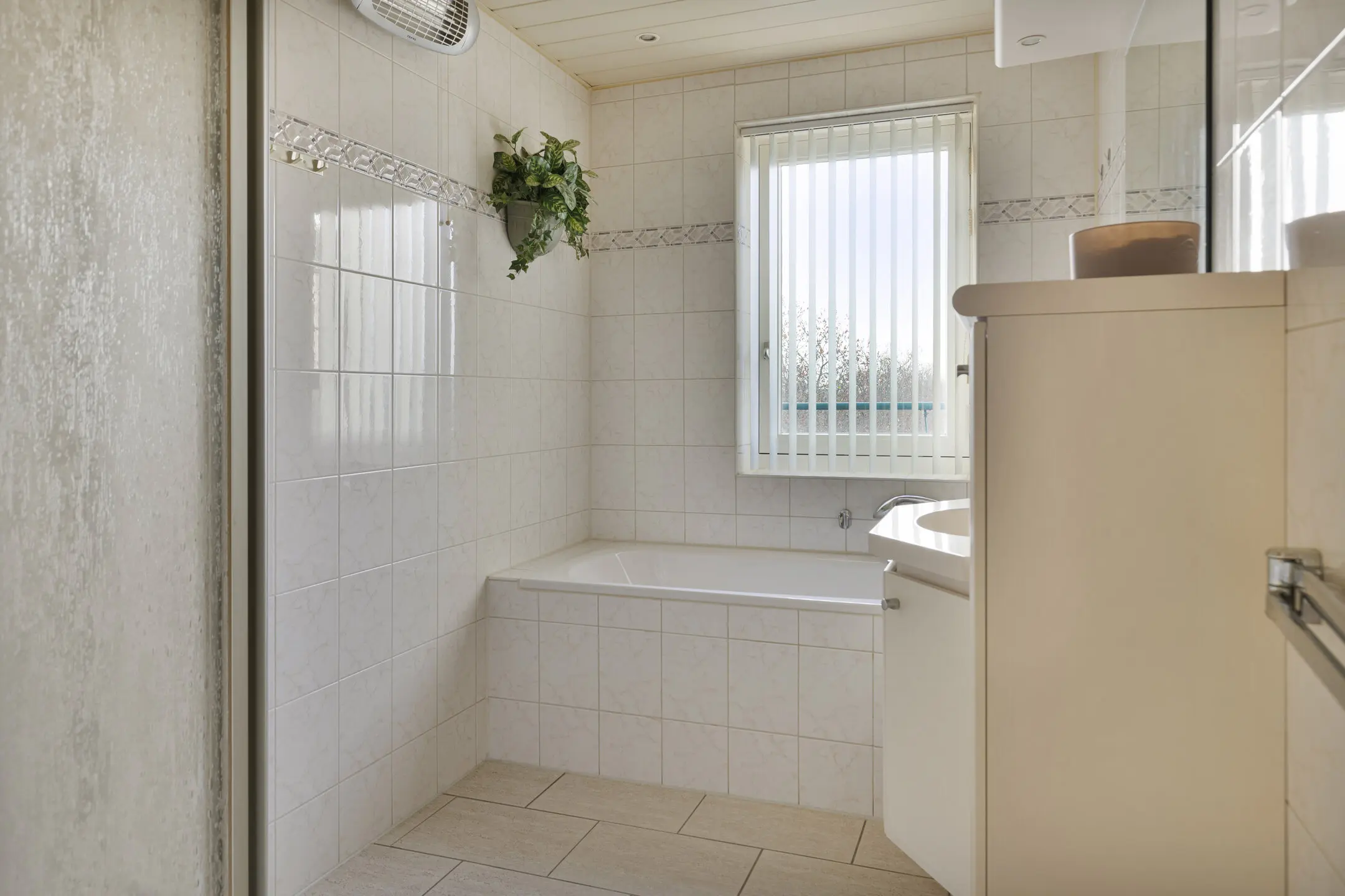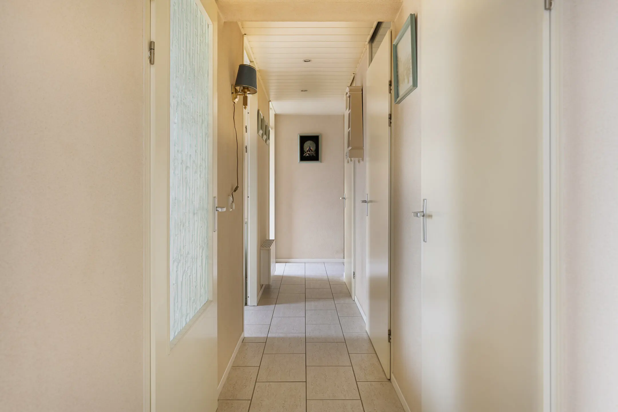 Woonkamer met sfeerhaard en schuifpui naar het terras, open keuken, master bedroom met schuifpui naar het terras, 2 slaapkamers, hal/gang met bergkast, toilet en CV-kast, badkamer met ligbad, douche en wastafel.