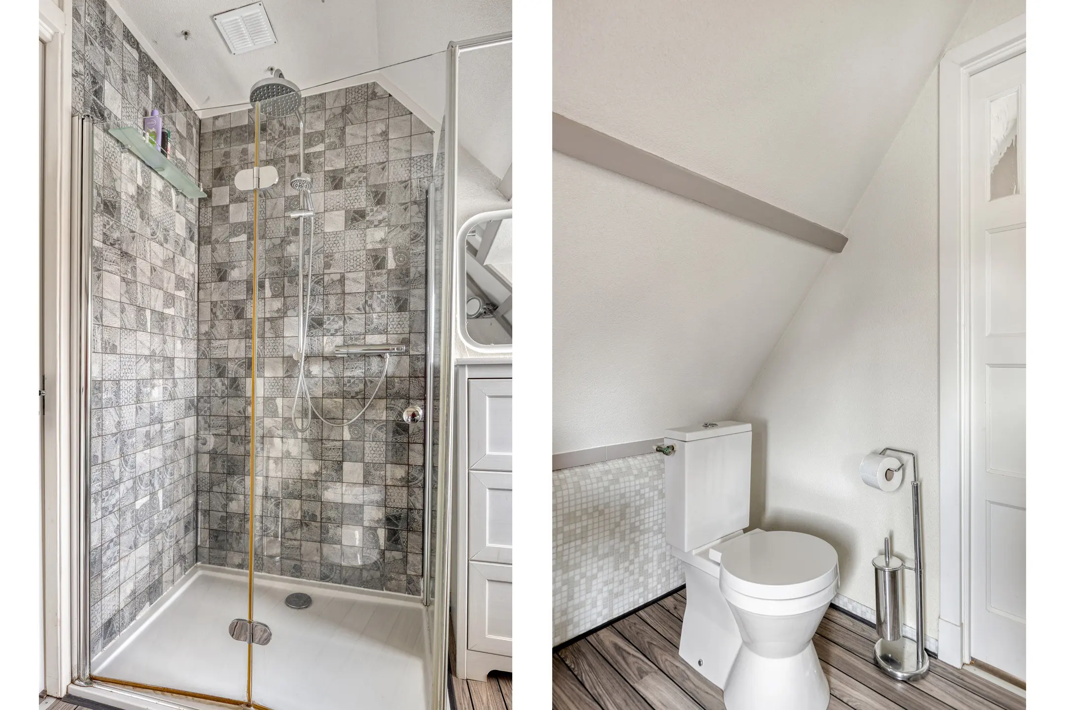 1e verdieping: ruime overloop, 2 slaapkamers, sfeervolle badkamer met douche en toilet, badmeubel. Toegang naar bergzolder via een losse trap.