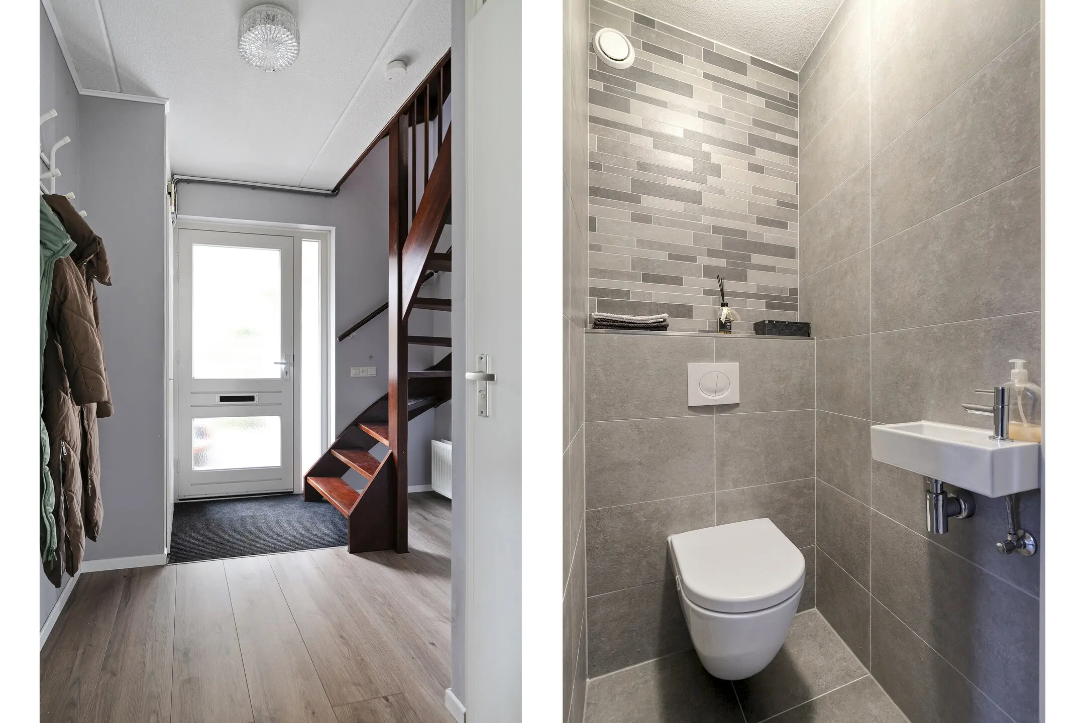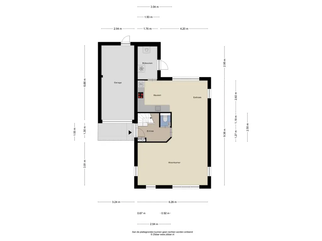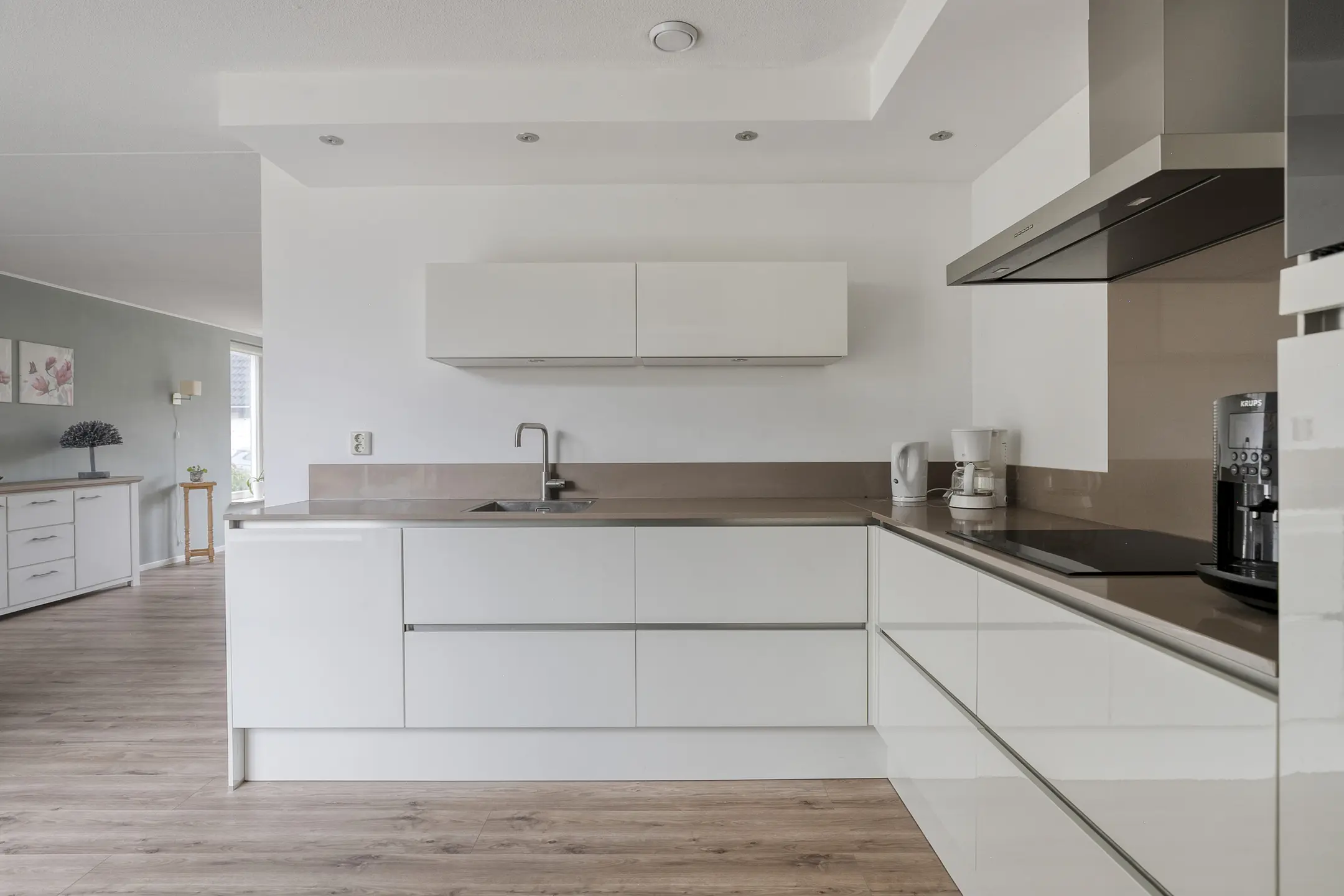L-woonkamer met zit- en eethoek, mooie strakke open keuken uit 2018 met diverse inbouwapparatuur, bijkeuken met deur naar de tuin, hal/entree met meterkast en toilet.