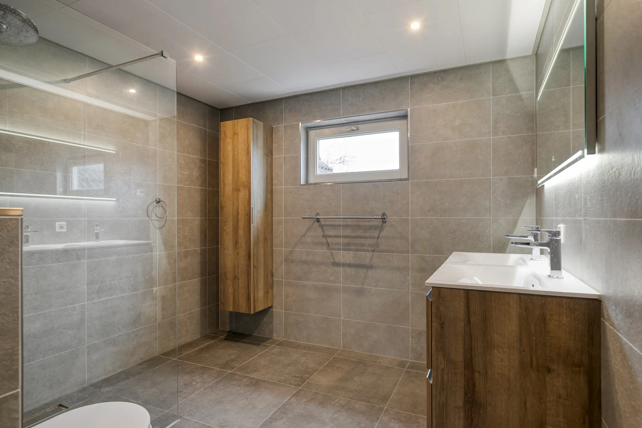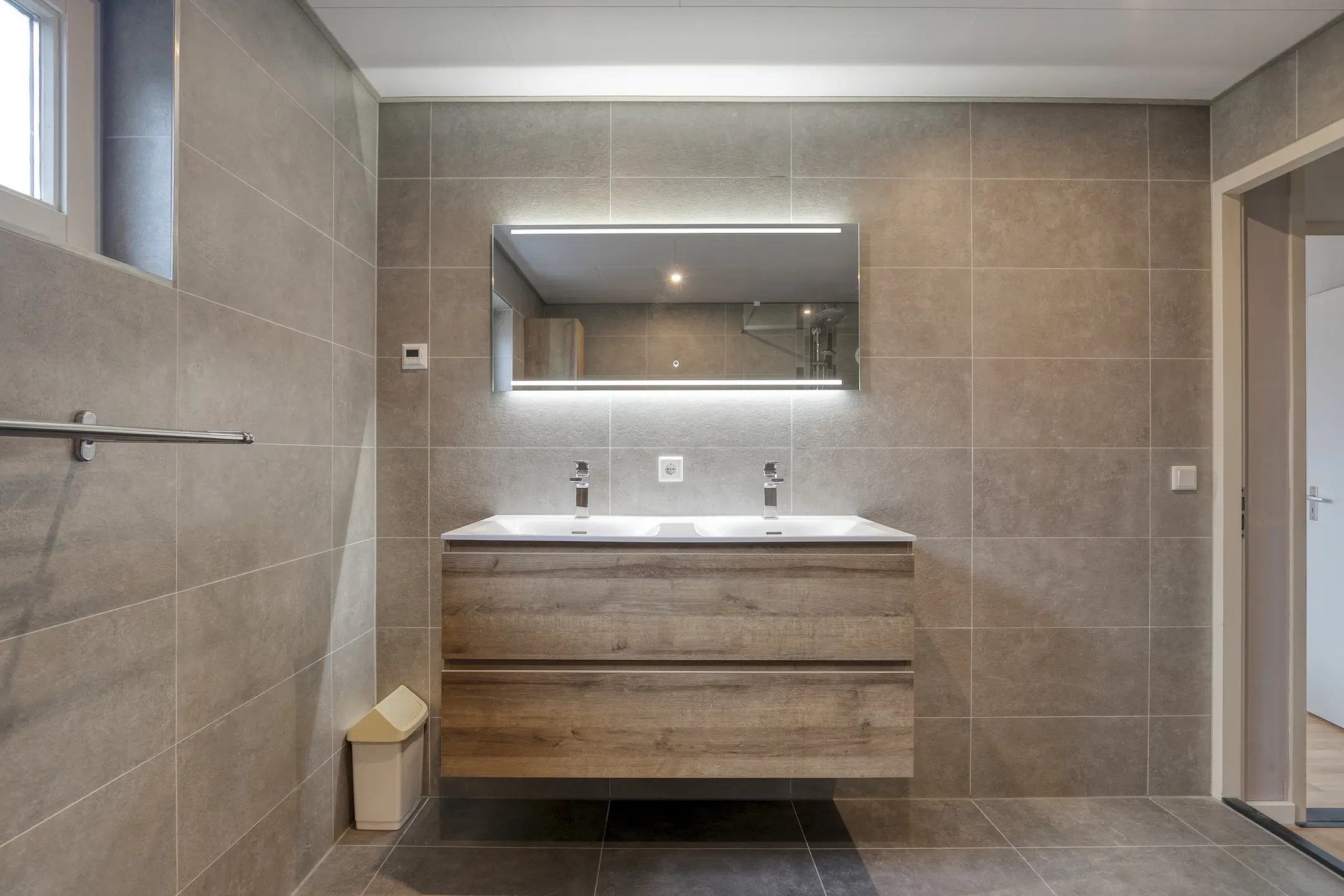1e verdieping: via een mooie hardhouten trap naar de overloop, 3 slaapkamers en een hobby/slaapkamer boven de garage, badkamer met inrichting uit 2019 van mooie kwaliteit: vloerverwarming, inloopdouche, badmeubel met dubbele wastafel en toilet.