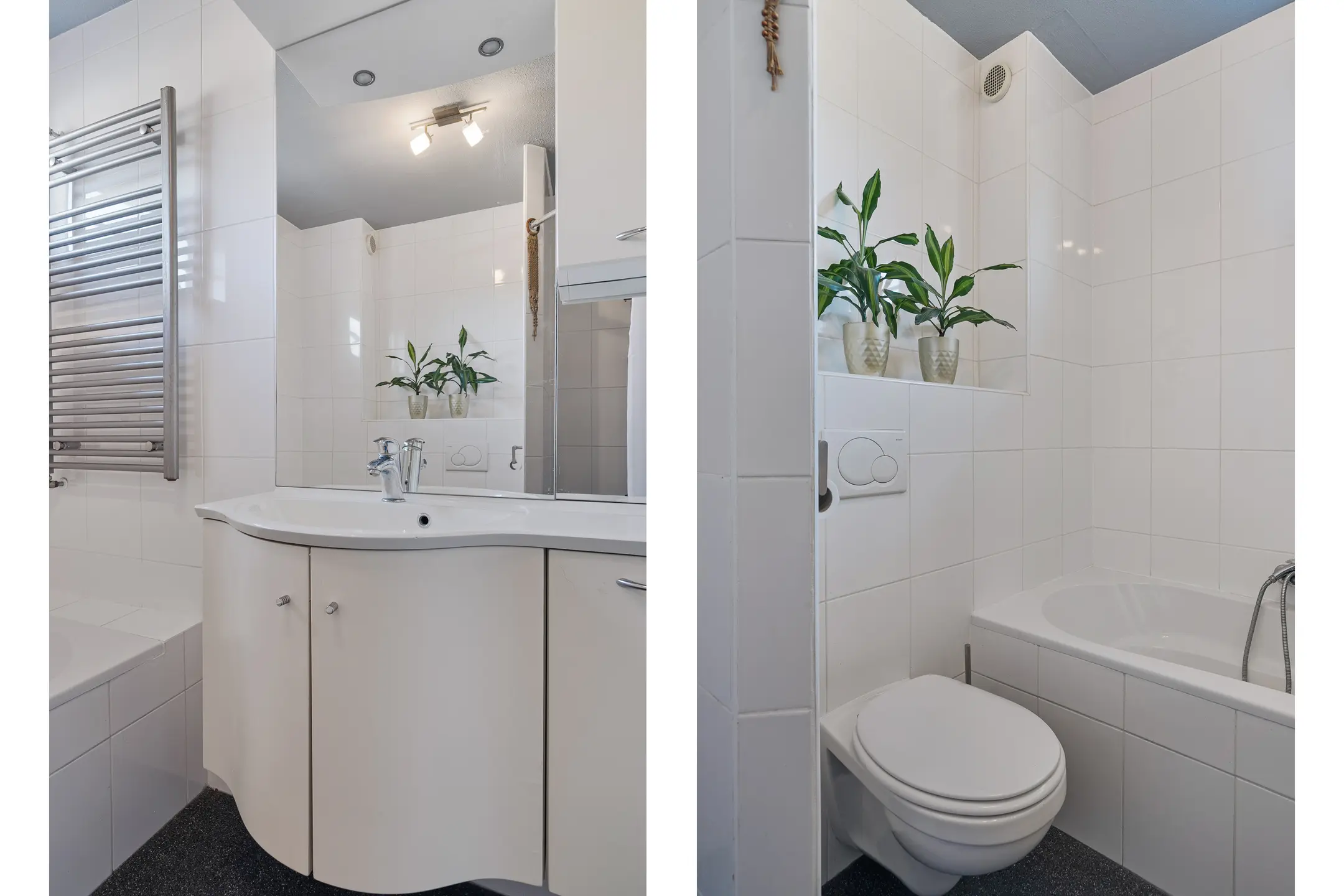 1e verdieping: 2 slaapkamers (voorheen 3), overloop, badkamer met inloopdouche, ligbad en badmeubel met wastafel.