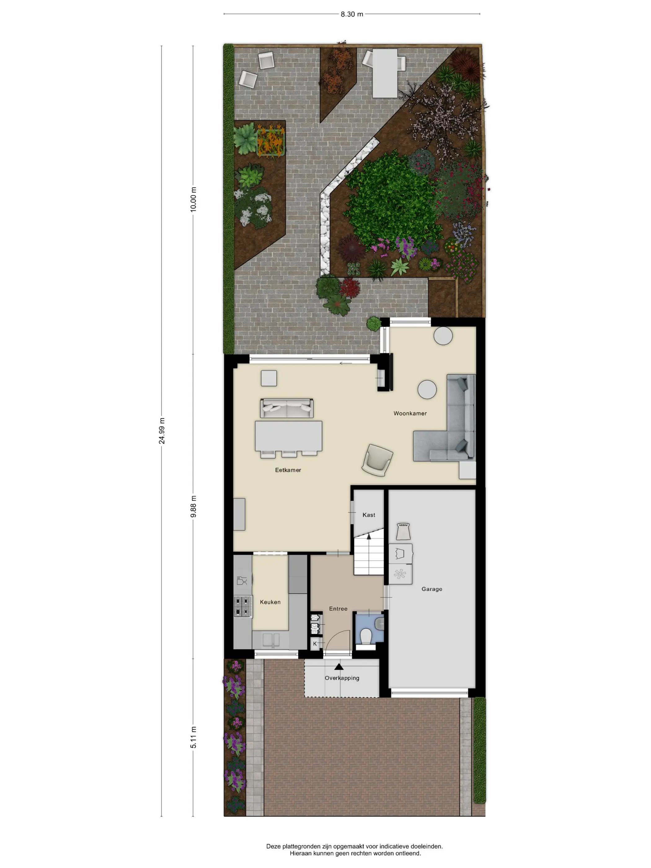 Lichte en ruime woonkamer met deur naar de tuin, keuken met nette inrichting en inbouwapparatuur, hal/entree met toilet, meterkast en deur naar de aanpandige garage.