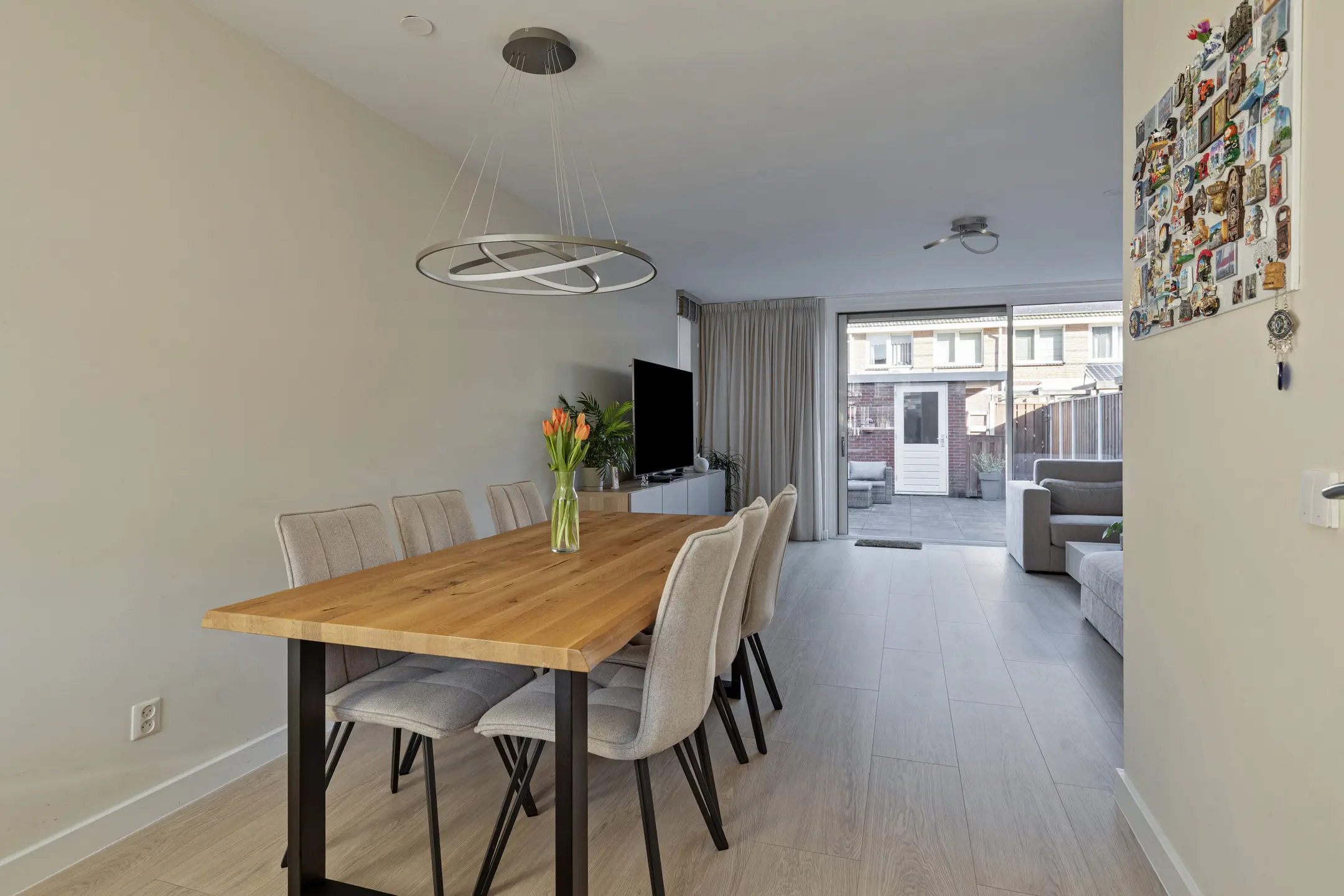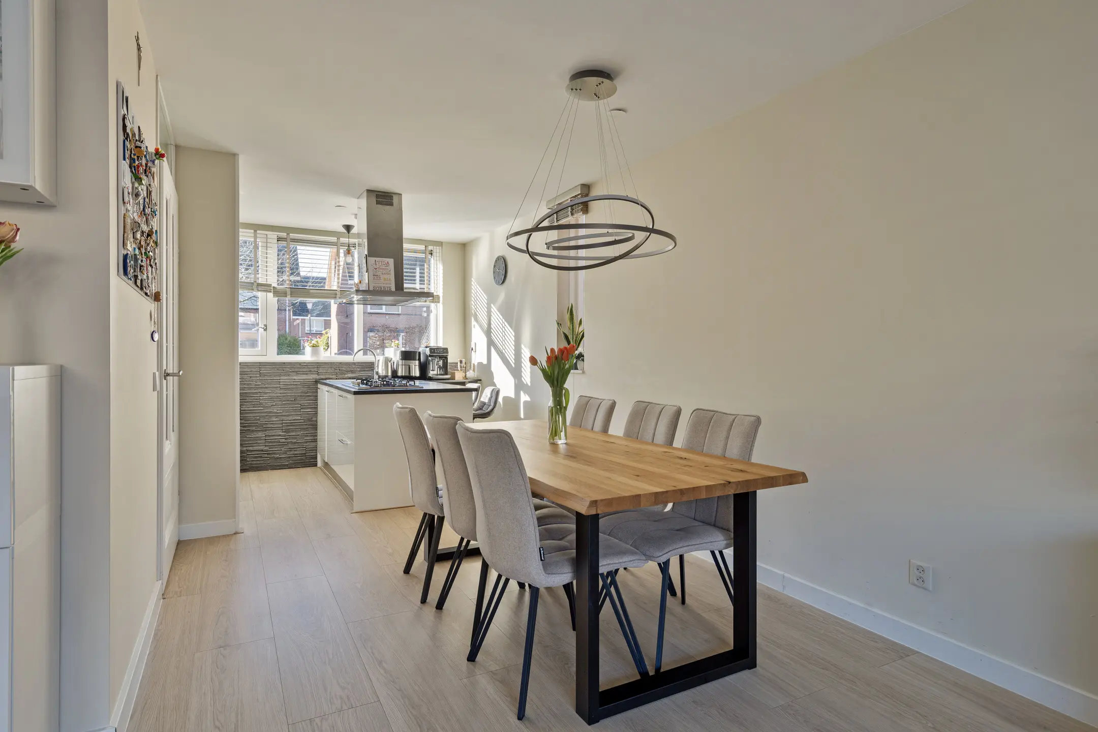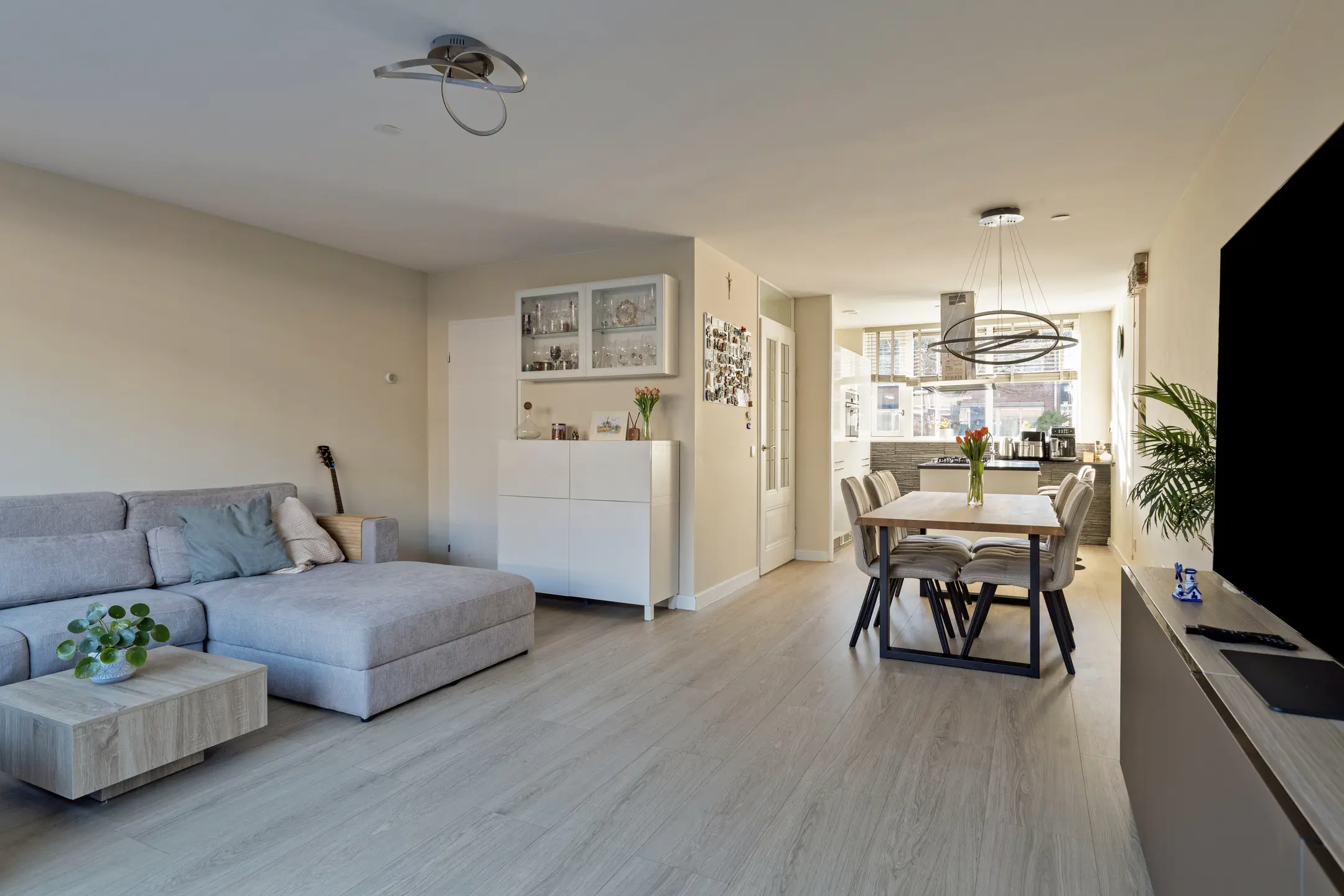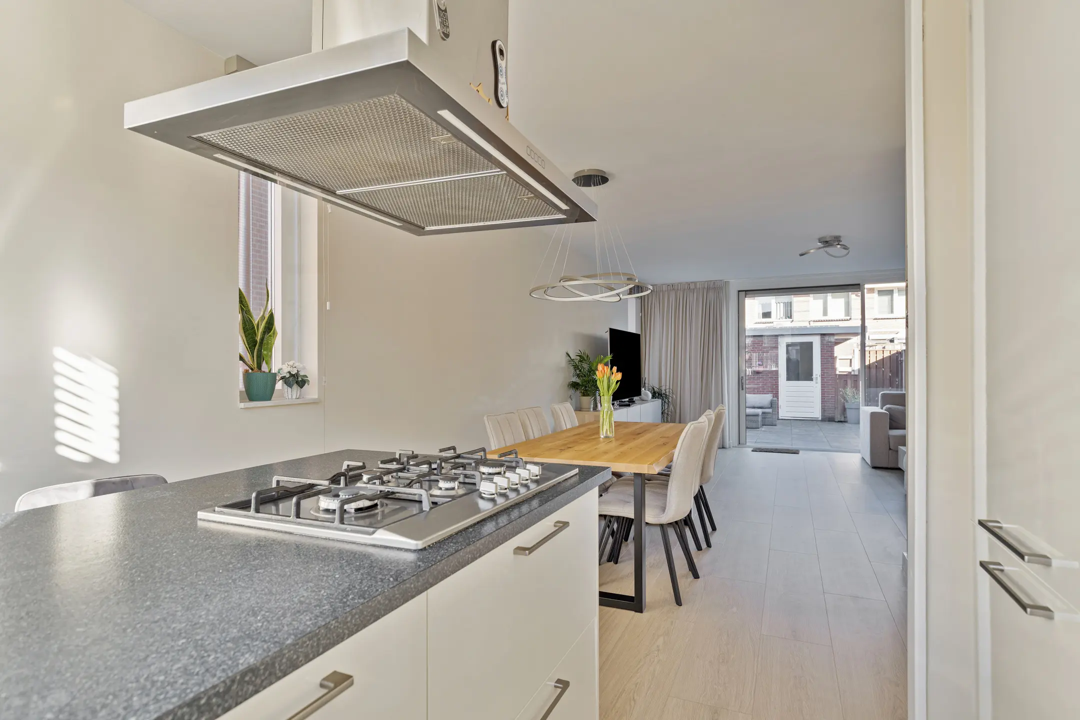 De woning is in de loop der jaren gemoderniseerd en biedt een eigentijdse woonbeleving met veel ruimte en licht. Dankzij de uitbouw aan de achterzijde is er een royale leefruimte ontstaan waar wonen, koken en eten op natuurlijke wijze samenkomen. De moderne keuken is praktisch ingericht en voorzien van hedendaagse apparatuur, terwijl het stijlvolle toilet comfort en rust uitstraalt. Onder de trap bevindt zich een opslagruimte voorzien van planken.