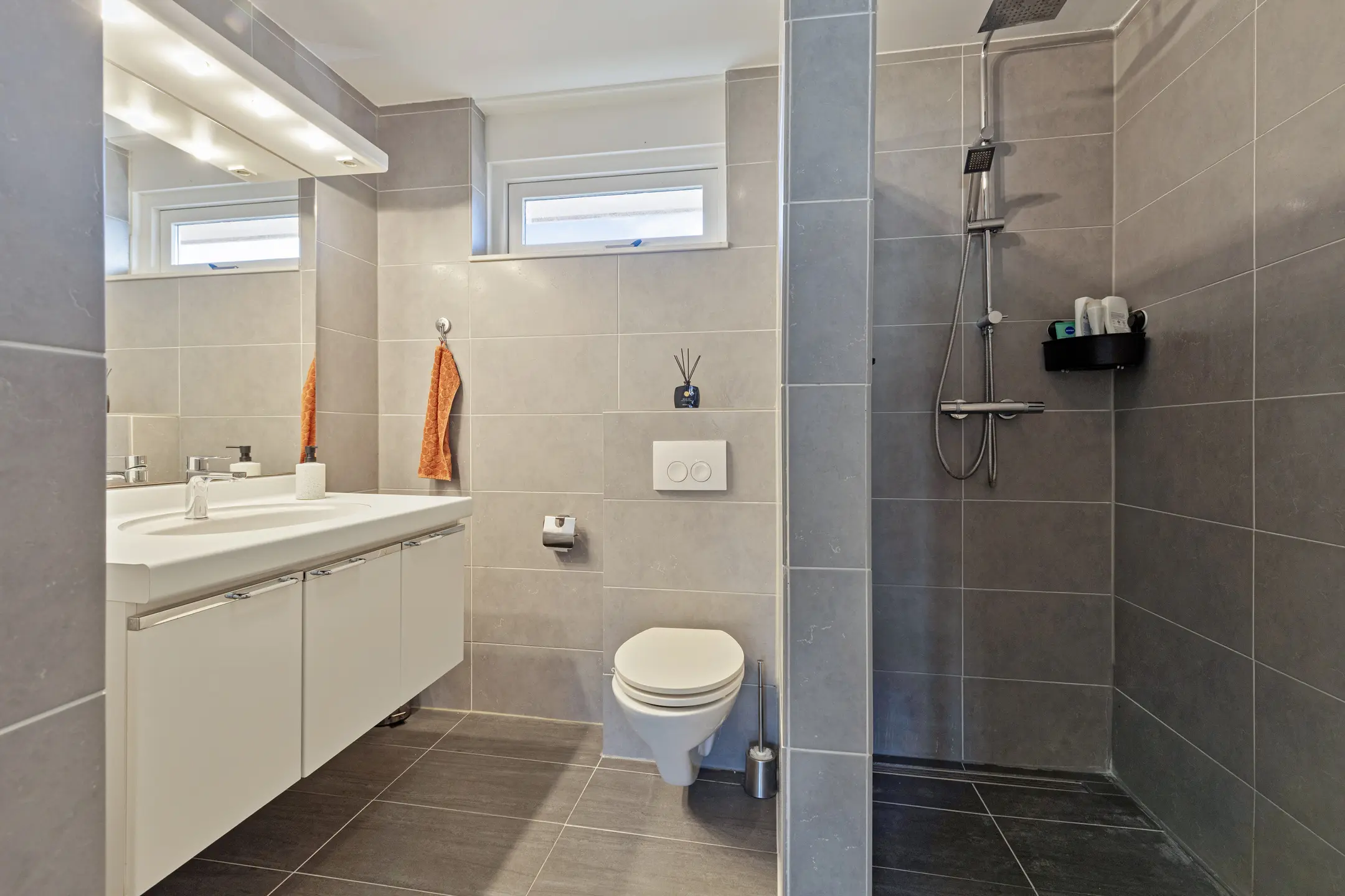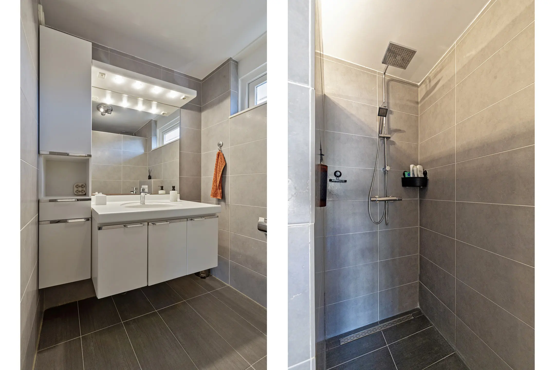 1e verdieping: 3 ruime slaapkamers, overloop en eigentijdse badkamer met inloopdouche, badmeubel met wastafel en toilet.