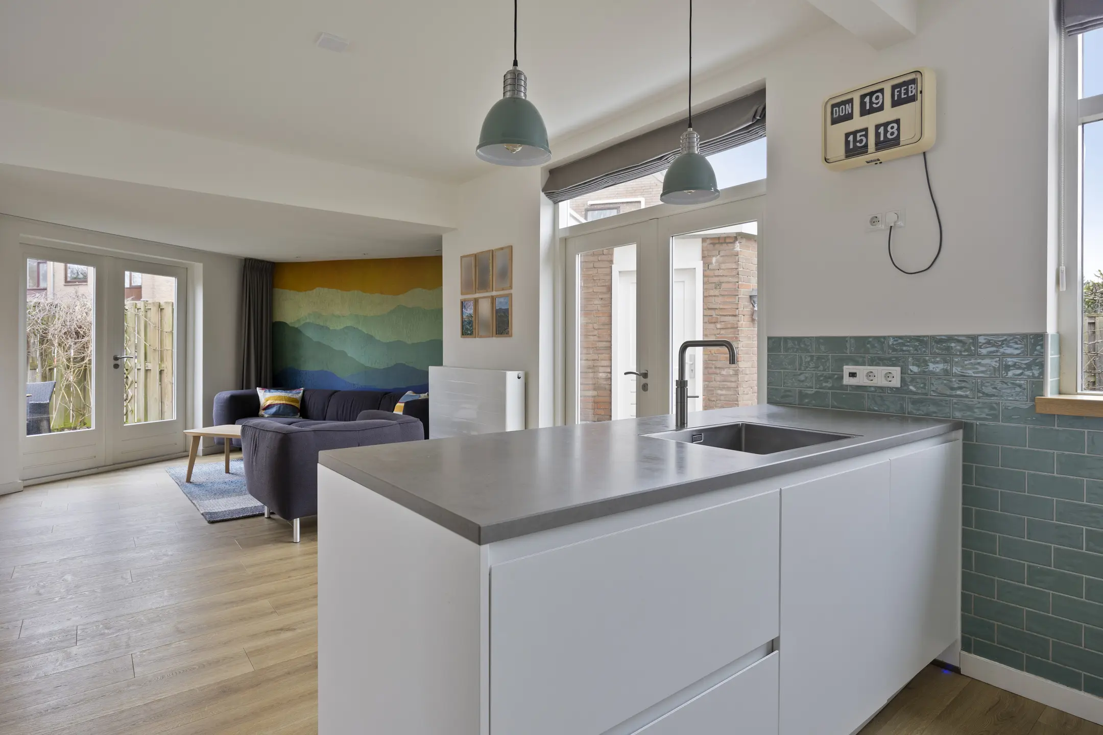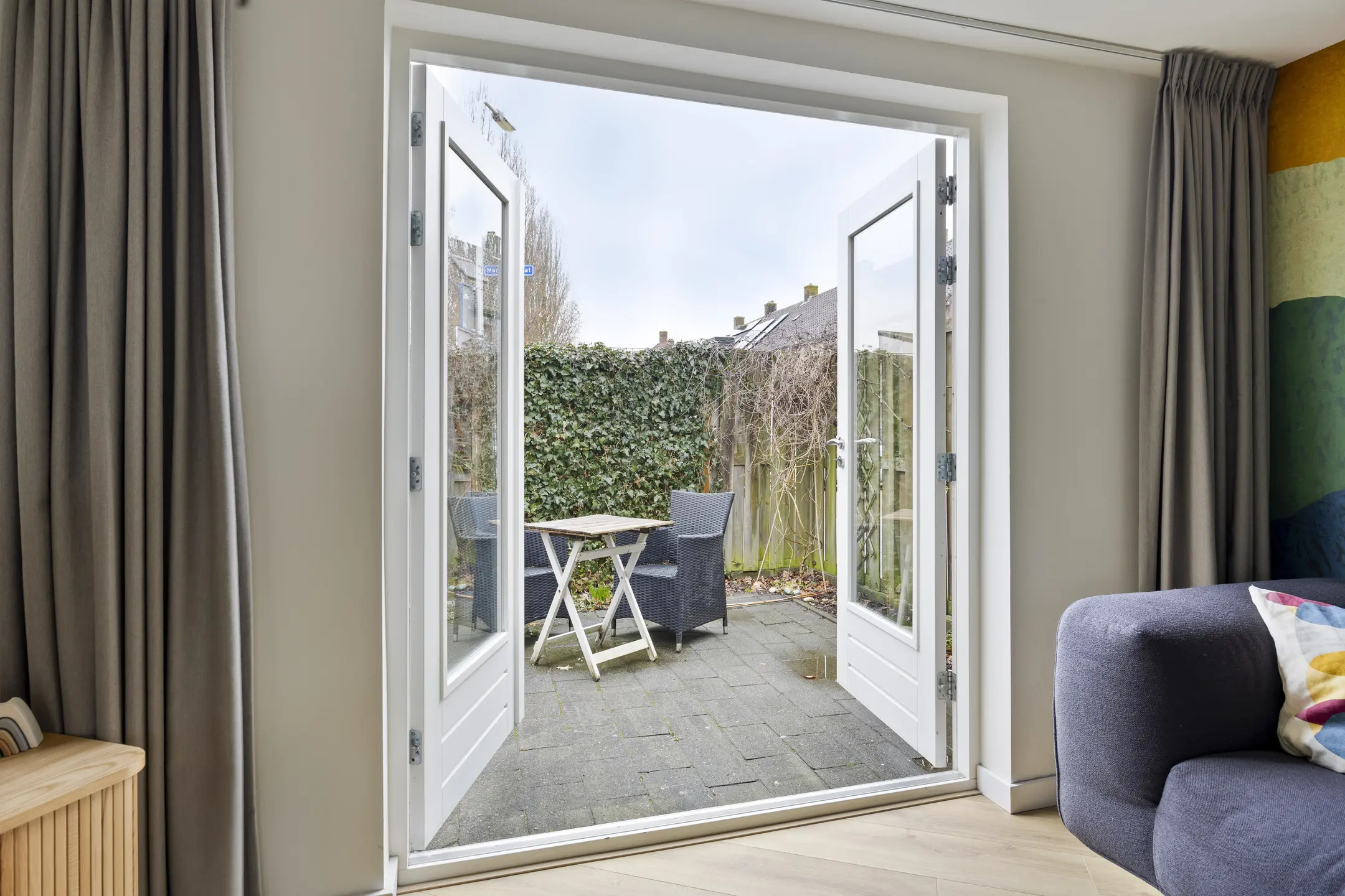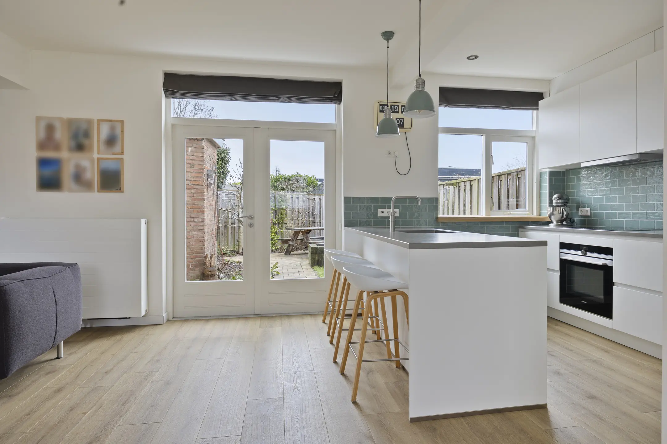 Begane grond: de bijzonder ruime woonkamer is licht door de vele ramen en heeft openslaande deuren naar de achtertuin én openslaande deuren naar de knusse zijtuin/patio. De lichte moderne open keuken beschikt over inbouwapparatuur, voldoende werkruimte, een leuke (eet-)bar en een verdiepte kelderkast. Hal/entree met toilet en meterkast.