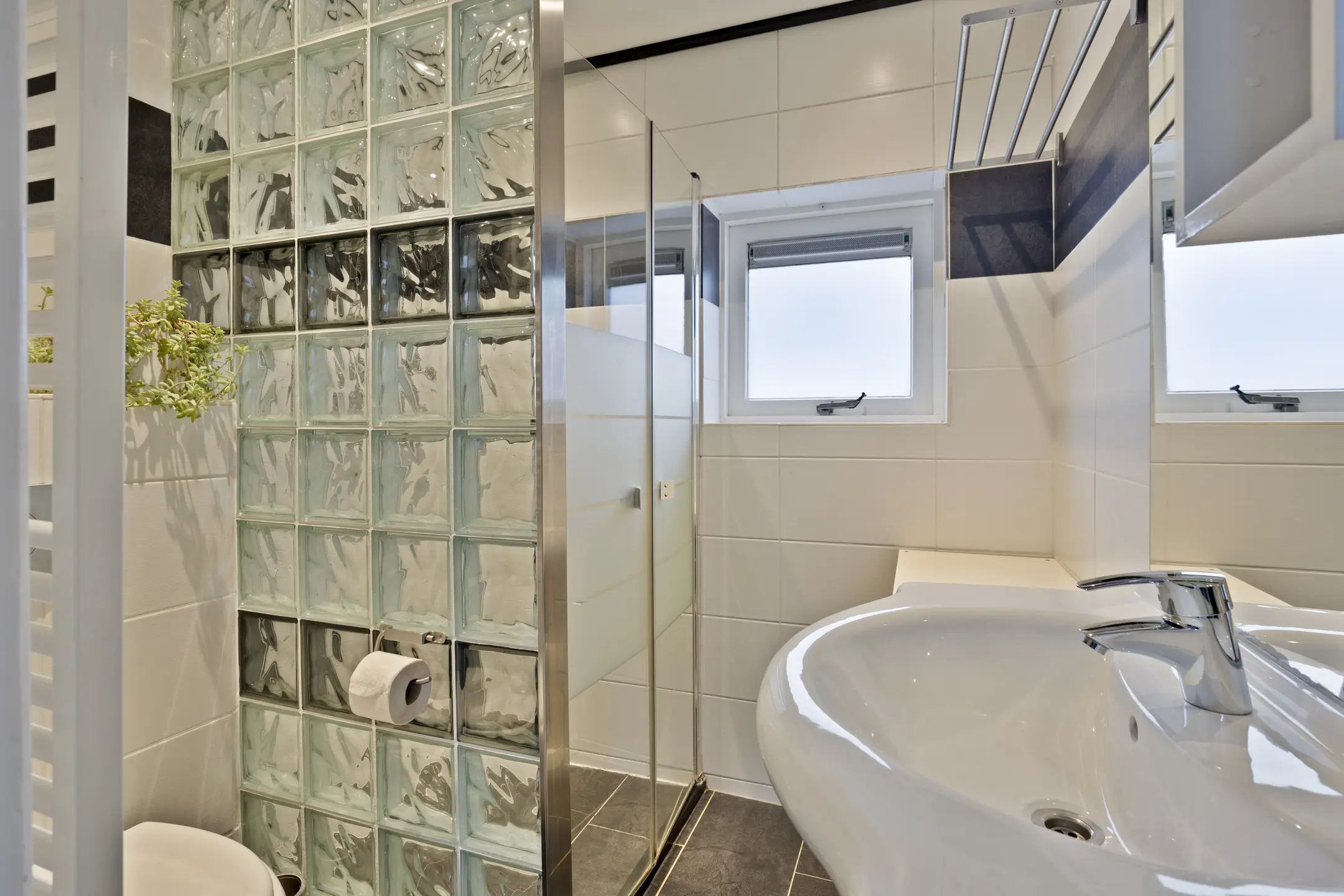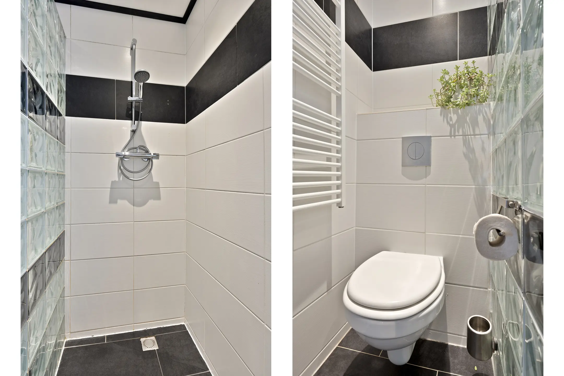 1e verdieping: 3 slaapkamers, overloop, badkamer met inloopdouche, badmeubel met wastafel en toilet.