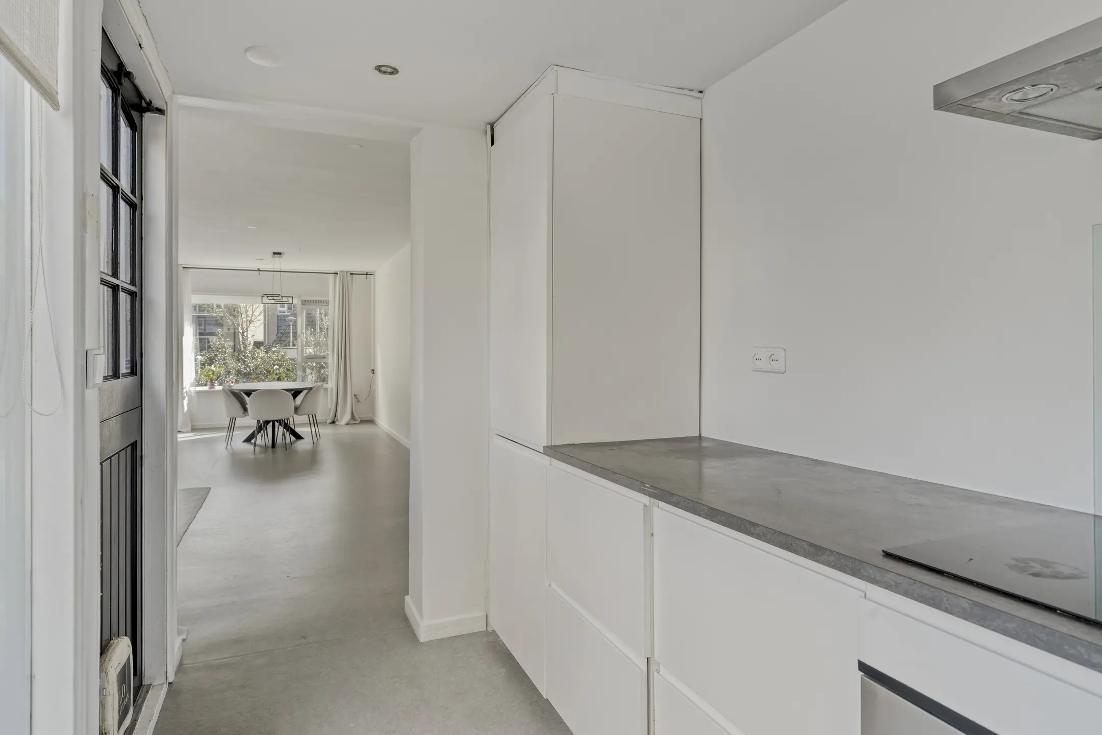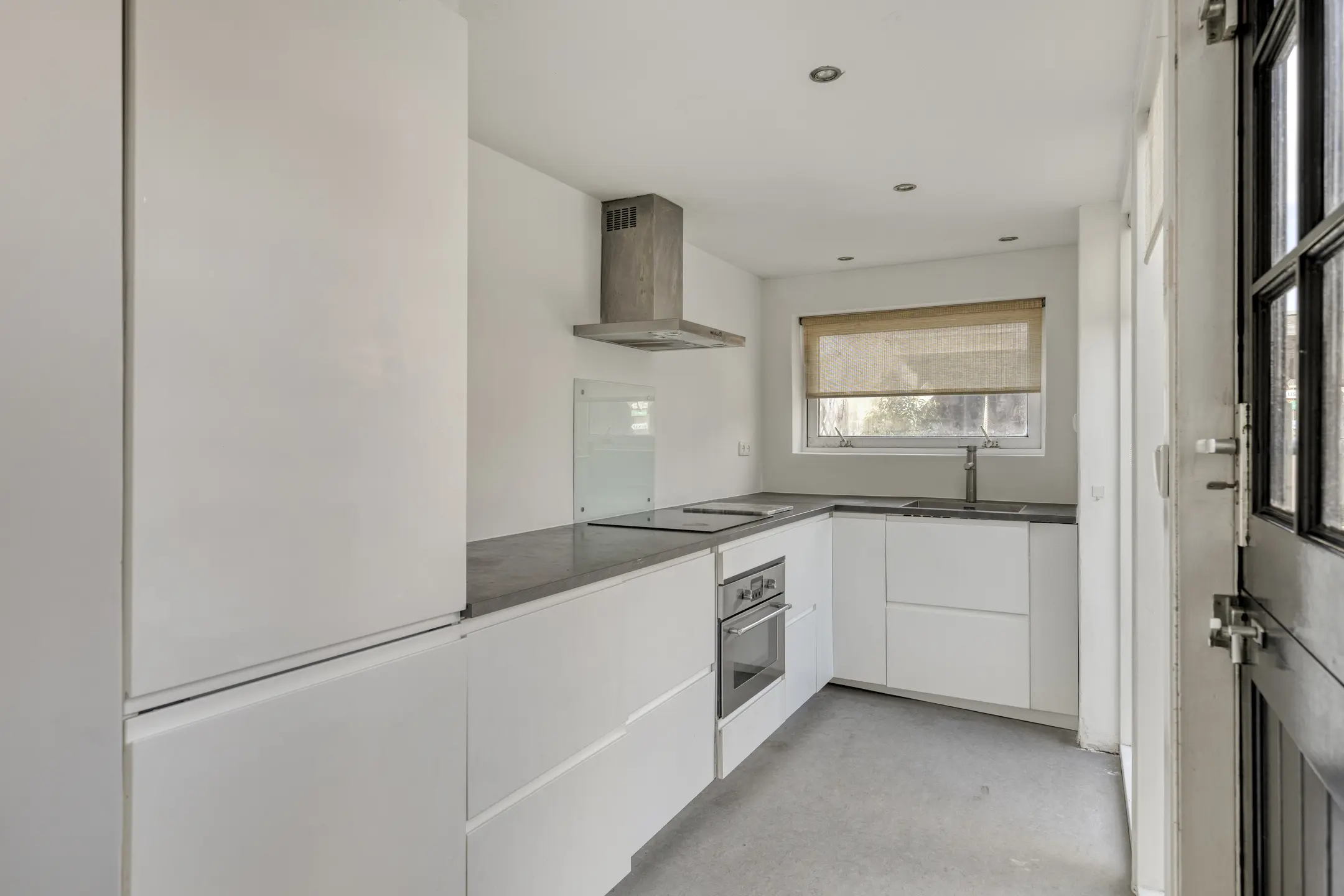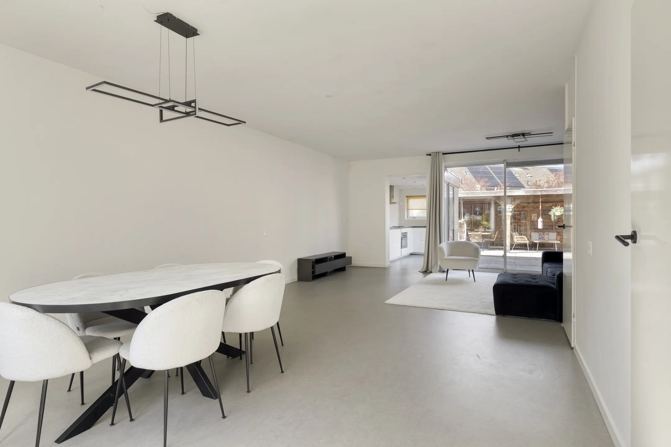 Woonkamer met royale zit- en eethoek, de moderne keuken met diverse inbouwapparatuur is gesitueerd in de aanbouw, hal/entree, tussenhal met toilet en opgang naar de verdieping.