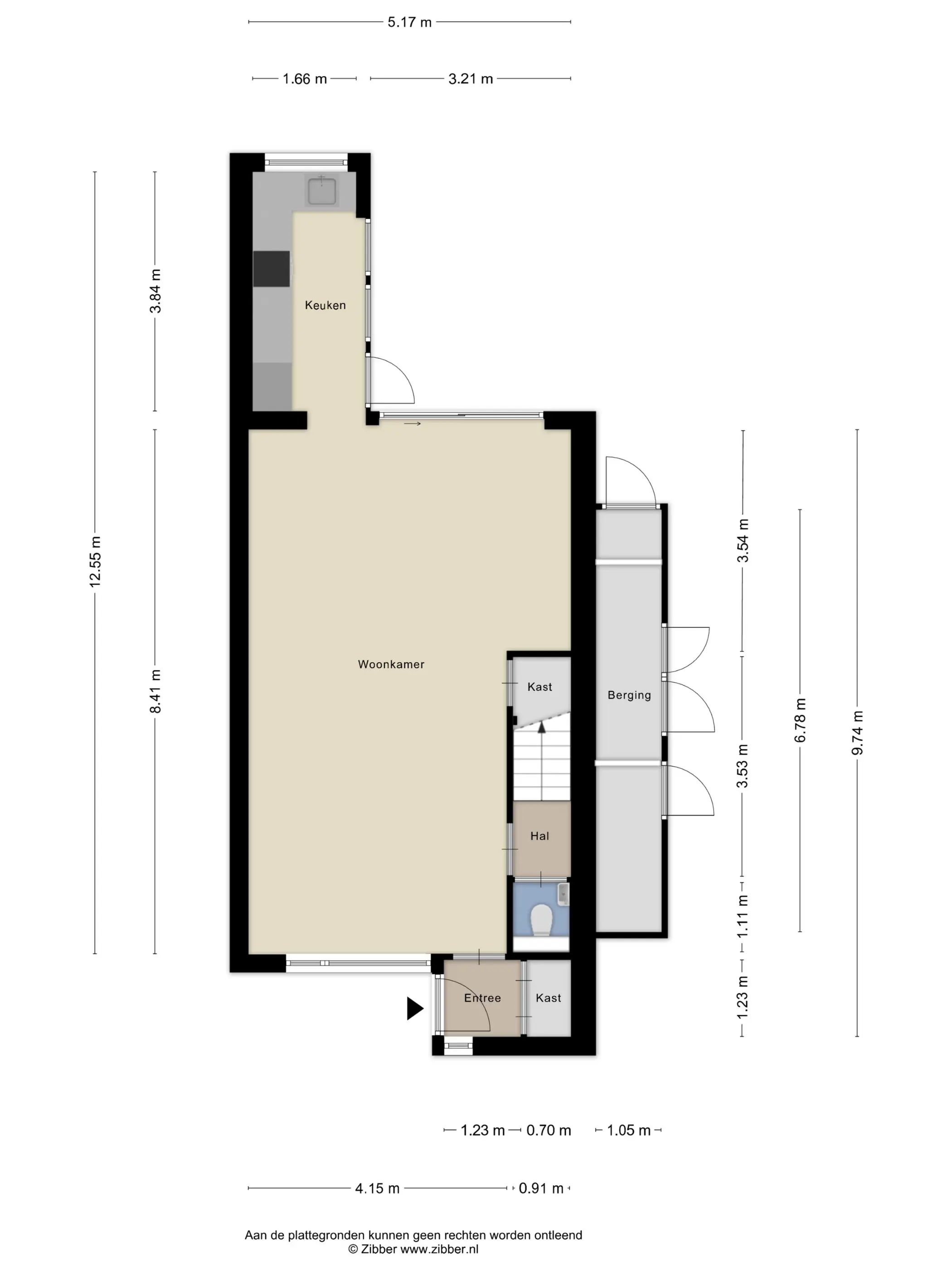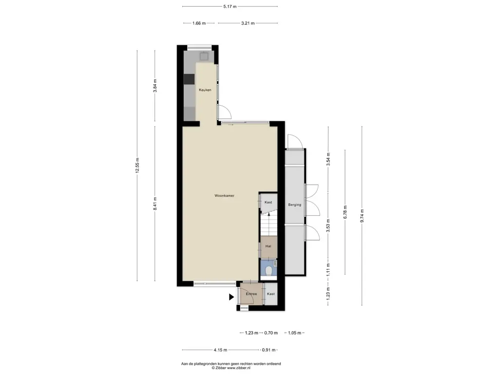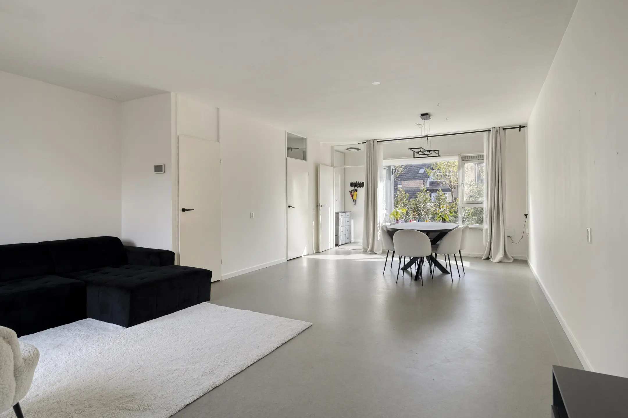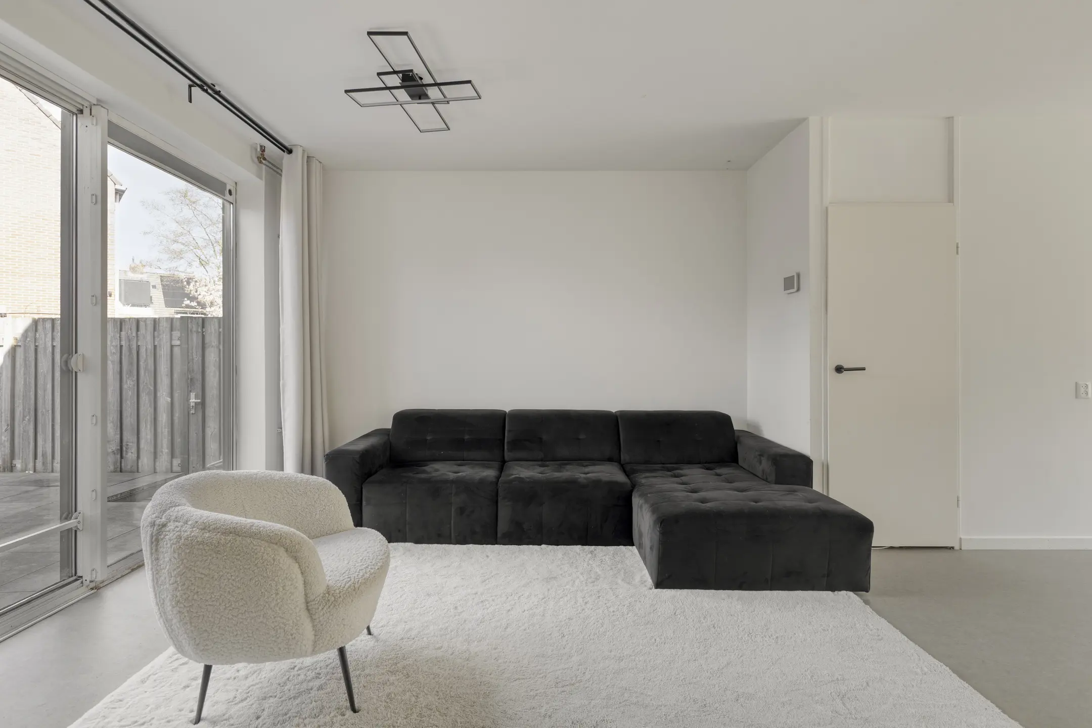 Woonkamer met royale zit- en eethoek, de moderne keuken met diverse inbouwapparatuur is gesitueerd in de aanbouw, hal/entree, tussenhal met toilet en opgang naar de verdieping.
