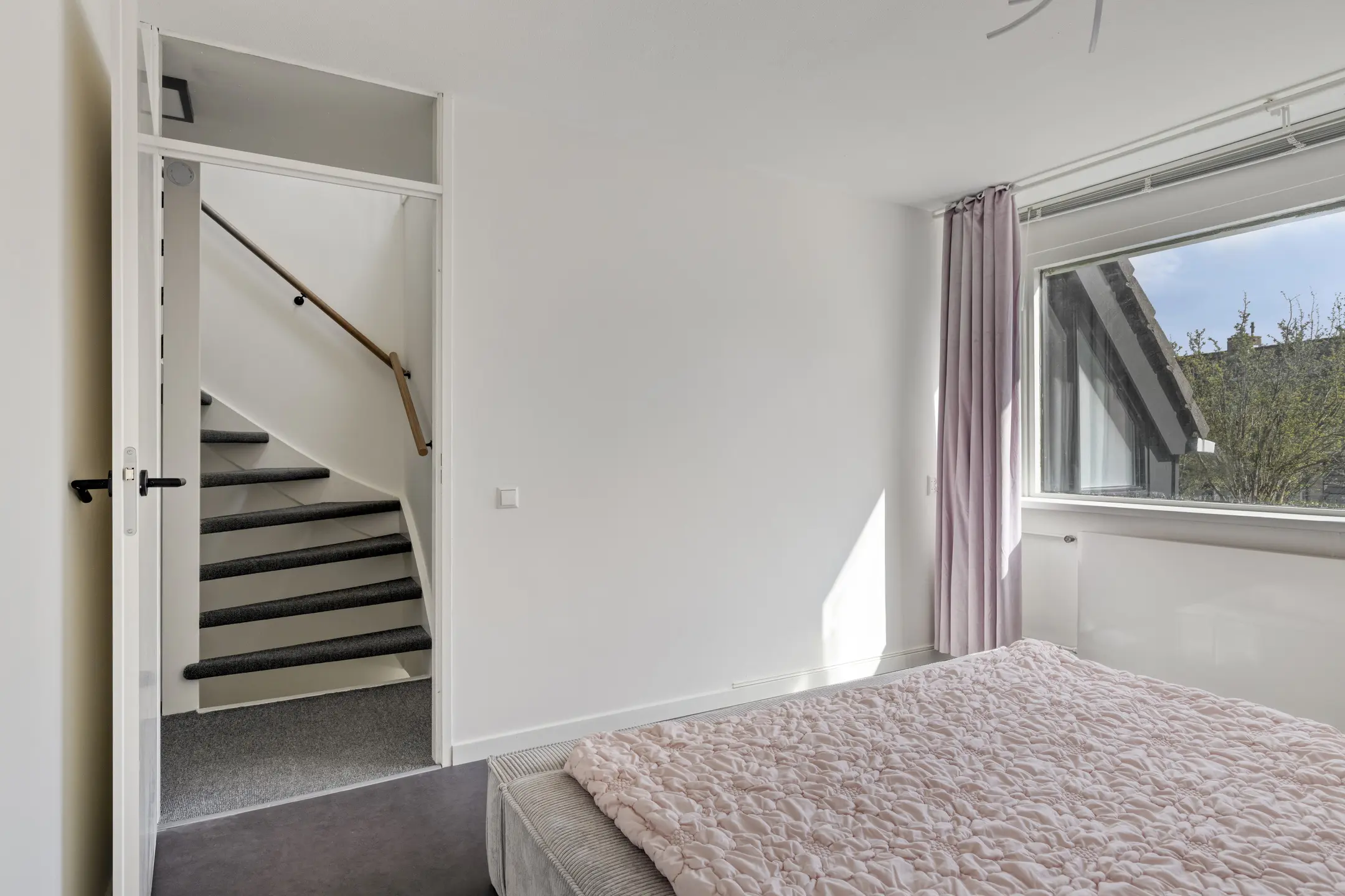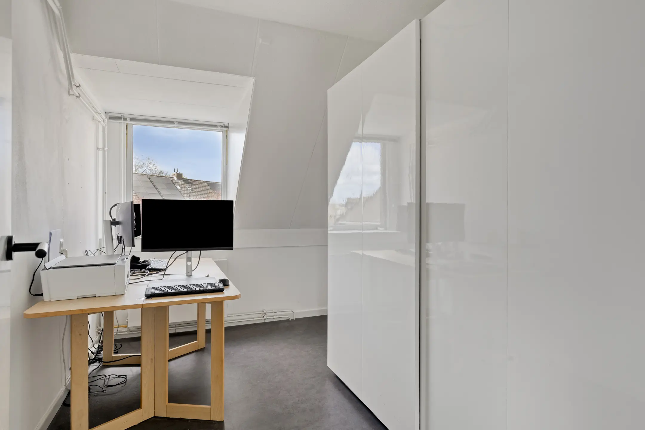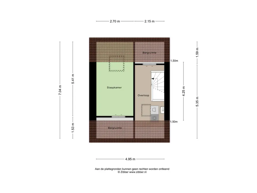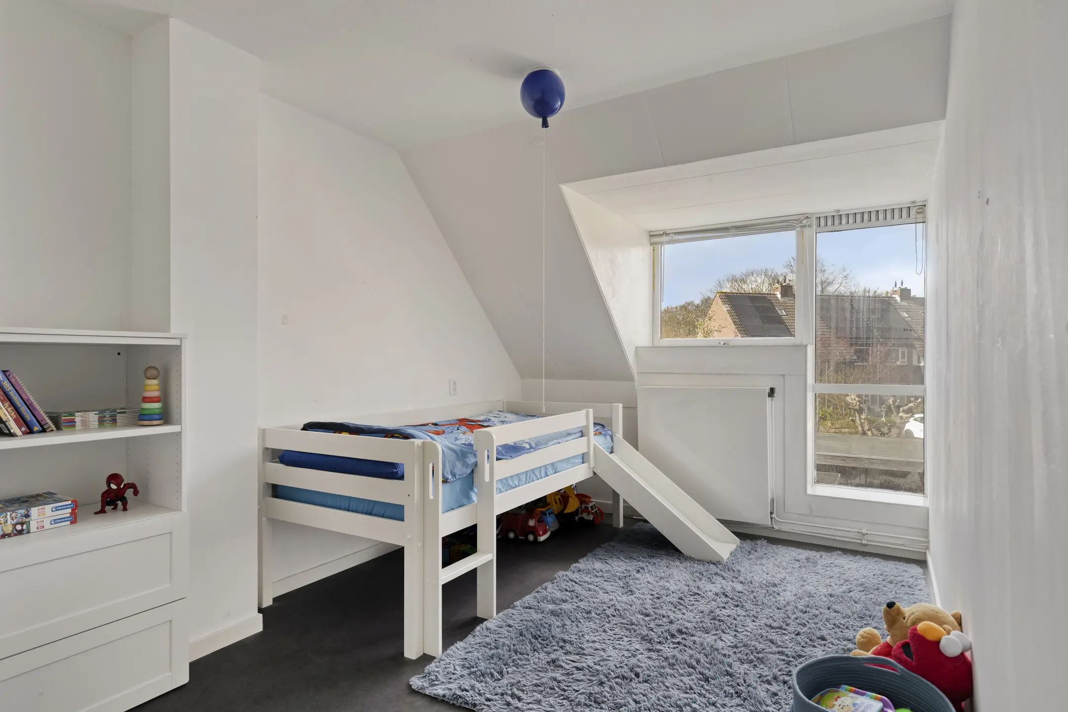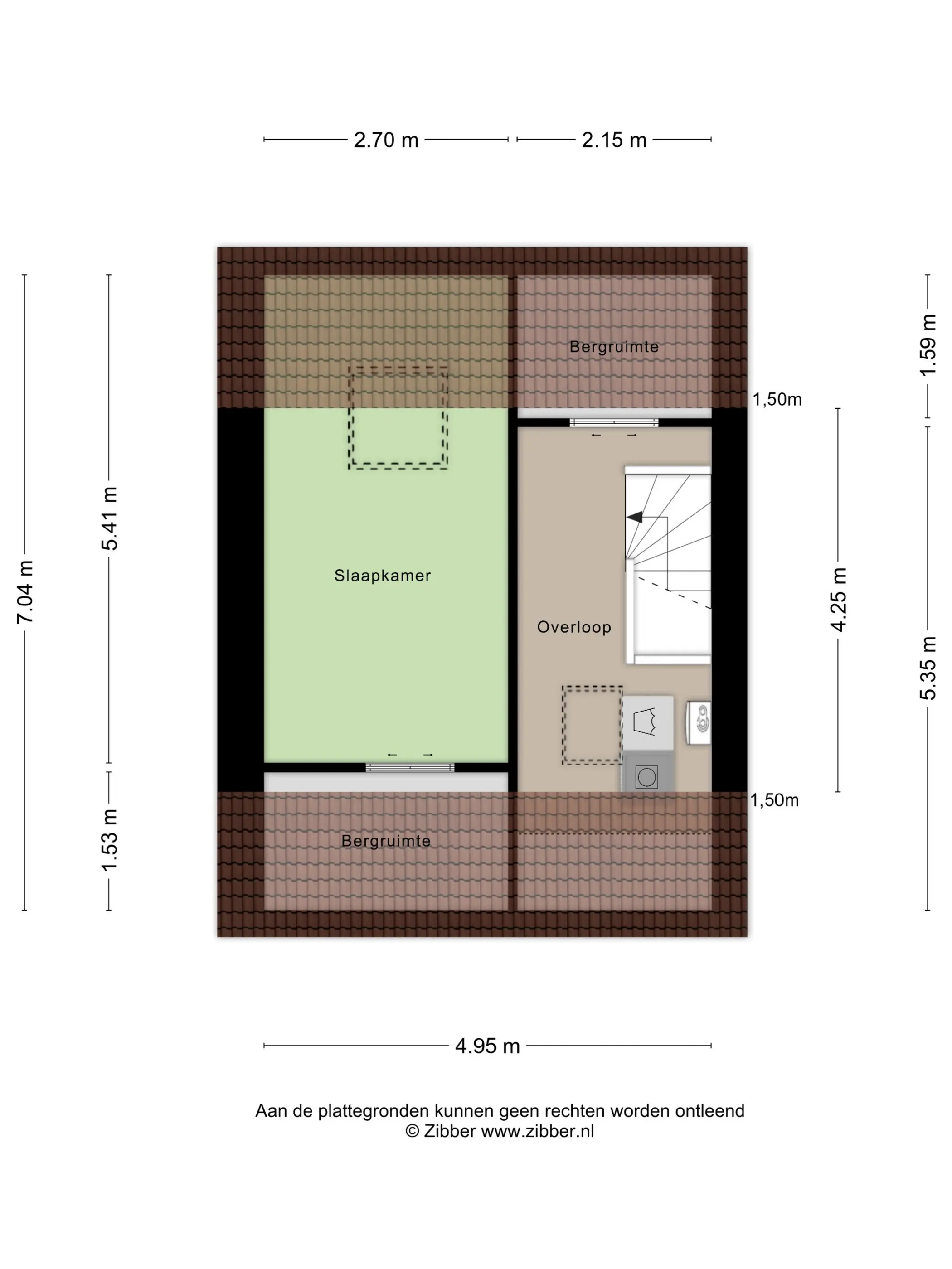 2e verdieping: zolder(slaap-)kamer met veluxraam, overloop met wasmachineaansluiting.
