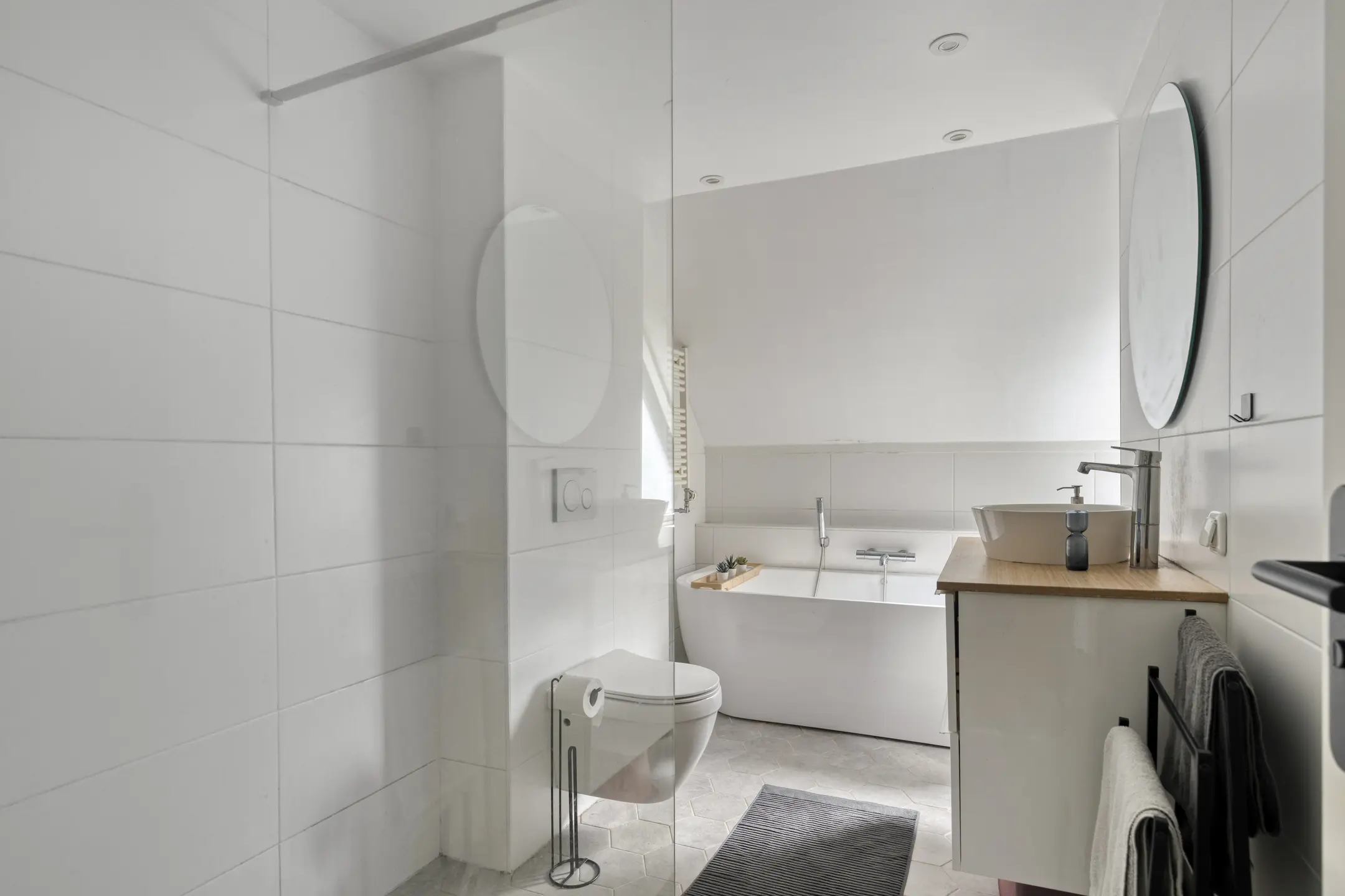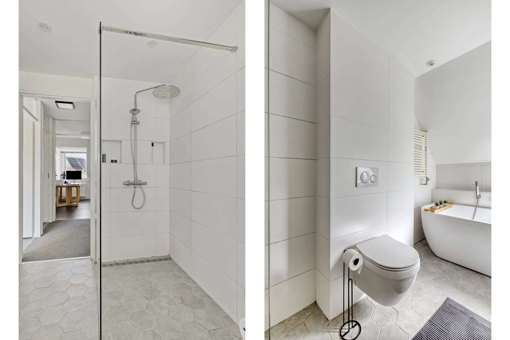 1e verdieping: 3 slaapkamers, overloop, fraaie luxe badkamer o.m. voorzien van design ligbad, inloopdouche, badmeubel met wastafel en toilet.