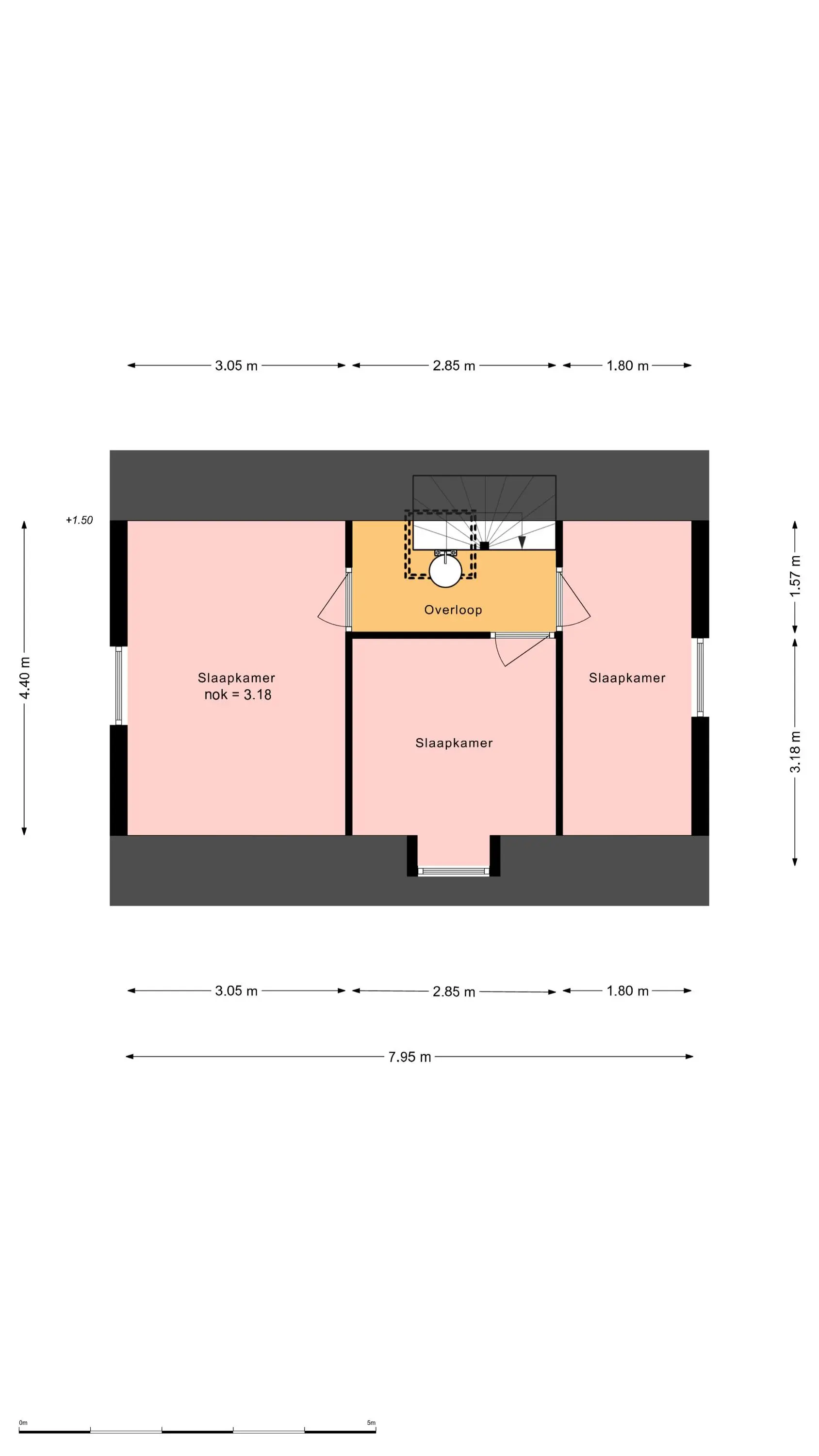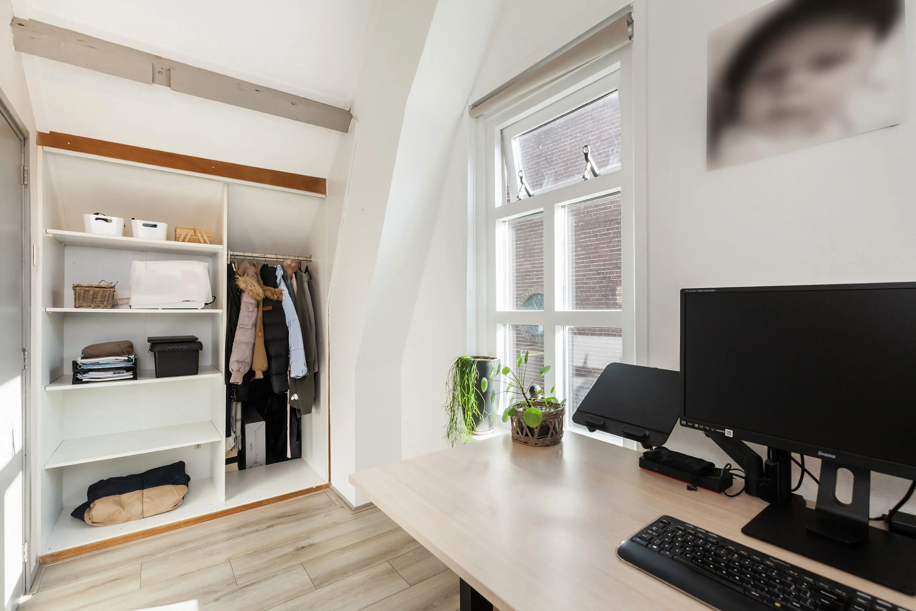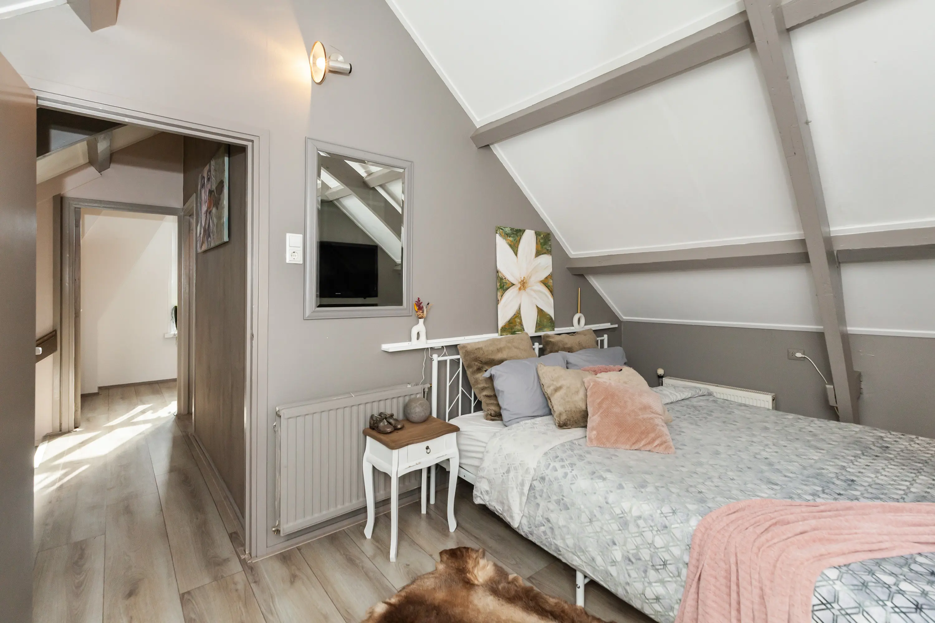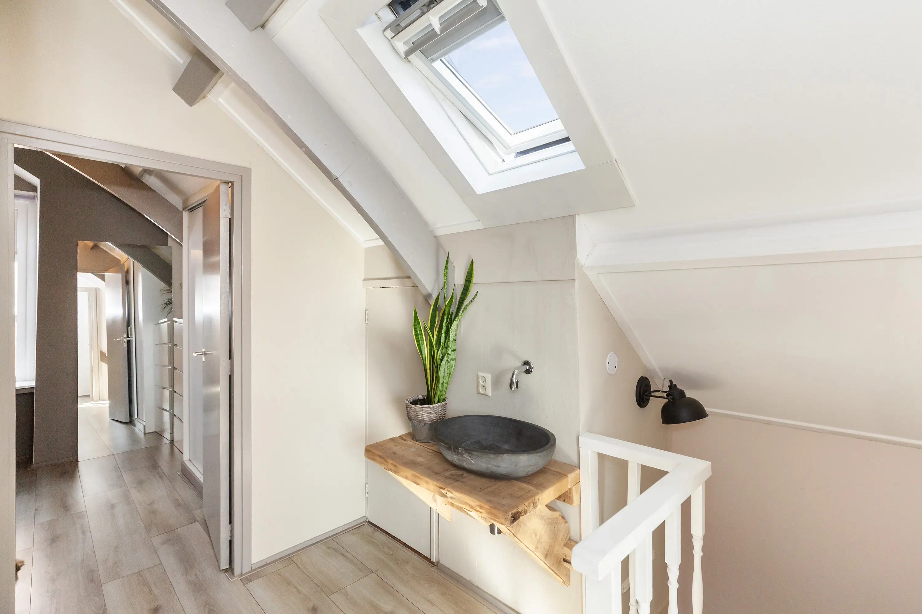 1e verdieping: Overloop met bergkast en dakraam, 3 slaapkamers met laminaatvloer.