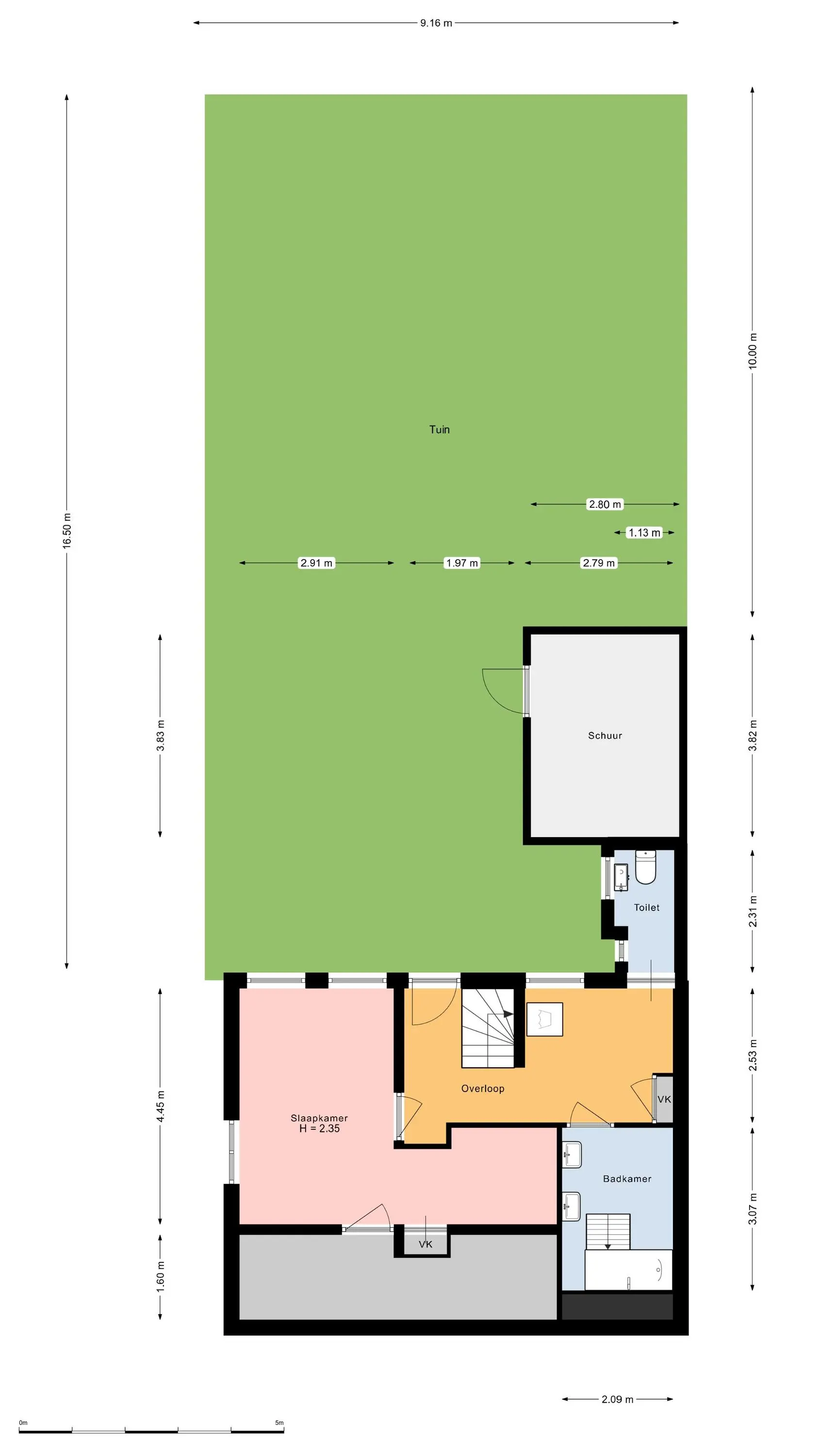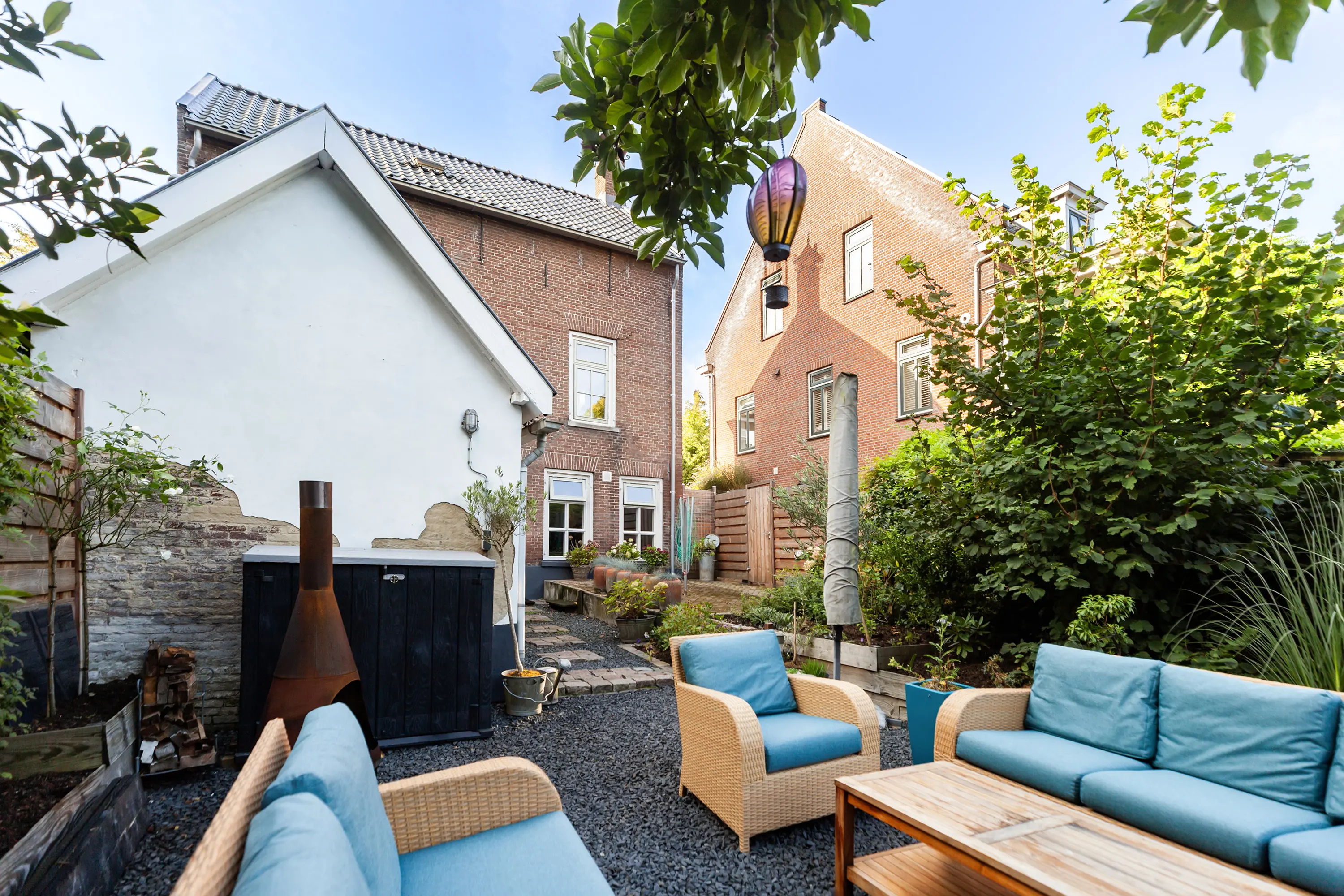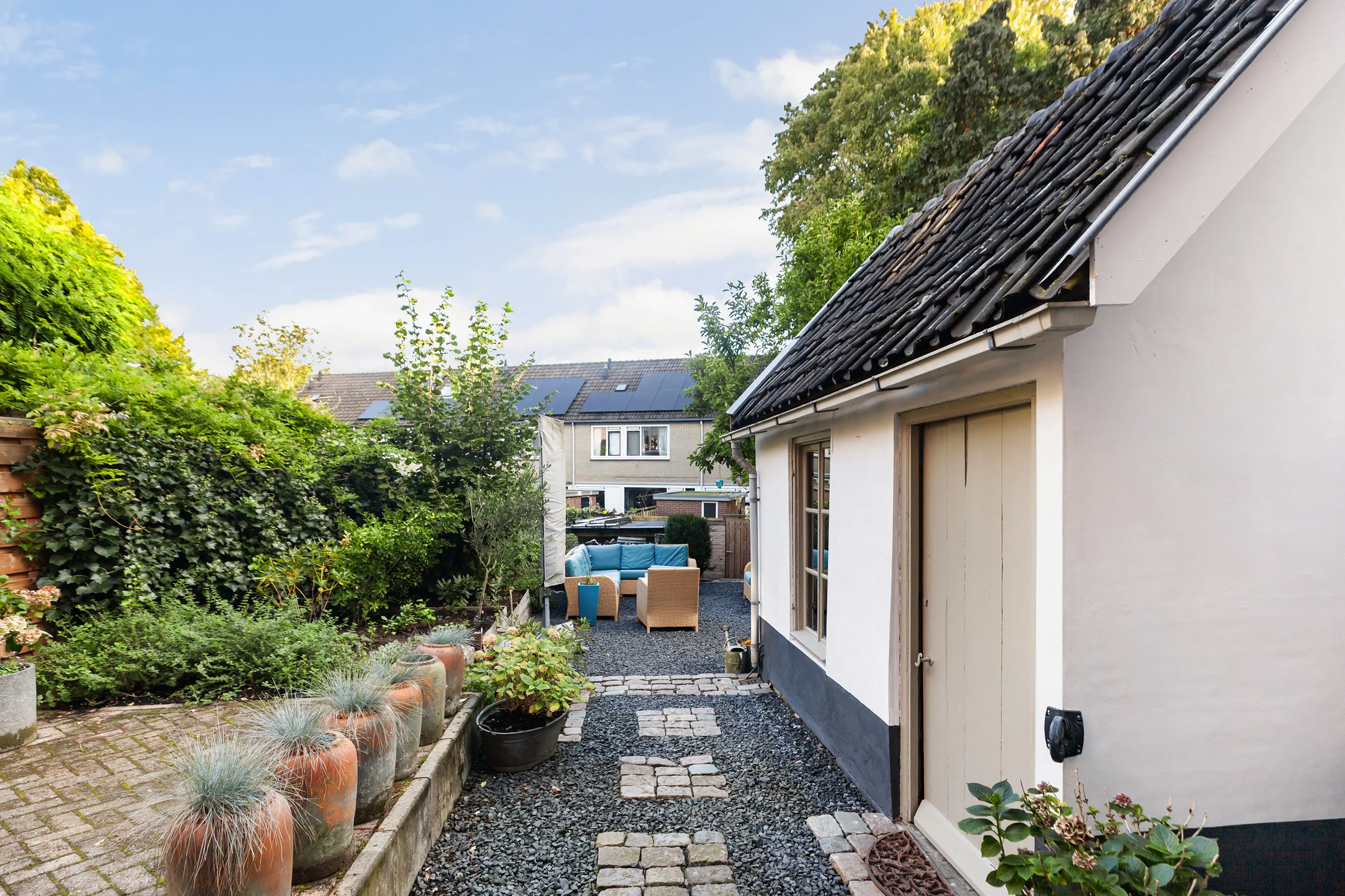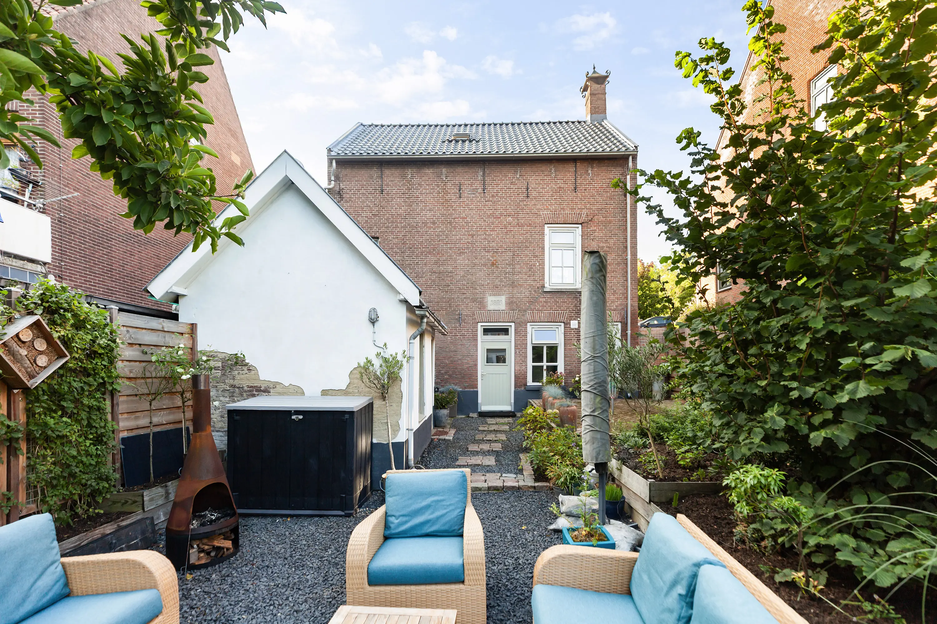 Tuin: Diepe achtertuin van ca. 160 m2 met stenen berging, overdekte fietsenstalling, achterom en zij-ingang d.m.v. 'recht van overpad'