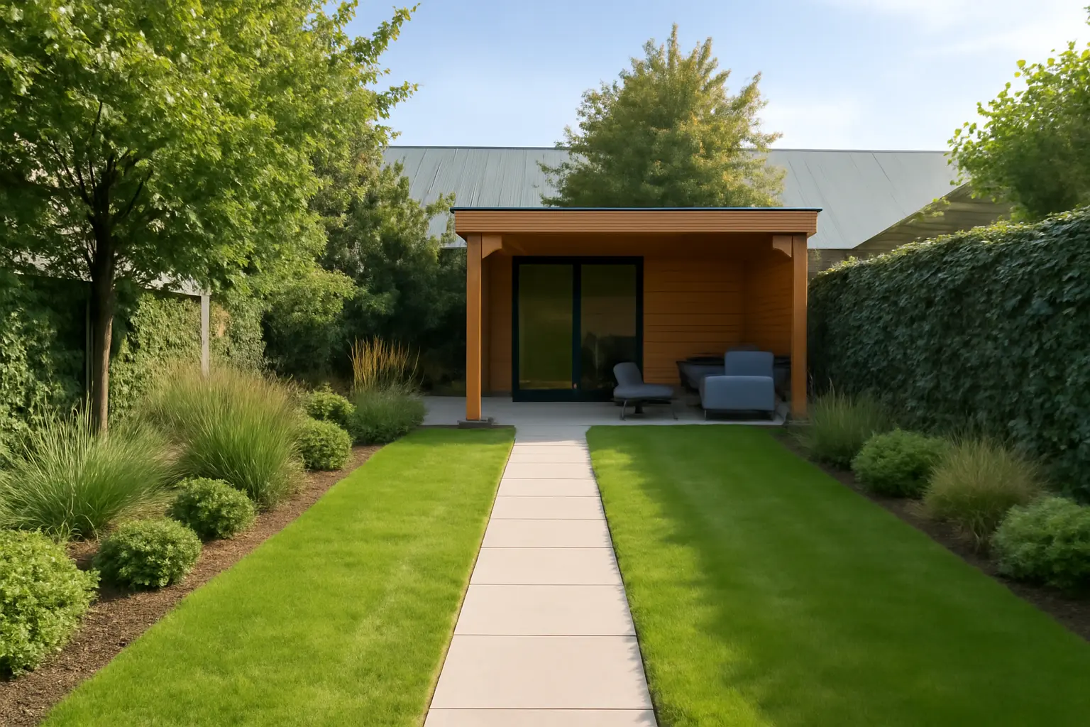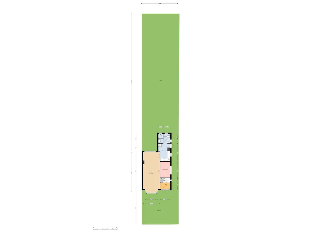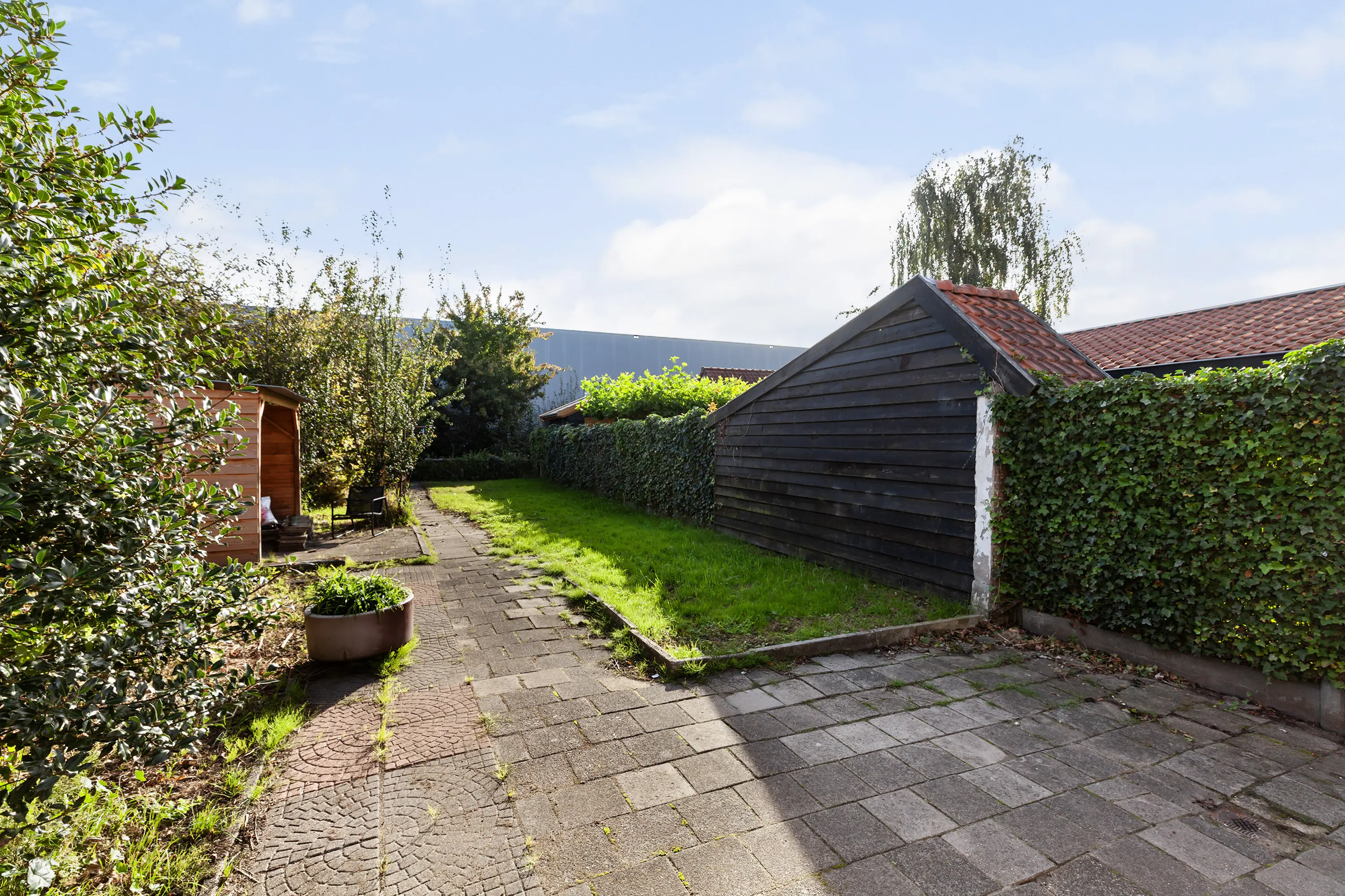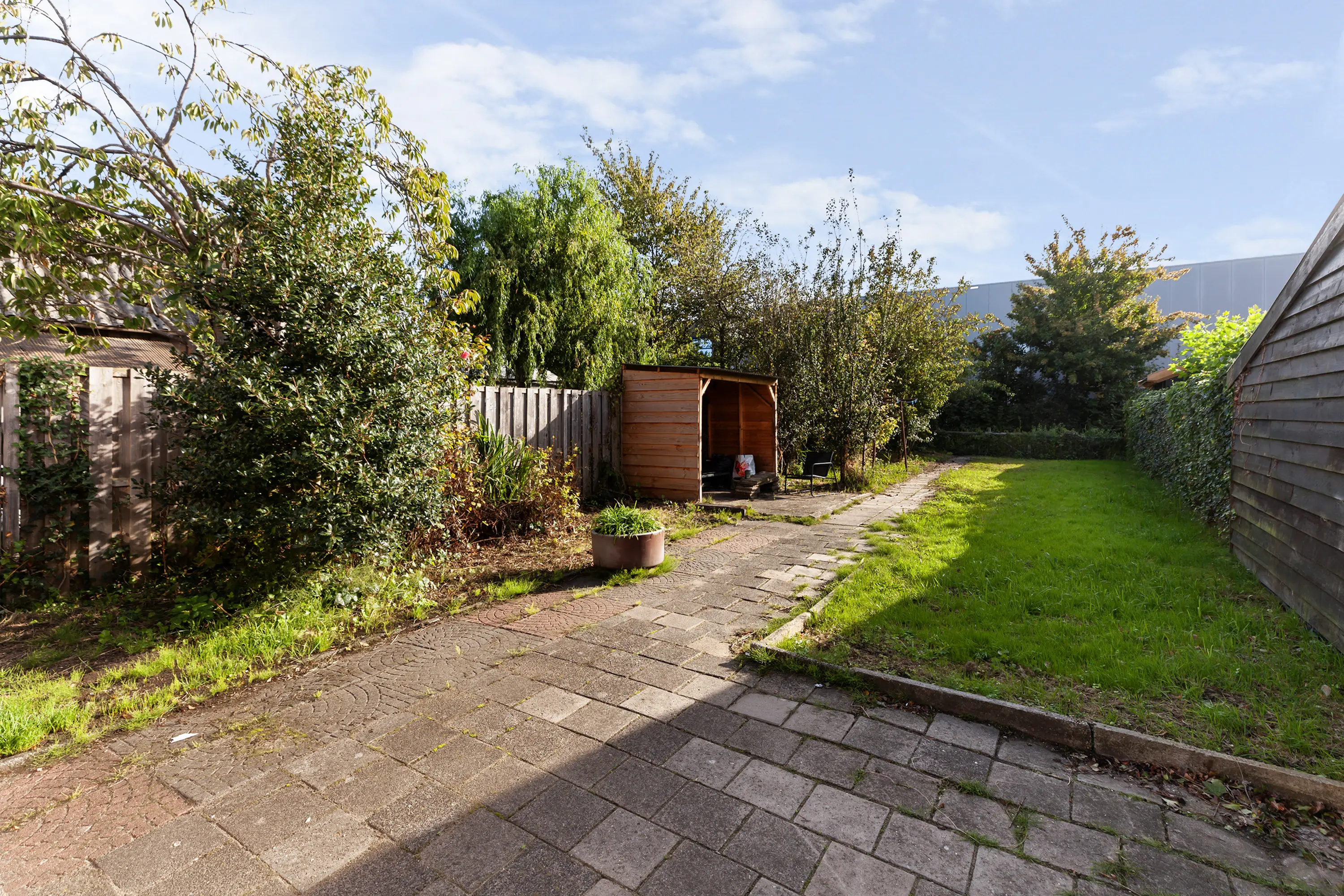Tuinen: voortuin op het Westen van ca.53m2, achtertuin op het Oosten van ca.210m2, zijpad ca.18m2.