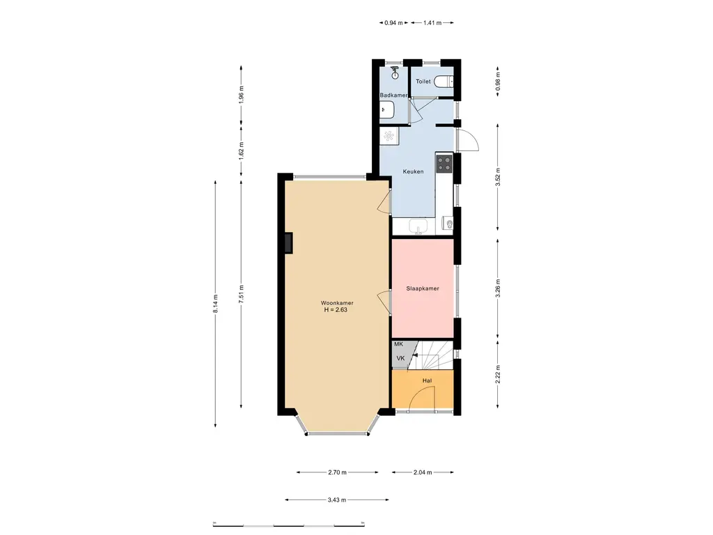 Begane grond: Entree, hal met meterkast en bergruimte, Woonkamer met erker en laminaat vloer, slaapkamer/kantoor, keuken met eigen ingang, badkamer met douche en wastafel en toilet.