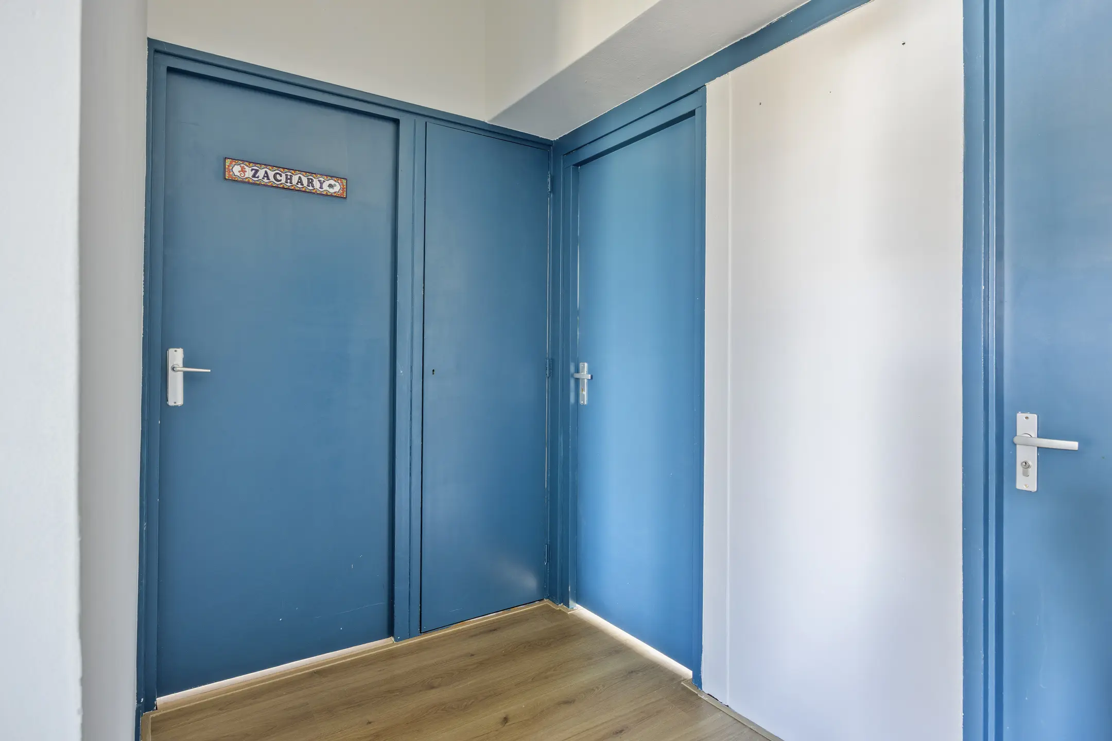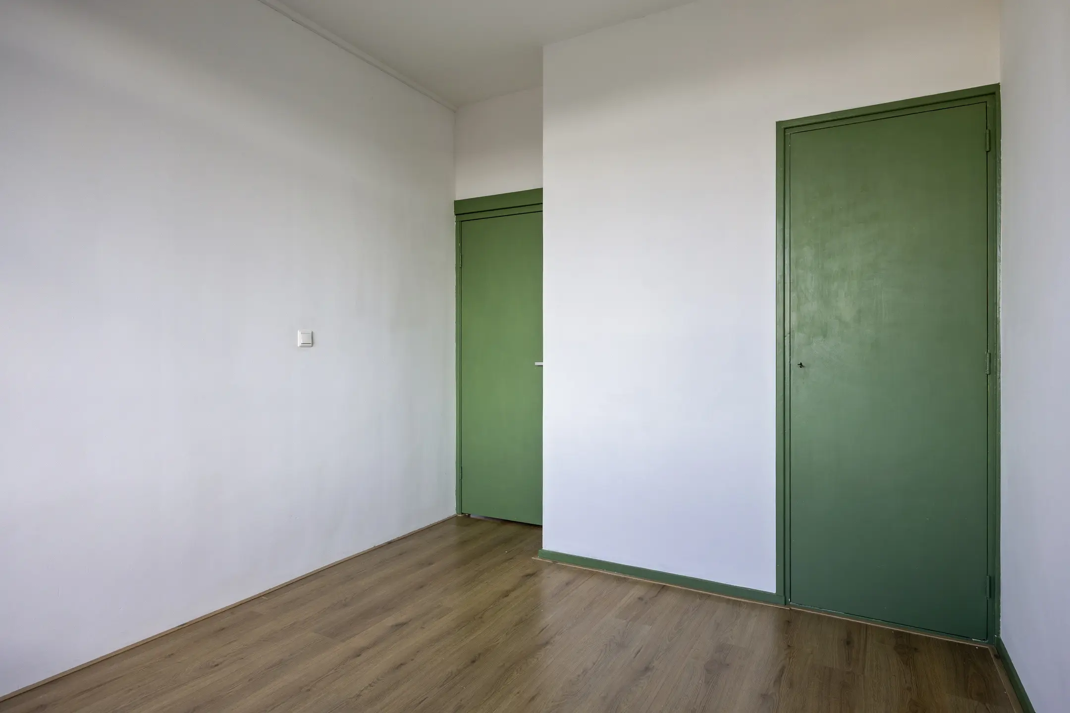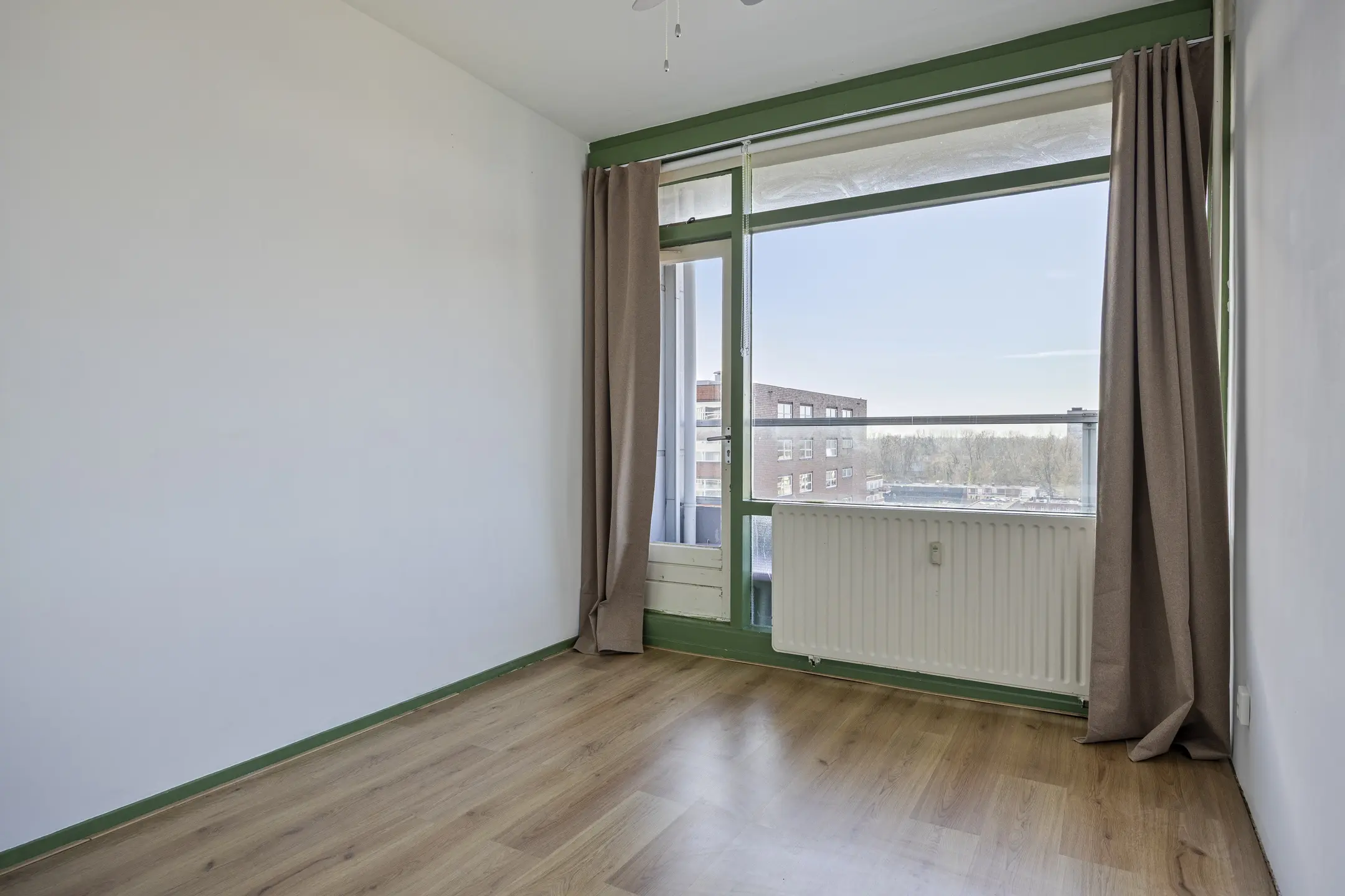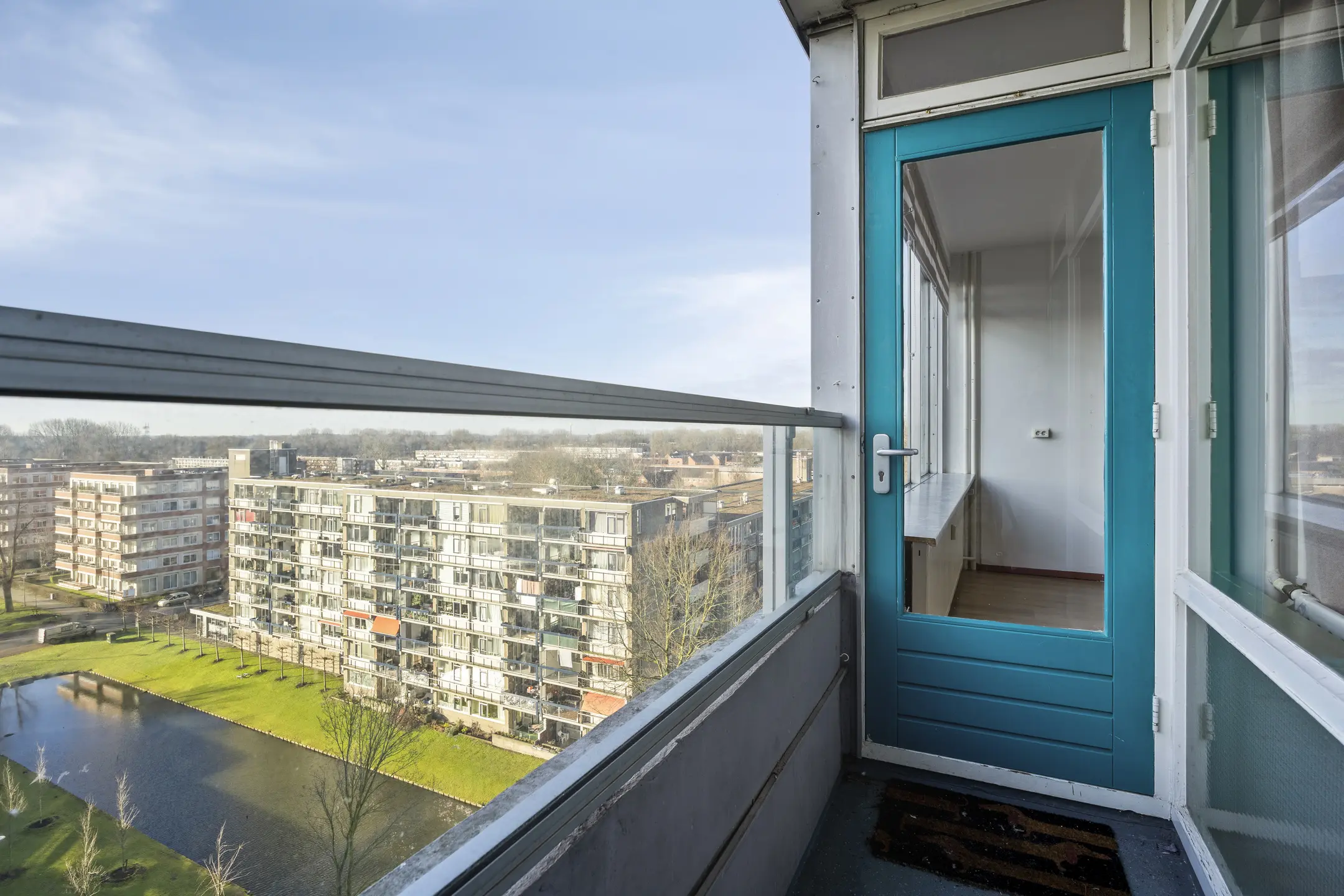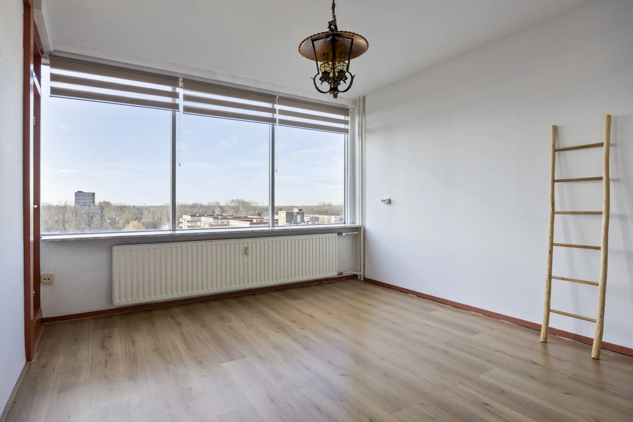 Negende verdieping: woningentree via de galerij; tochtportaal; hal voorzien van laminaatvloer, meterkast, vaste kast en toegang tot verschillende vertrekken. Toiletruimte voorzien van betegeling, closet en fonteintje. Doorgebroken woonkamer aan de achterzijde met laminaatvloer, vaste kast en toegang tot balkon. Inpandig balkon op het zuiden. Slaapkamer I aan de achterzijde voorzien van laminaatvloer en inbouwkast. Slaapkamer I aan de galerijzijde voorzien van laminaatvloer en dubbele inbouwkast. Slaapkamer II aan de galerijzijde voorzien van laminaatvloer en inbouwkast. Keukenruimte voorzien van functionele keukenblok met gaskookplaat en de opstelling van de boiler. Badkamer voorzien van betegeling, wastafelmeubel, doucheruimte, wasmachineaansluiting en opstelling voor de boiler.